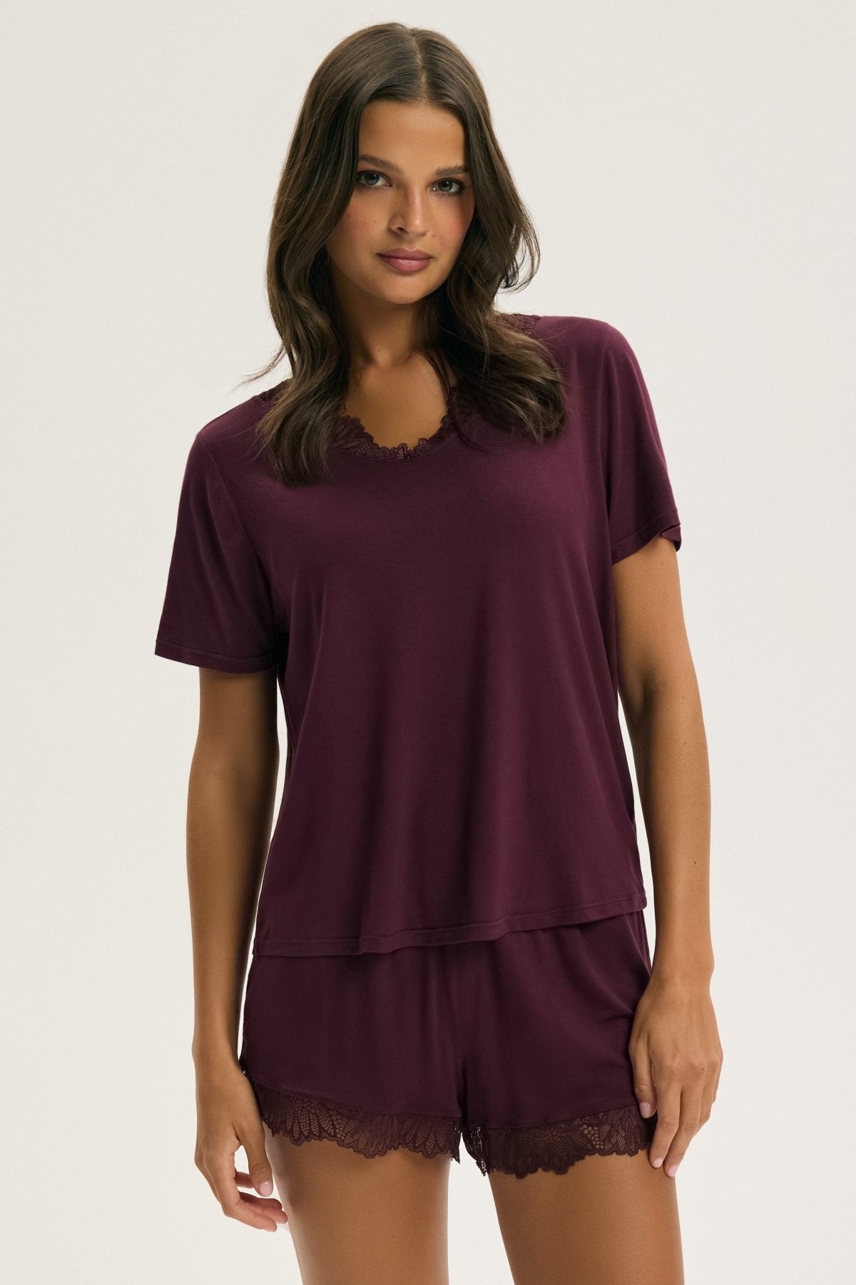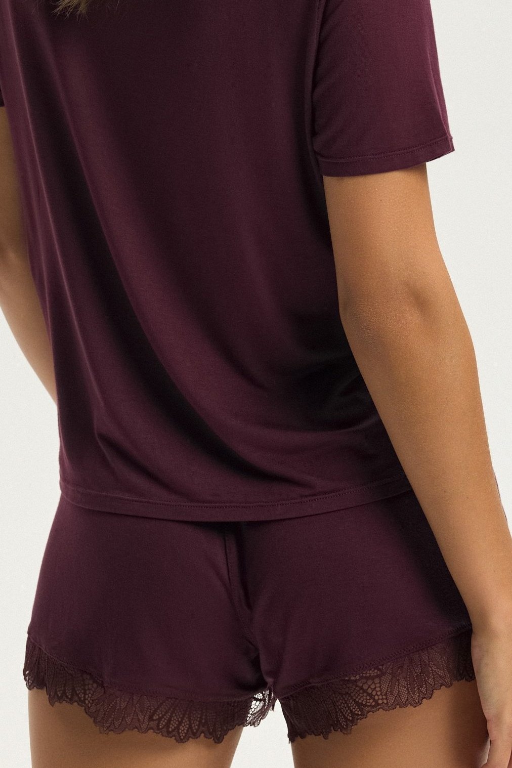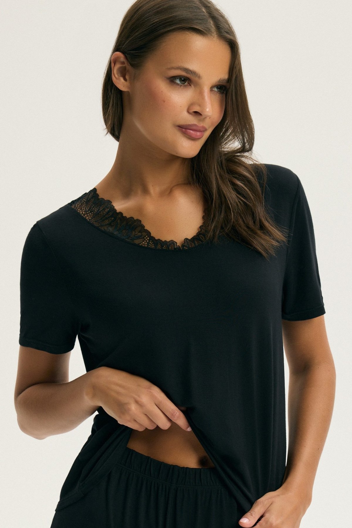 Horní díl s krátkým rukávem a volnějším střihem je doplněn decentní krajkou v dekoltu. Krátké šortky s krajkovým lemem zaručují volnost pohybu a pohodlí během spánku i domácího relaxu. V pase je samozřejmostí pohodlná pružná guma. Pyžamo Canti je ideální pro ženy, které chtějí v noci vypadat stylově, cítit se pohodlně a vychutnat si každý okamžik klidu a pohody.