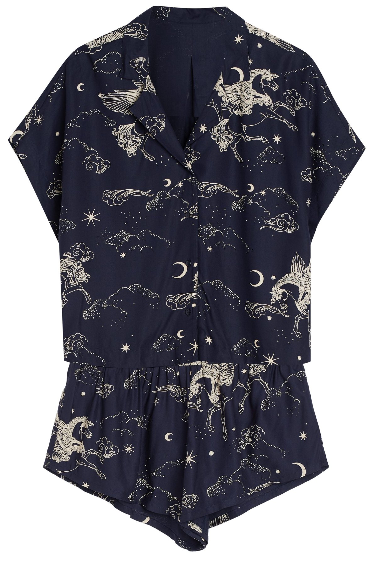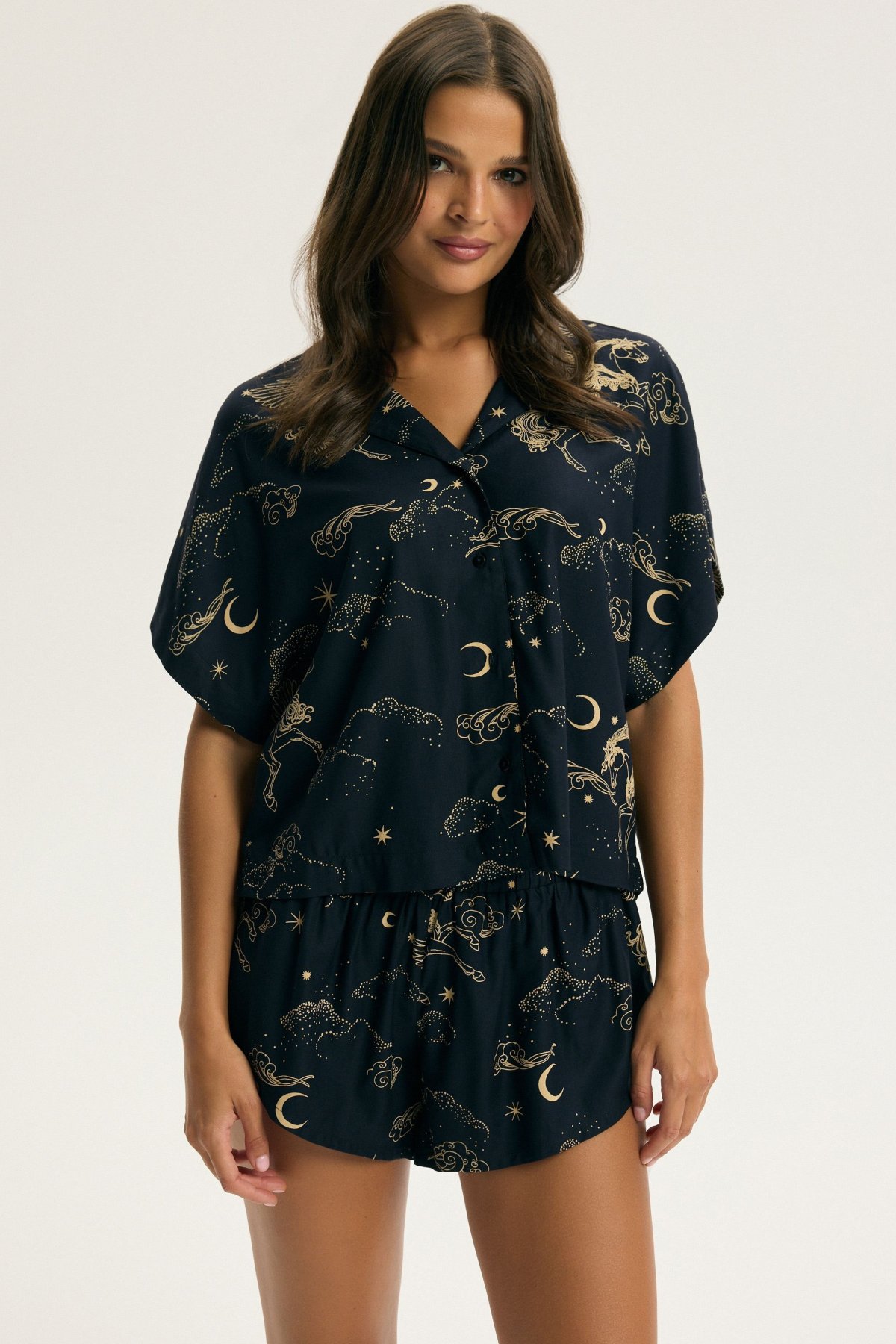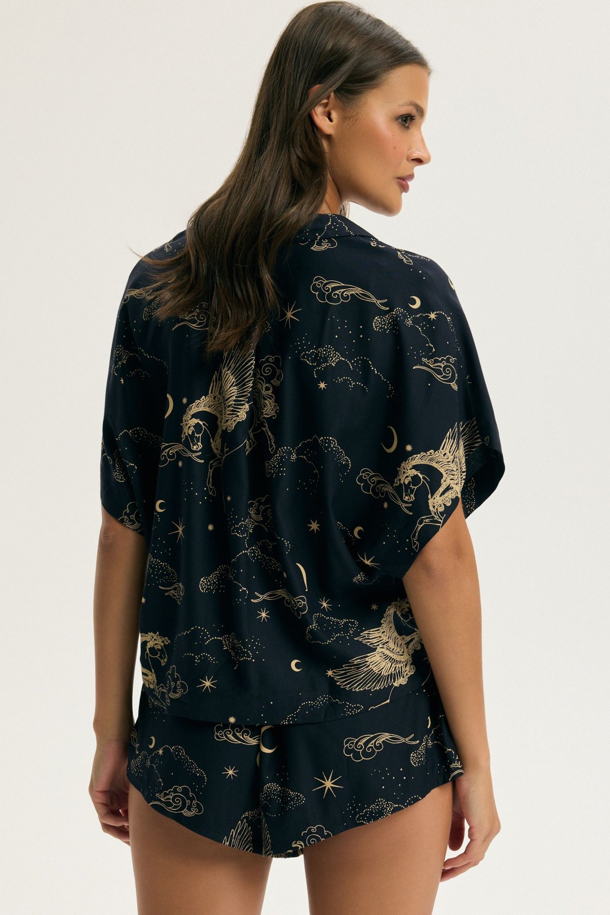 Dámské pyžamo Crispella představuje spojení elegance, pohodlí a jedinečného designu. Je vyrobeno z měkké viskózy s jemným leskem, která příjemně chladí pokožku a zajišťuje komfort po celou noc. Volná košile s krátkým rukávem a klasickým límečkem volně splývá přes boky, zatímco lehké šortky s pružným pasem poskytují naprostou volnost pohybu. Na tmavě modrém podkladu září zlaté motivy pegasů, hvězd a měsíců, které dodávají modelu kouzelný, noční charakter. Pyžamo Crispella je ideální pro ženy, které chtějí cítit jemnost, lehkost a eleganci i v okamžicích odpočinku.