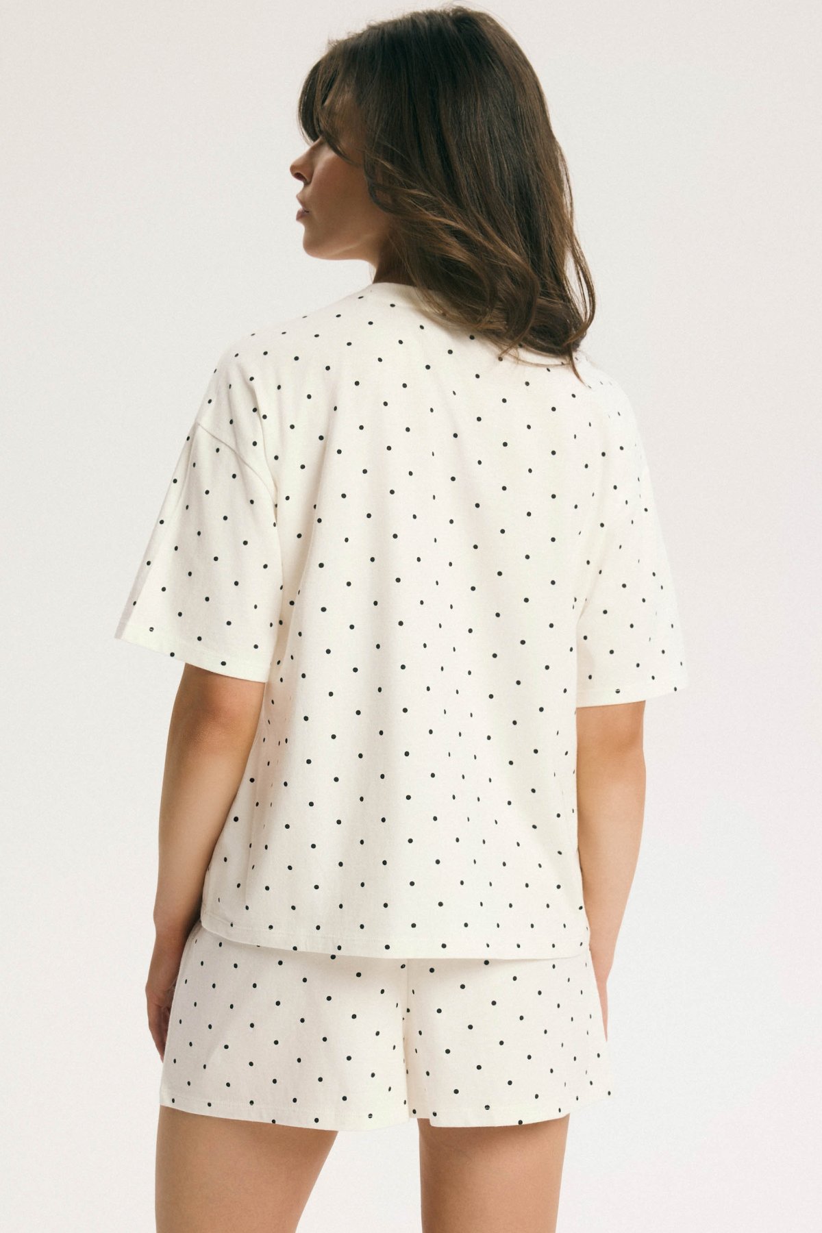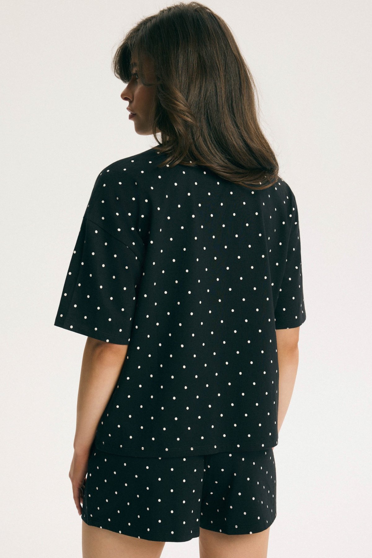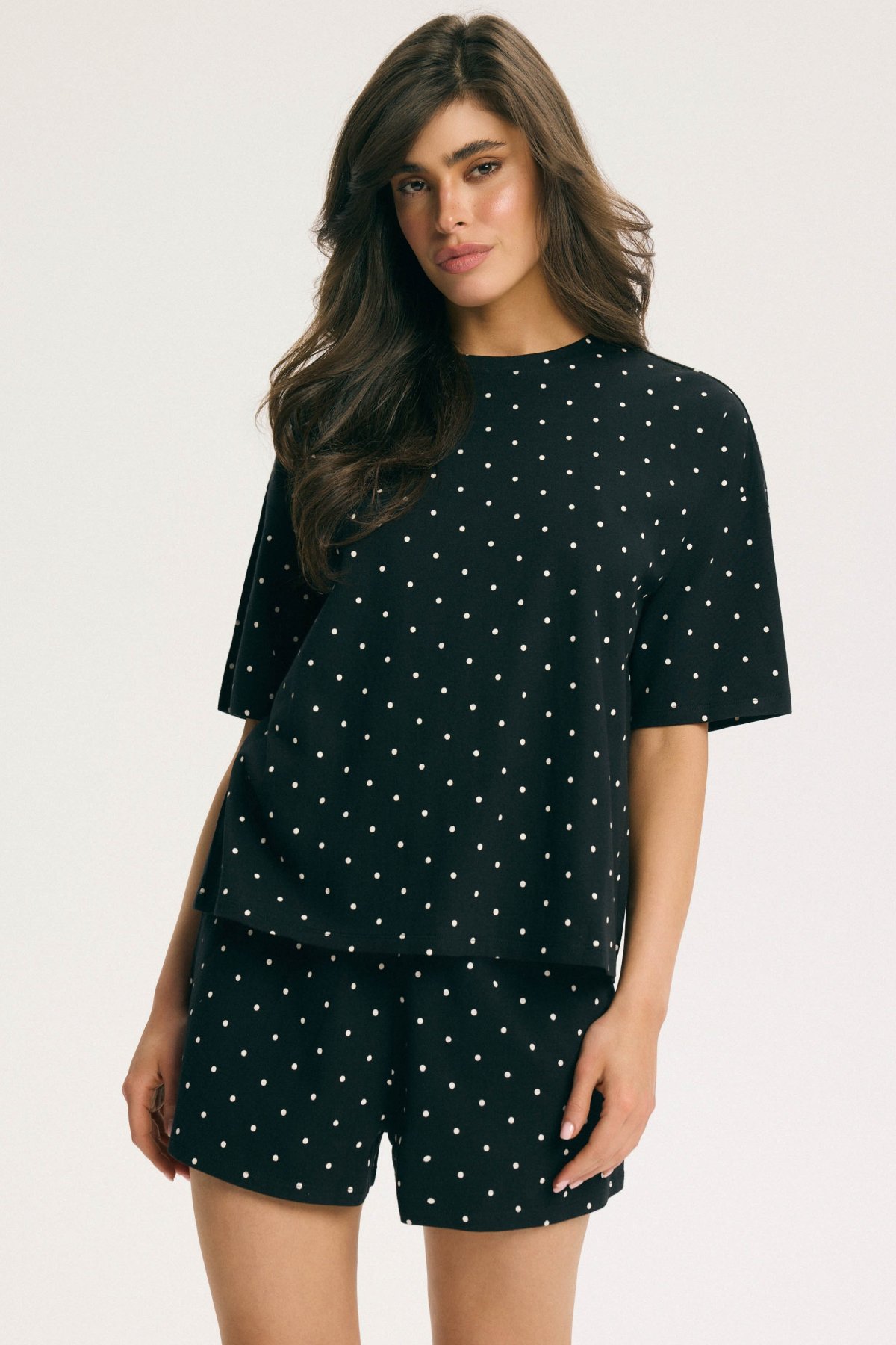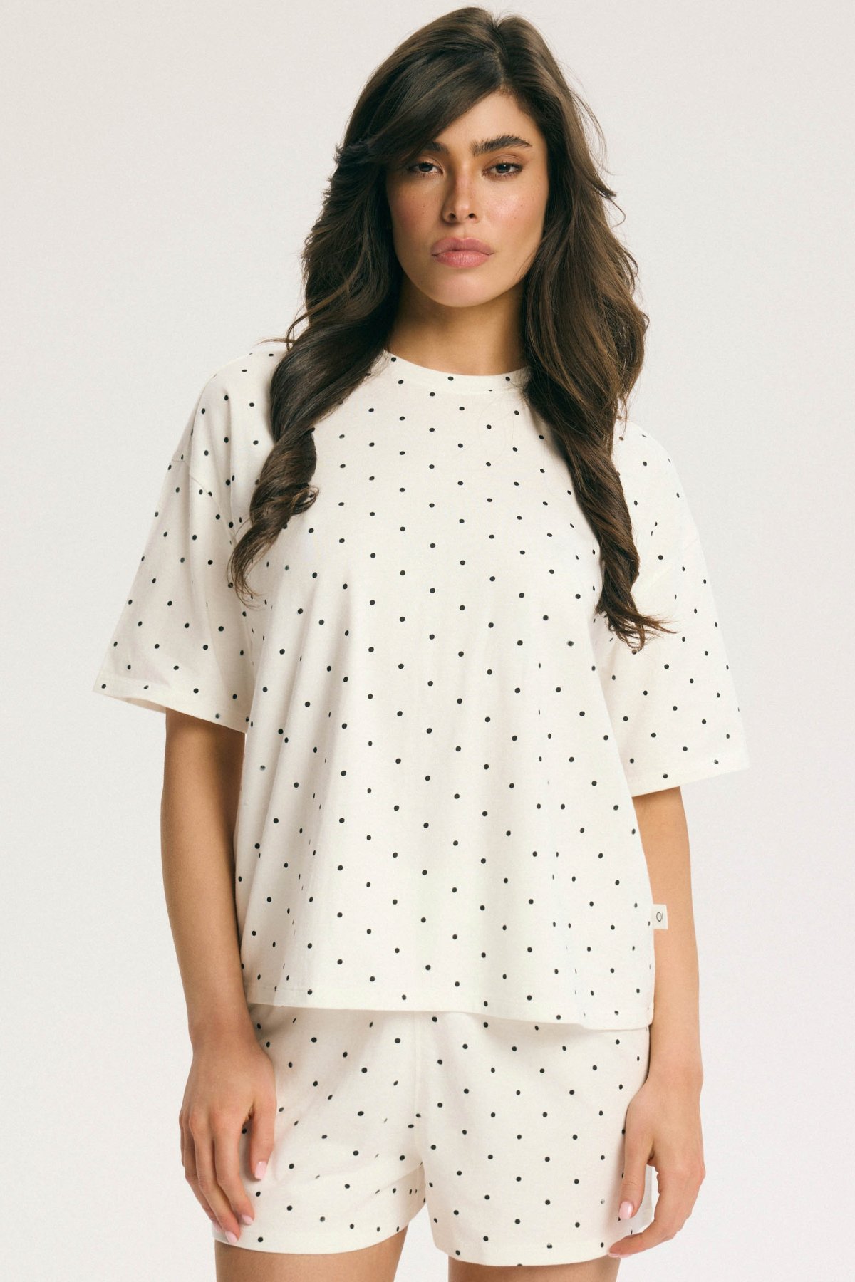 Tričko s jednoduchým střihem se příjemně přizpůsobí postavě a spolu s krátkými šortkami vytváří uvolněný, harmonický celek. Materiál s podílem bavlny a viskózy je měkký na dotek a příjemný při nošení. Volnější střih podporuje pohodlí bez zbytečného obepínání, zatímco šortky s elastickým pasem dobře sedí a neomezují v pohybu. Jemný pravidelný vzor dodává modelu decentní detail a podtrhuje jeho klidný, čistý vzhled.