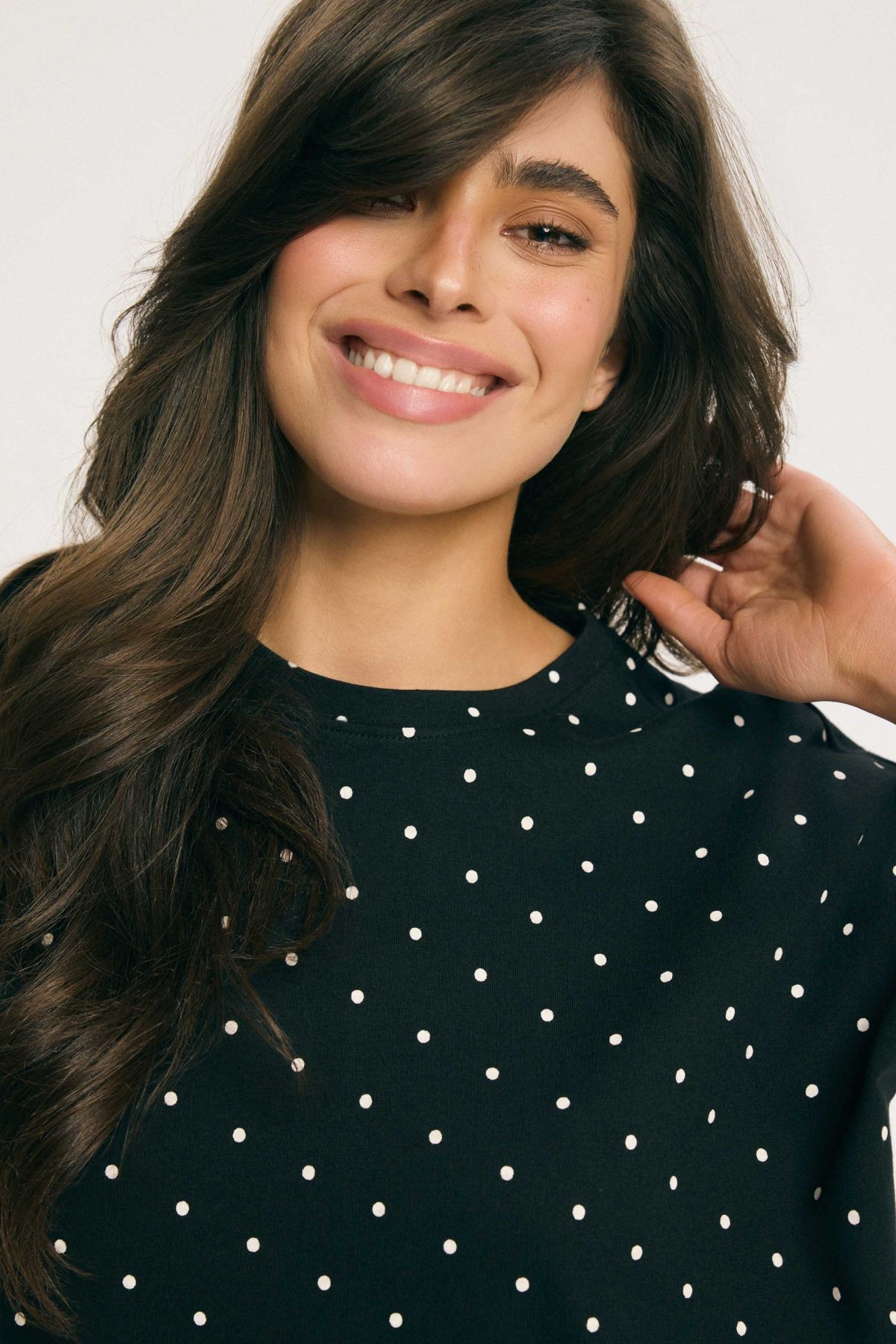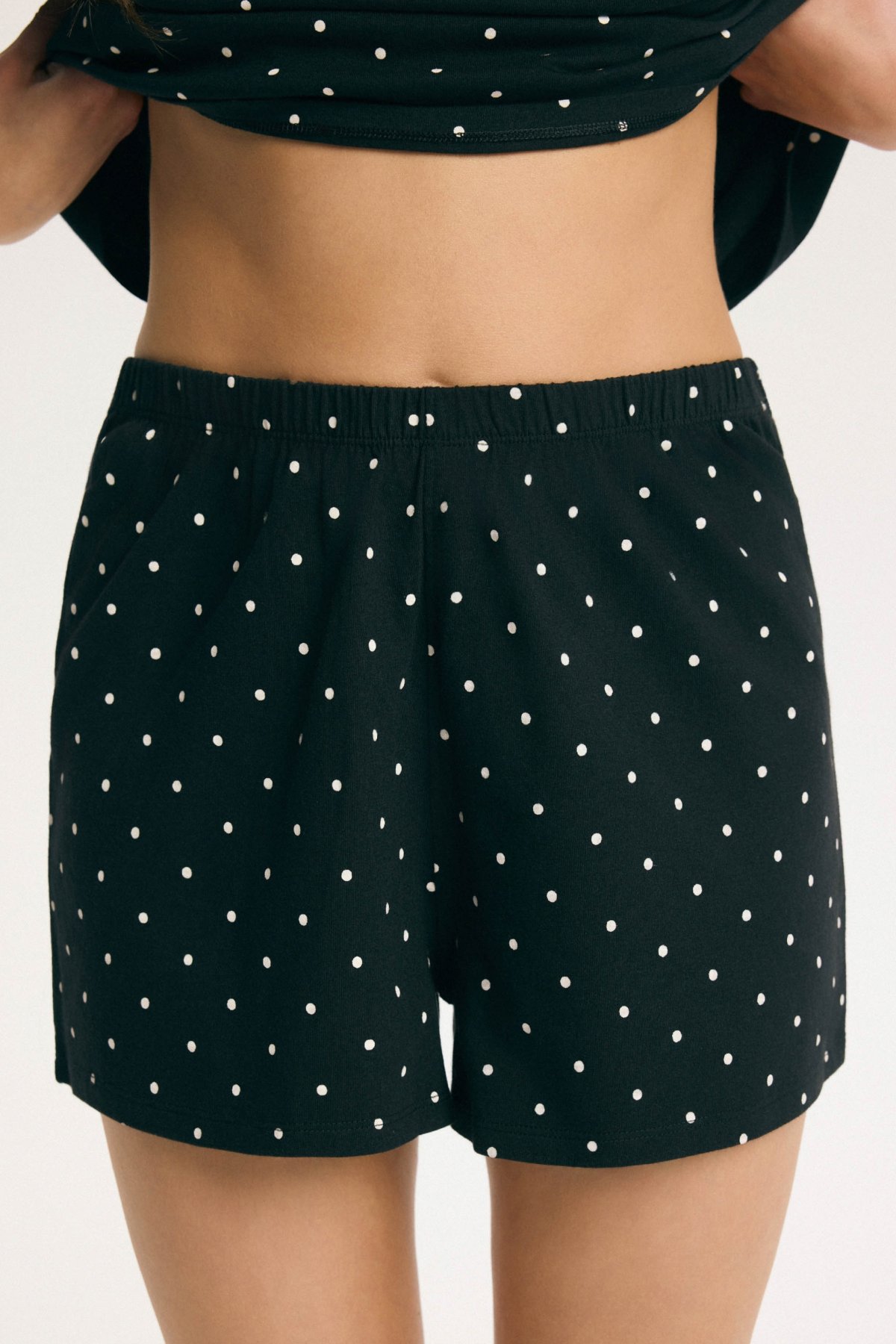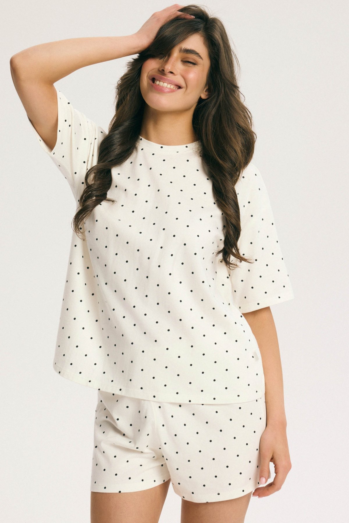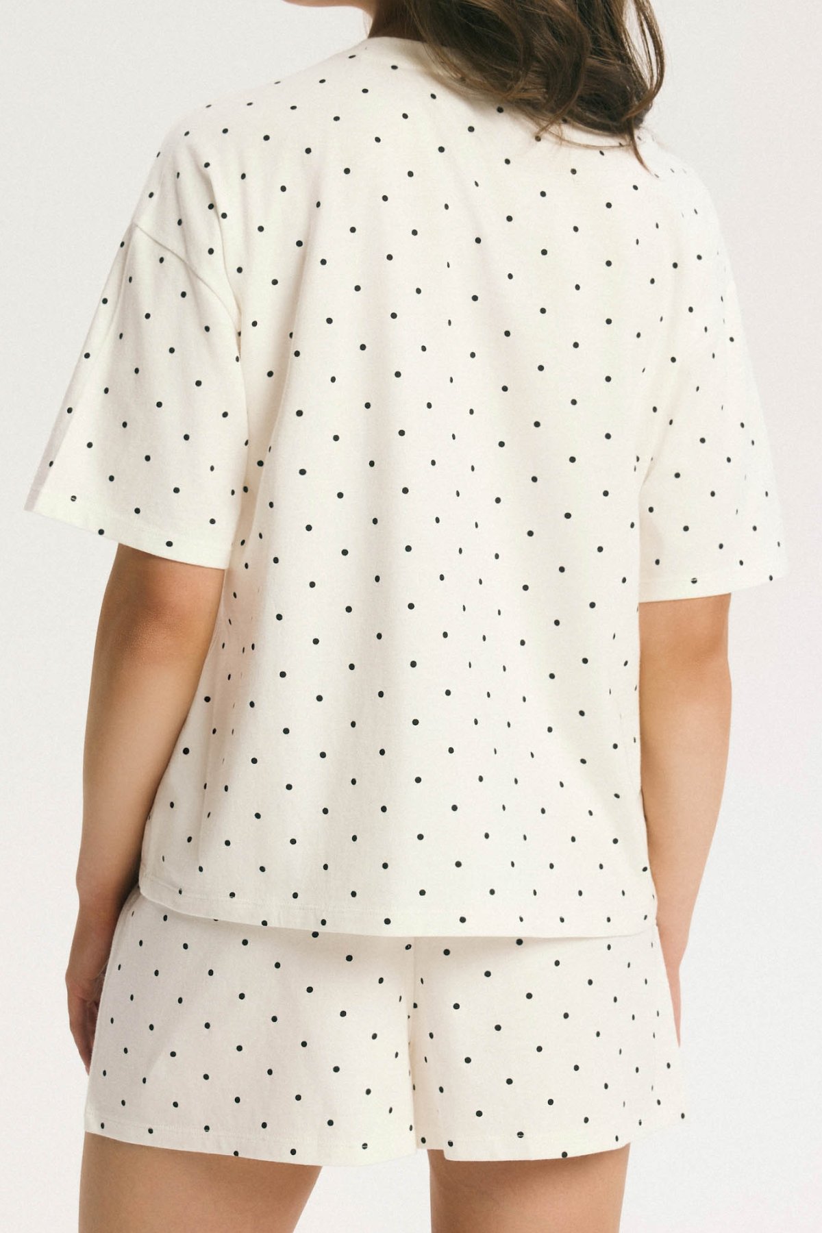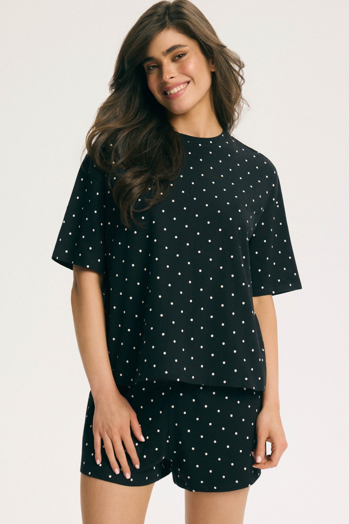 Tričko s jednoduchým střihem se příjemně přizpůsobí postavě a spolu s krátkými šortkami vytváří uvolněný, harmonický celek. Materiál s podílem bavlny a viskózy je měkký na dotek a příjemný při nošení. Volnější střih podporuje pohodlí bez zbytečného obepínání, zatímco šortky s elastickým pasem dobře sedí a neomezují v pohybu. Jemný pravidelný vzor dodává modelu decentní detail a podtrhuje jeho klidný, čistý vzhled.