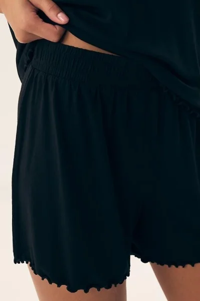 Pyžamo Noves se skládá z pohodlného trička s krátkými rukávy a elegantním véčkovým výstřihem, který dodává celému modelu jemnost a šarm. Spodní lem je jemně obšitý, vytváří efekt malého volánku, který se opakuje i na nohavicích šortek.