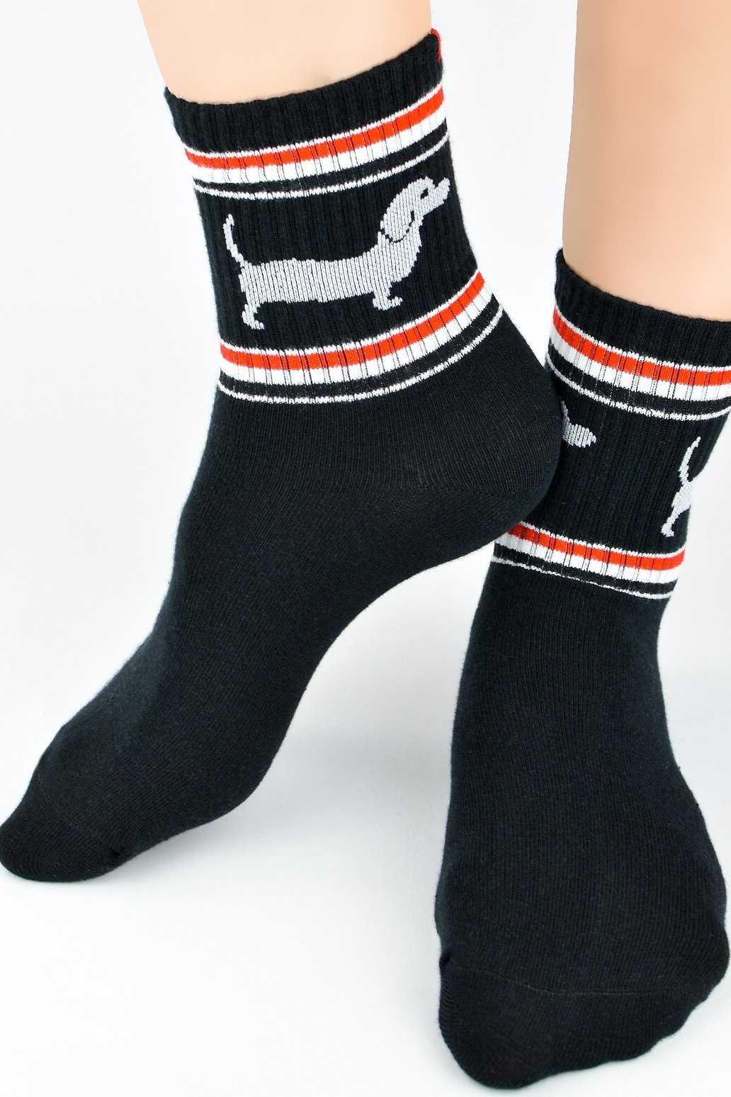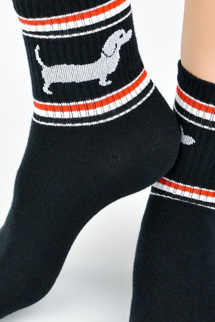 Tyto dámské ponožky z kvalitní bavlněné směsi zaujmou nejen příjemným materiálem, ale i hravým designem s motivem pejska. Díky jemnému žebrovanému úpletu a neškrtícímu lemu perfektně drží na noze, aniž by způsobovaly otlaky. Ploché švy zaručují maximální komfort při každodenním nošení. Skvělá volba pro milovnice pohodlí i pro ty, které rády doplní svůj outfit o malý veselý detail.