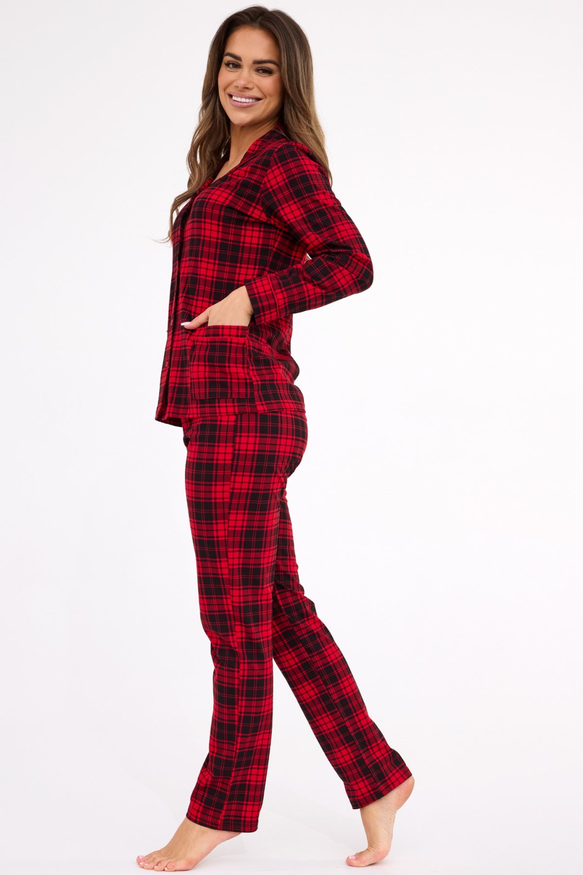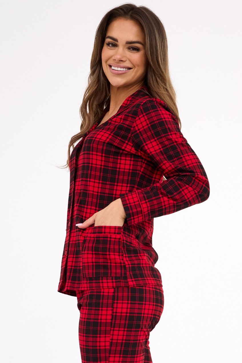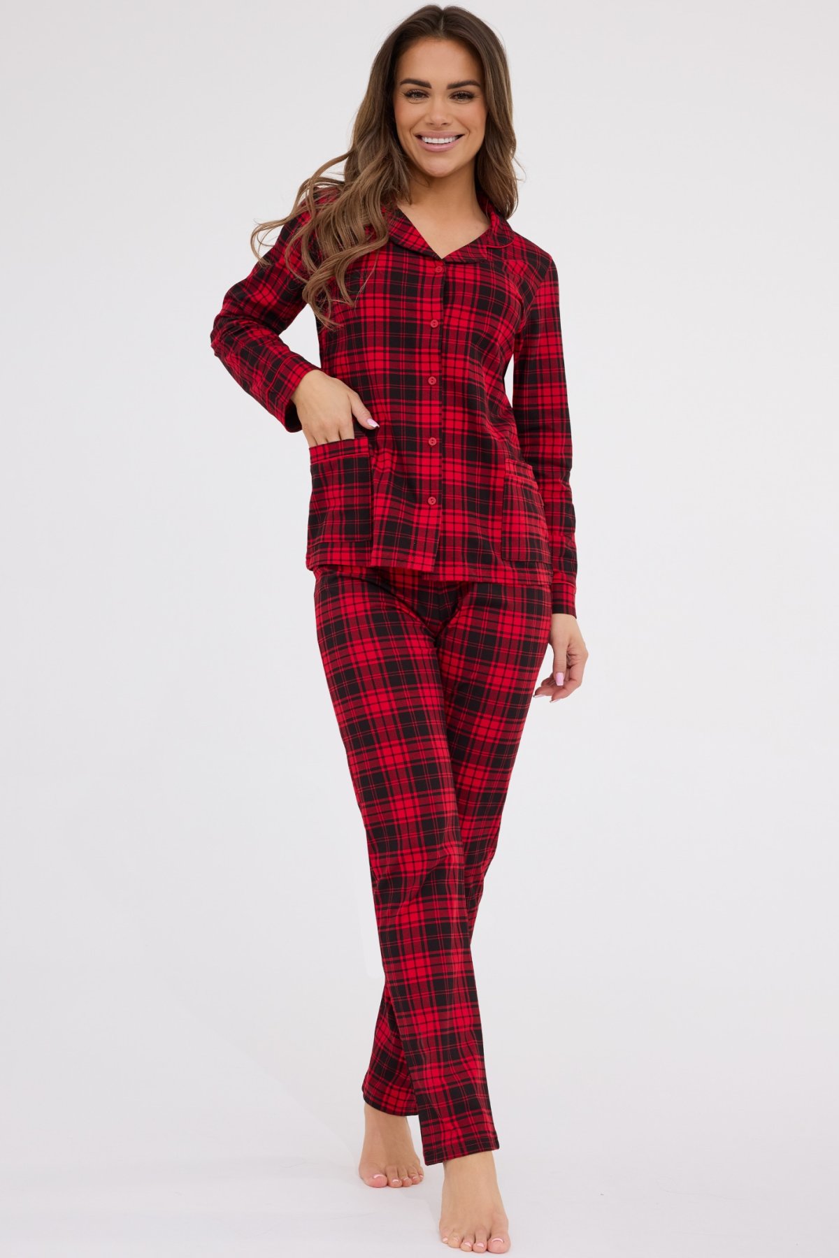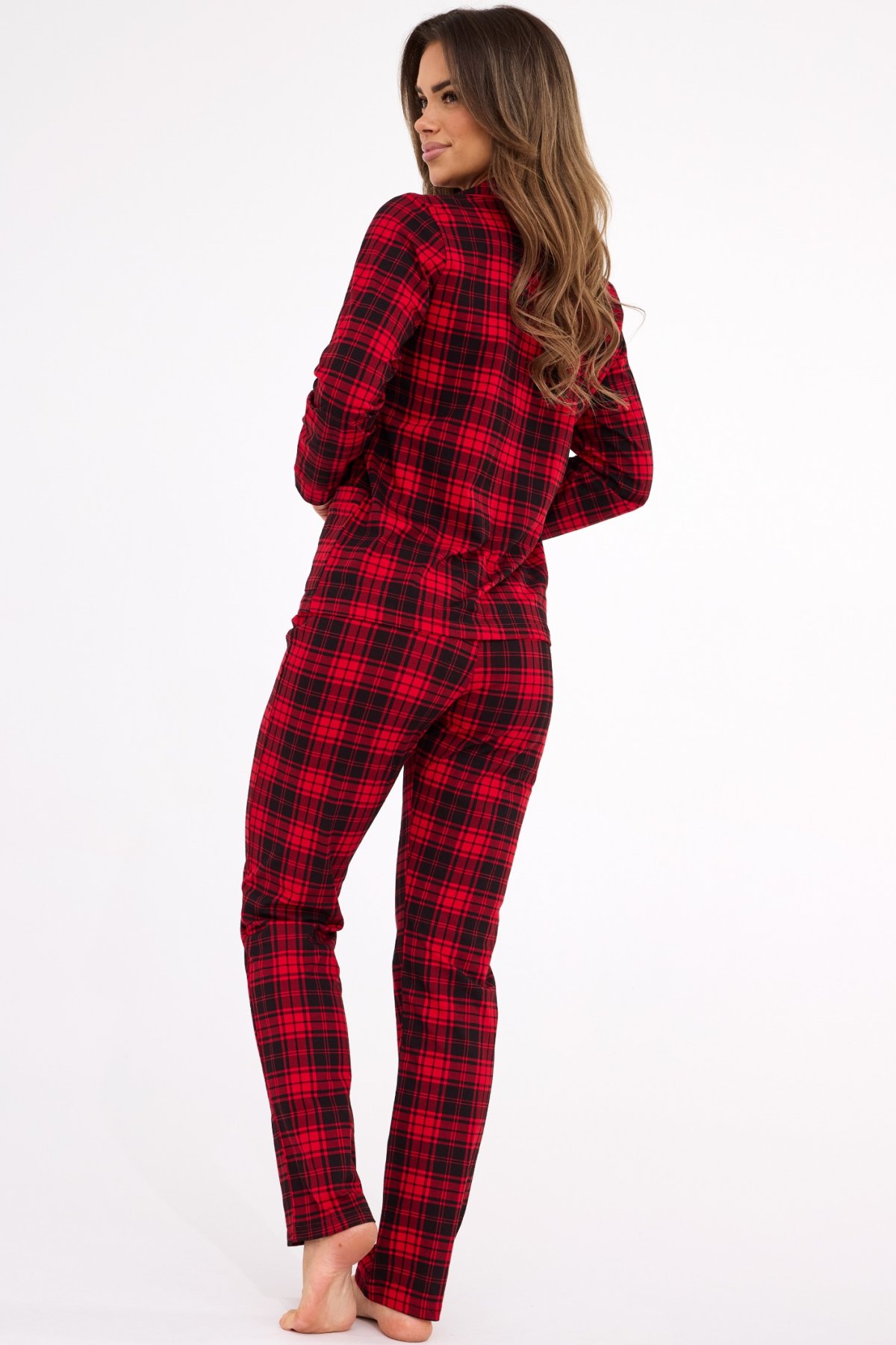 Horní díl ve stylu košile s límečkem působí stylově a díky celopropínacímu zapínání na knoflíky je velmi pohodlný při oblékání. Kostkovaný vzor dodává pyžamu nadčasový charakter a podtrhuje jeho klasický vzhled. Dlouhé kalhoty s elastickým pasem poskytují maximální komfort při nošení a neomezují v pohybu.