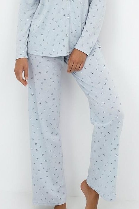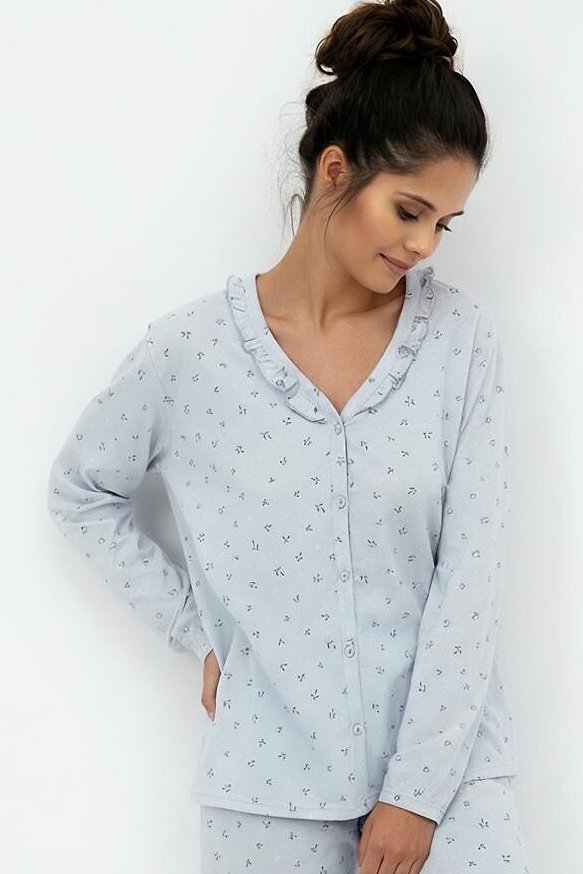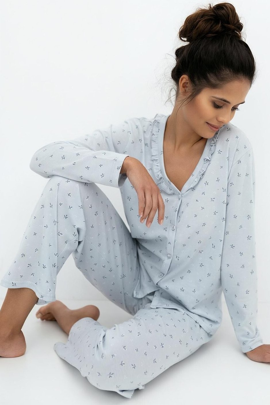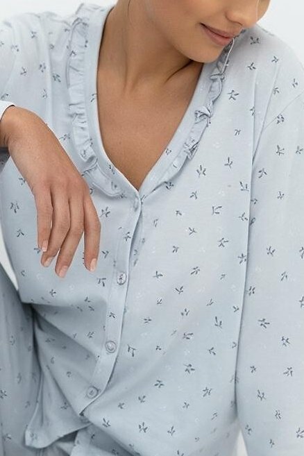 Pyžamo Lucille II je symbolem ženské jemnosti a pohodlí. Kombinuje nadčasový střih se subtilními detaily, které dodávají celku nádech romantické elegance. Košile s knoflíkovým zapínáním a jemným volánkem působí mimořádně půvabně, zatímco dlouhé kalhoty s mašlí v pase doplňují celý komplet o dotek lehkosti a šarmu. Měkká bavlna příjemně hladí pokožku a zajišťuje komfort po celou noc. Ideální volba pro chladnější večery a chvíle domácí pohody.