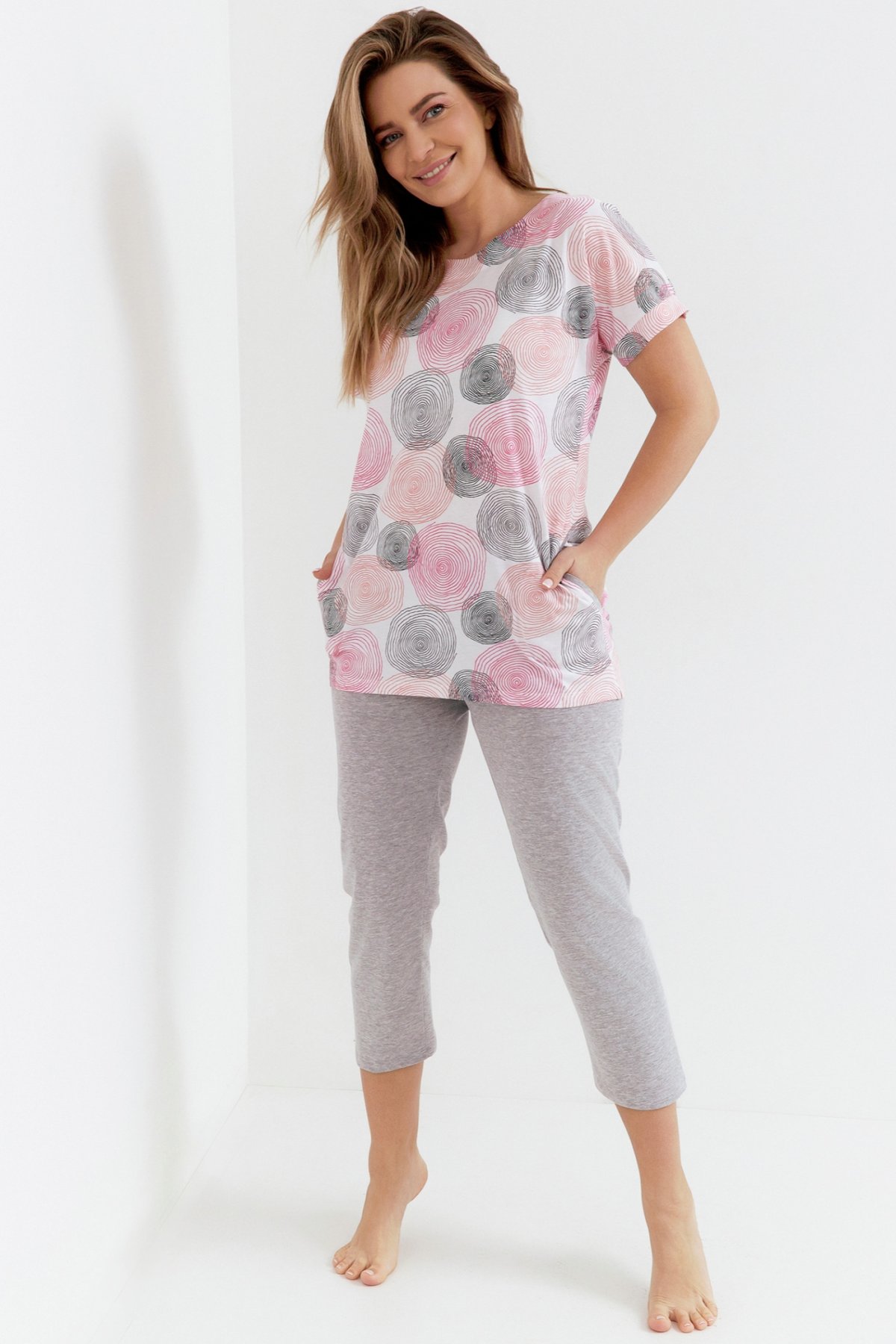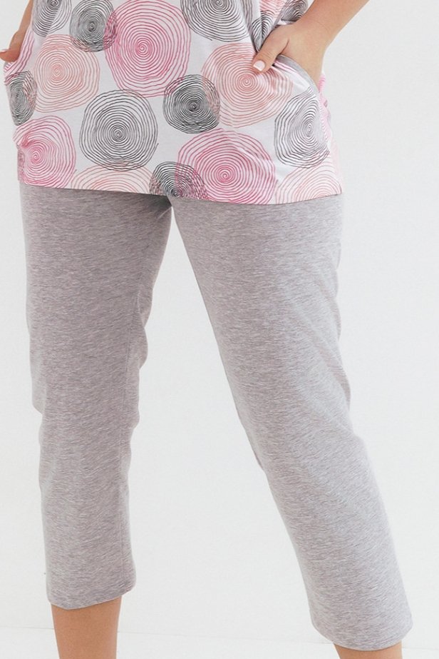 Dámské pyžamo v jemném, růžovo-šedém tónu spojuje pohodlí, praktičnost a ženský půvab. Volné triko s krátkými rukávy a kulatým výstřihem poskytuje maximální volnost pohybu, kapsy po stranách dodávají celku uvolněný, domácí charakter. Tříčtvrteční kalhoty s gumou v pase se přizpůsobí postavě a zajistí pohodlí po celý den i noc. Měkká bavlna v kombinaci s elastanem je prodyšná, hebká a ideální pro klidný spánek i chvíle odpočinku doma. Perfektní volba pro ženy, které hledají komfort v moderním, ležérním stylu.