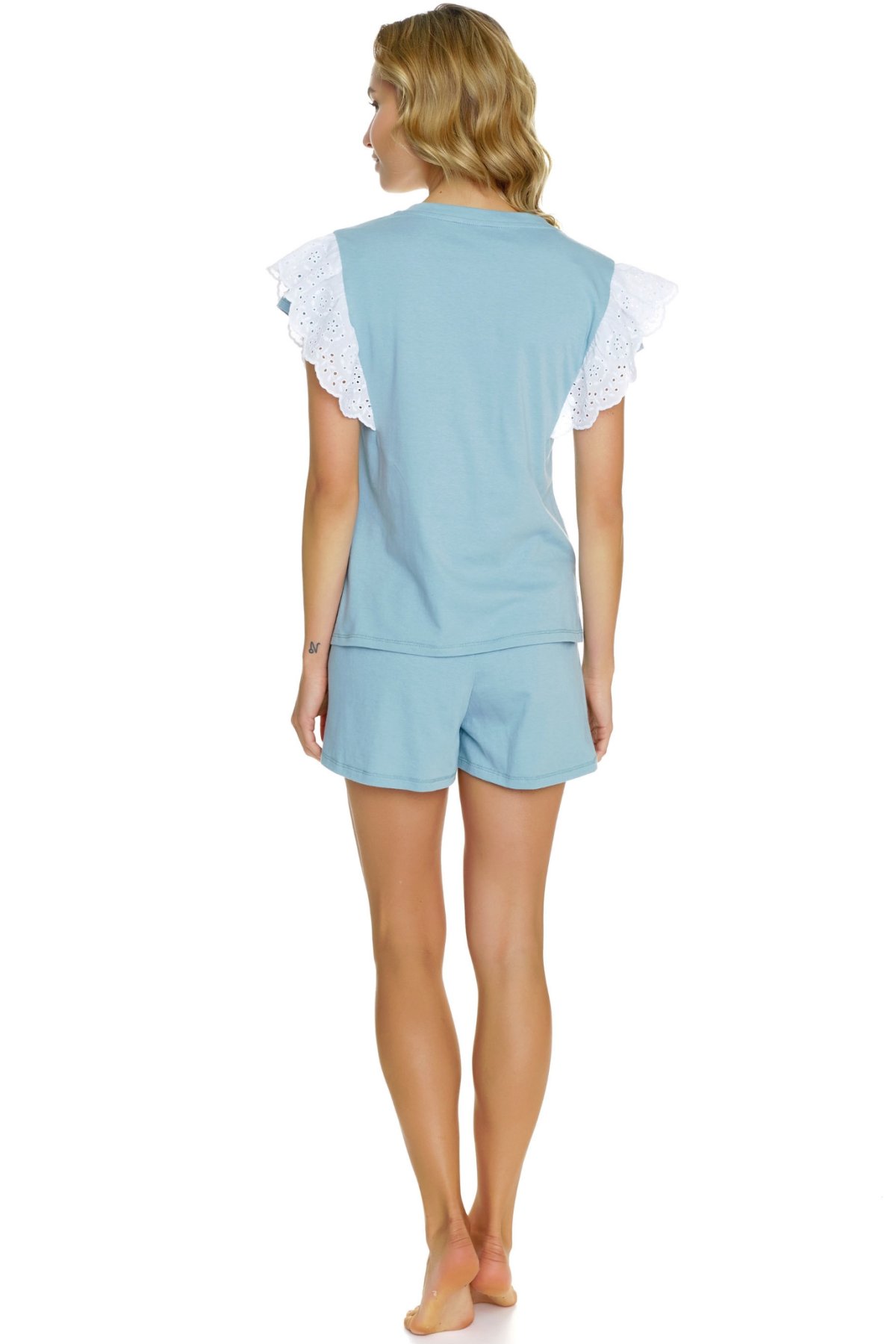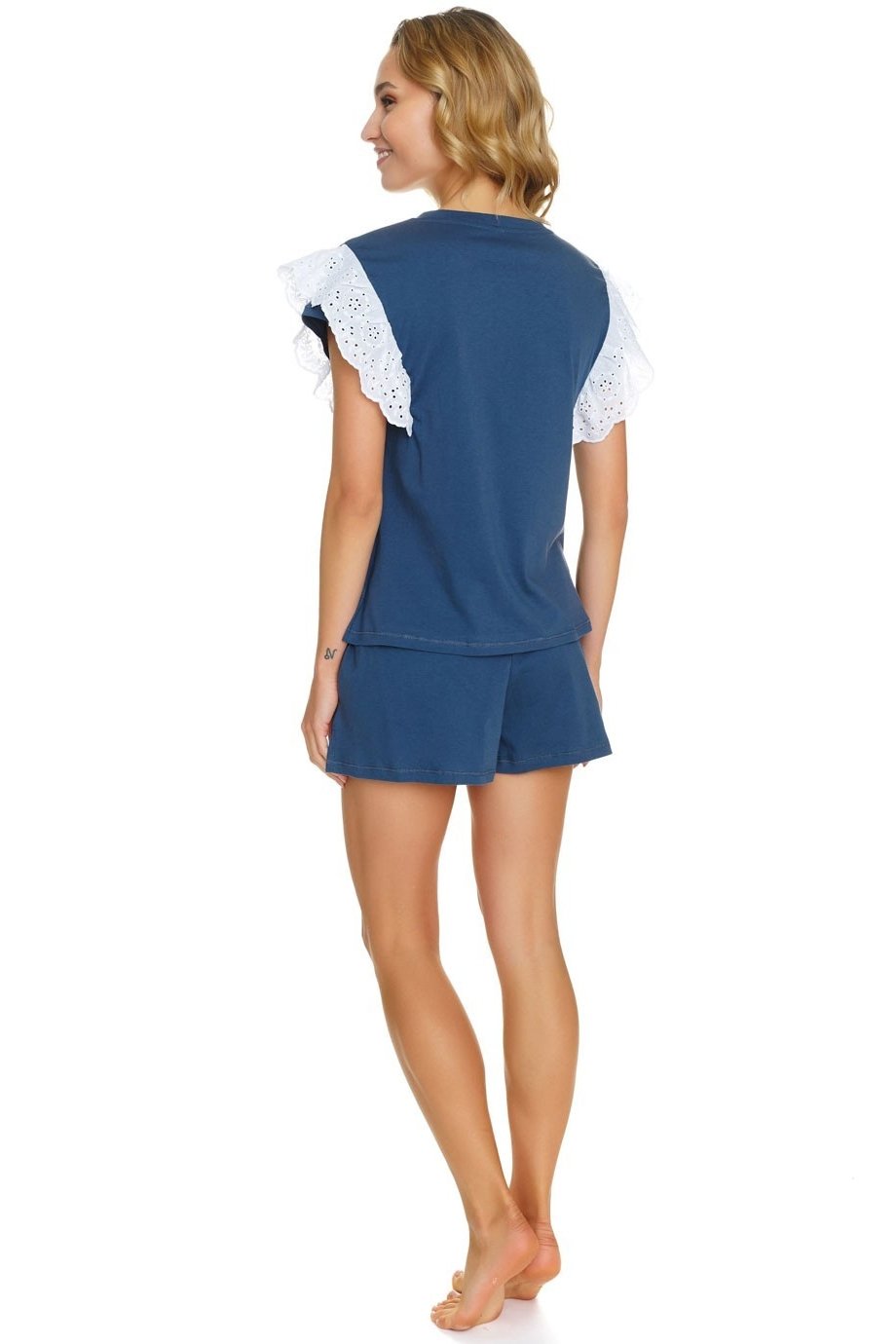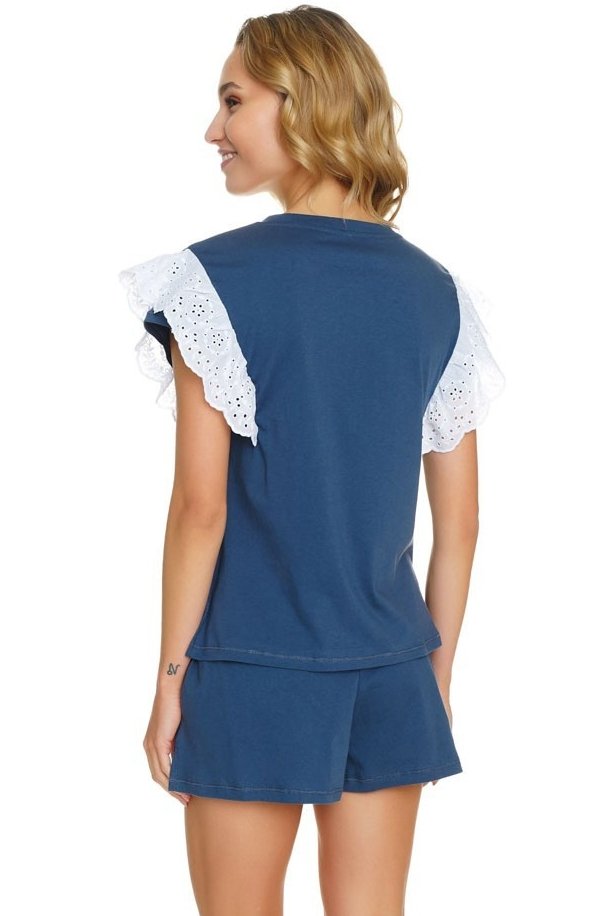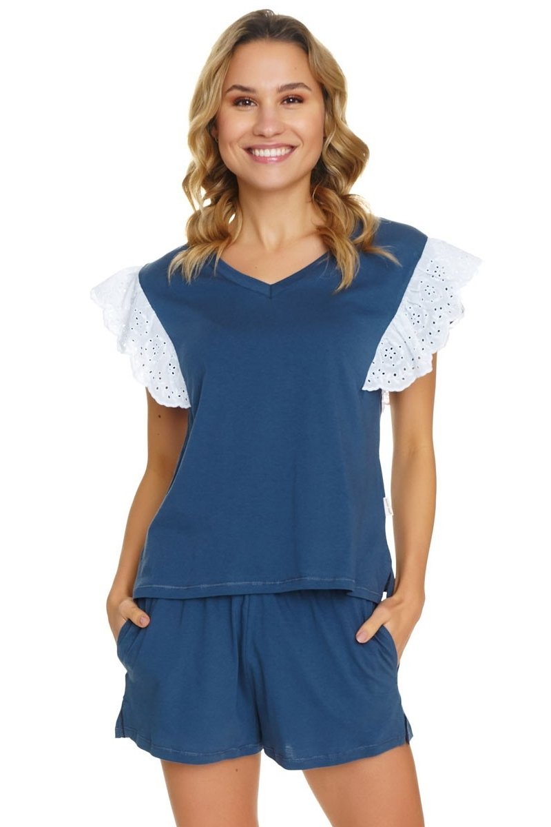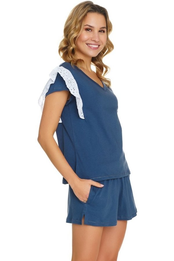 Dámské dvoudílné pyžamo, které si okamžitě získá vaše srdce. Kombinace jemné látky, rafinovaného střihu a decentních detailů vytváří dokonalou rovnováhu mezi elegancí a komfortem. Lehká, měkká bavlna příjemně přiléhá k tělu a volně splývá. Triko s výstřihem do V a bílou krajkou působí romanticky a jemně, zatímco šortky s bočním rozparkem a kapsami dodávají celému kompletu moderní charakter. Pyžamo je navrženo pro ženy, které si potrpí na kvalitu, ženský styl a pohodlí – ideální pro klidné večery i stylové probuzení.