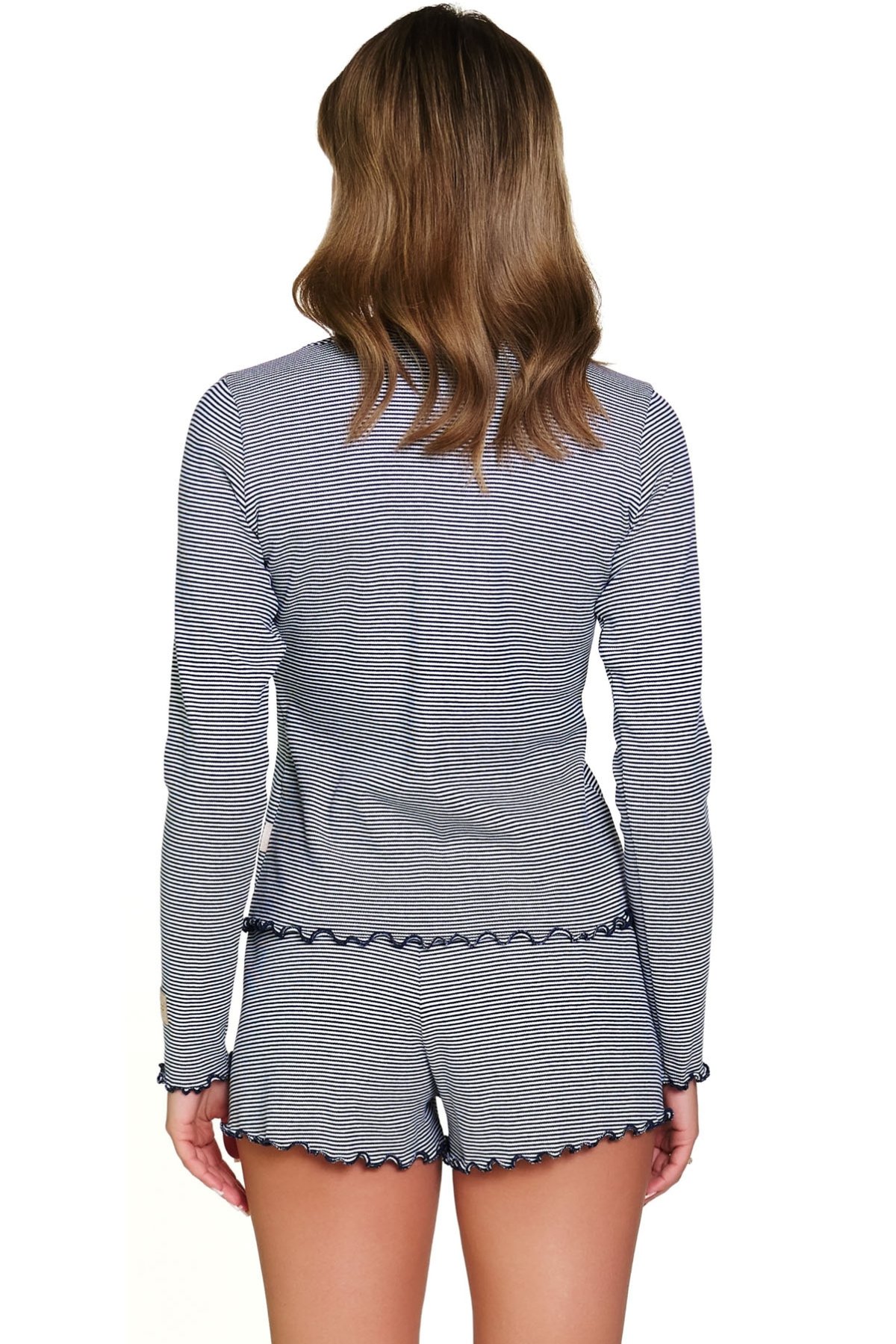 Dámské pyžamo z žebrované bavlny spojuje pohodlí, jemnost a ženský styl. Měkká bavlna s elastanem se dokonale přizpůsobí postavě. Horní díl s dlouhým rukávem doplňují drobné volánky, které pyžamu dodávají romantický charakter. Krátké šortky s elastickým pasem a ozdobnými knoflíky zajišťují volnost pohybu i maximální komfort. Díky kombinaci přirozené pružnosti, decentního designu a kvalitního zpracování je tento komplet ideální pro klidné večery i pohodlné ráno. K dispozici ve dvou nadčasových odstínech – růžové a modré – které podtrhnou jemnou ženskost a smysl pro detail.