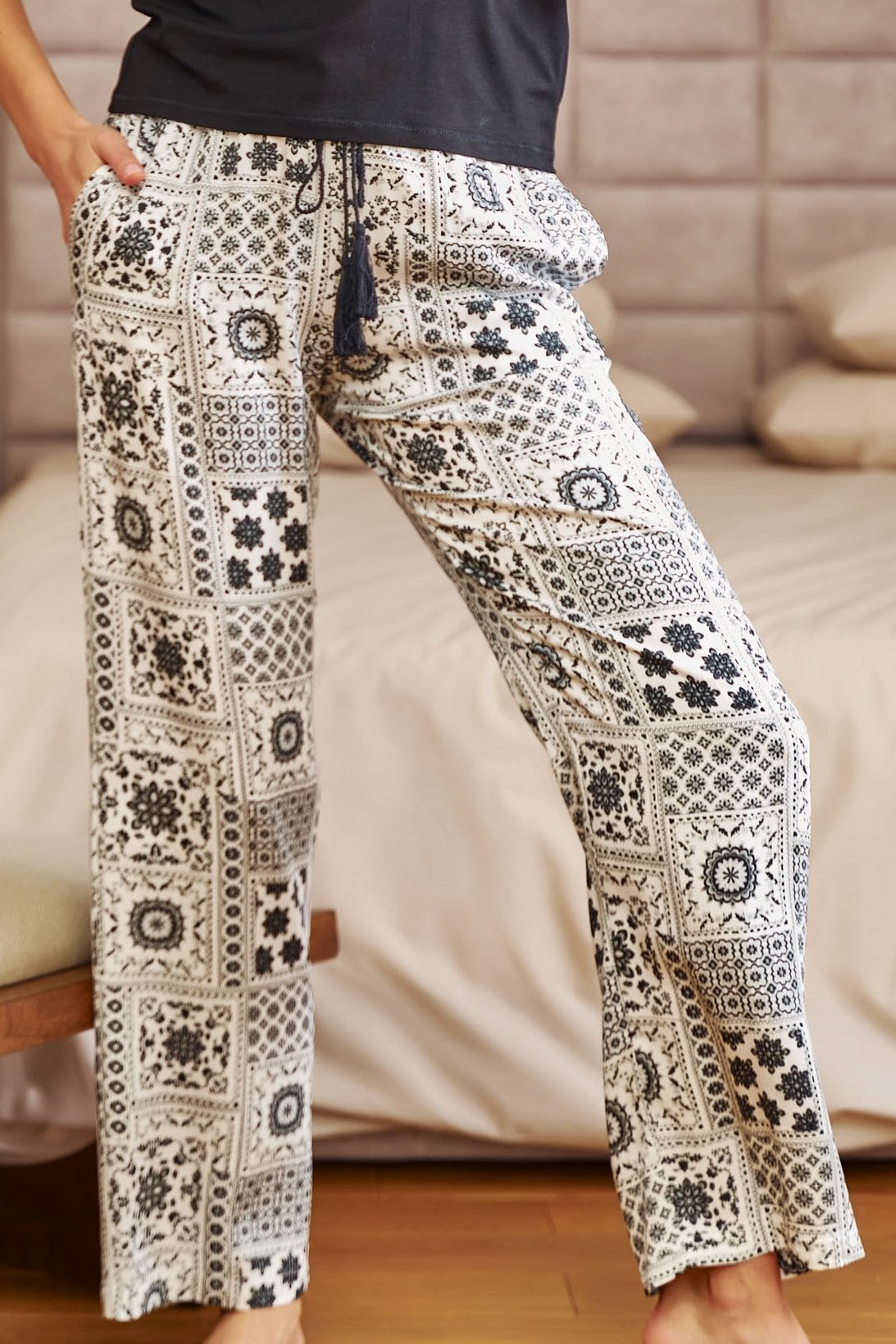 Dámské pyžamo z viskózy kombinující pohodlí a jednoduchou eleganci. Materiál je měkký, splývavý a příjemný na dotek, díky čemuž se příjemně nosí po celou noc. Pyžamo má krátký rukáv a dlouhé kalhoty s volným střihem, který neomezuje pohyb.