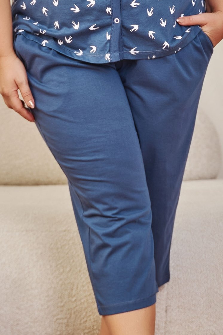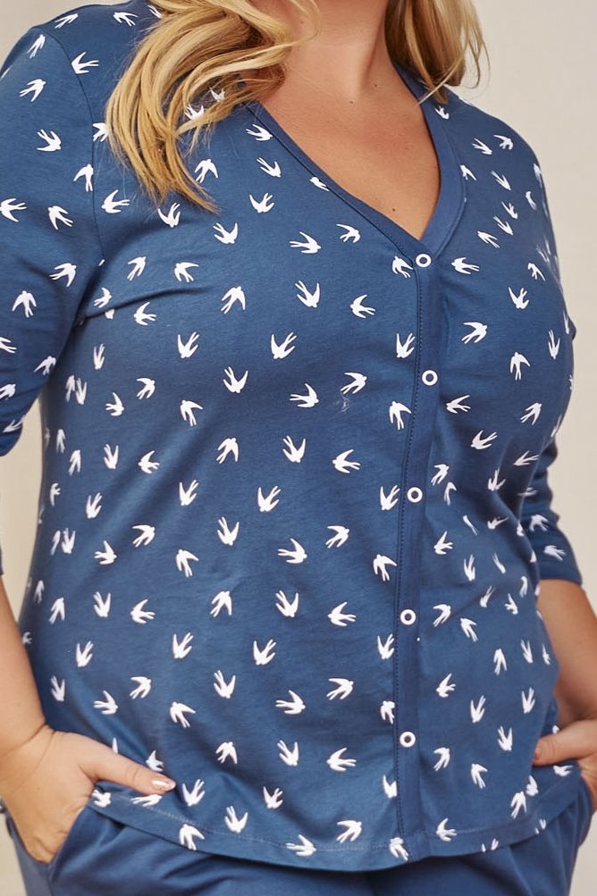 Vyrobené z prodyšné bavlny, která nechá pokožku volně dýchat. Halenka je s výstřihem do V a zapínáním na knoflíky. Rukávy a kalhoty s 3/4 délkou přinášejí ideální rovnováhu mezi lehkostí a komfortem. Decentní vzor s vlaštovkami dodává modelu jemně romantický nádech. Pyžamo je ideální nejen na spaní, ale i na domácí relax – perfektní volba pro ženy, které chtějí vypadat krásně a cítit se skvěle každý den.
