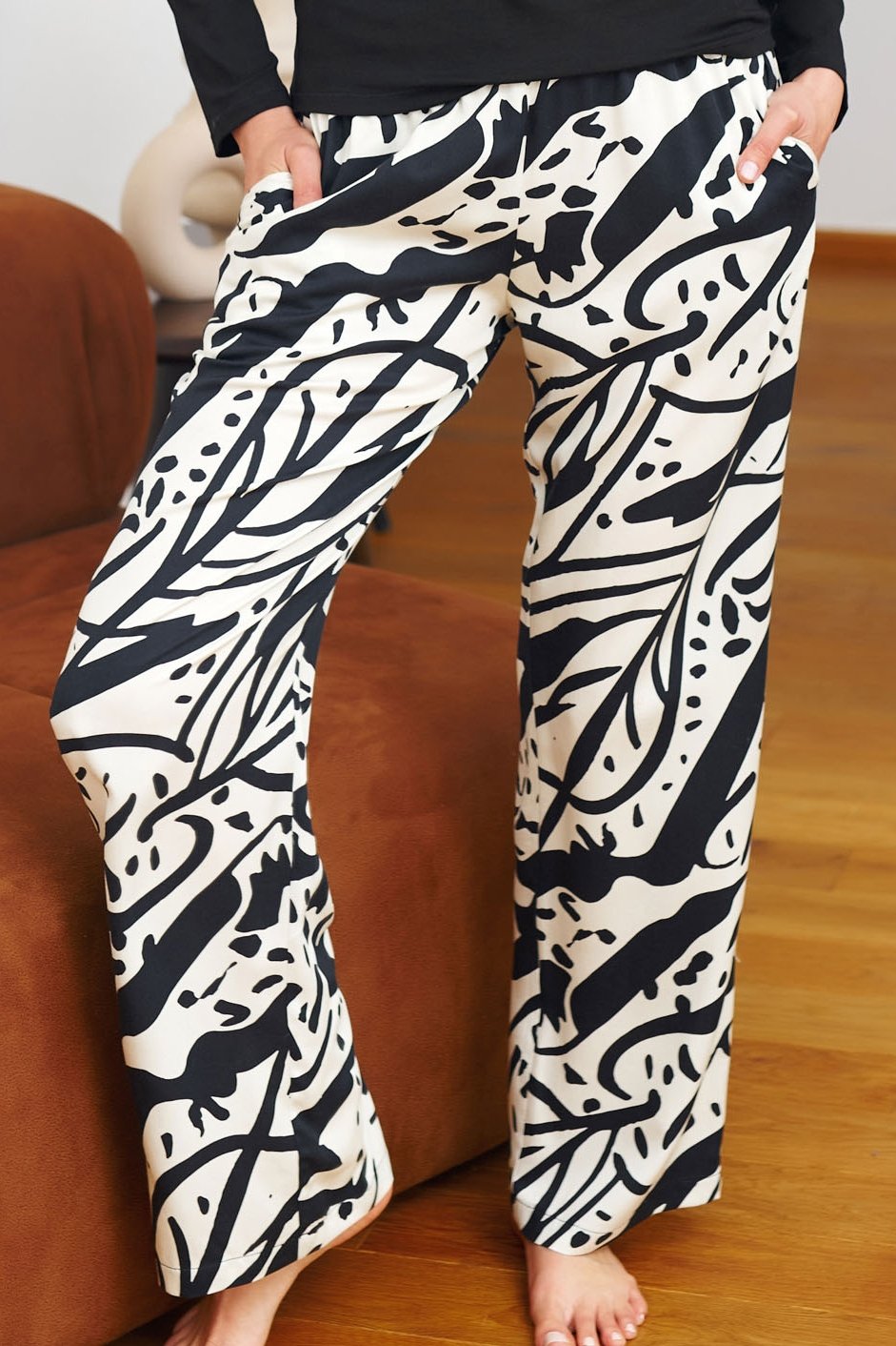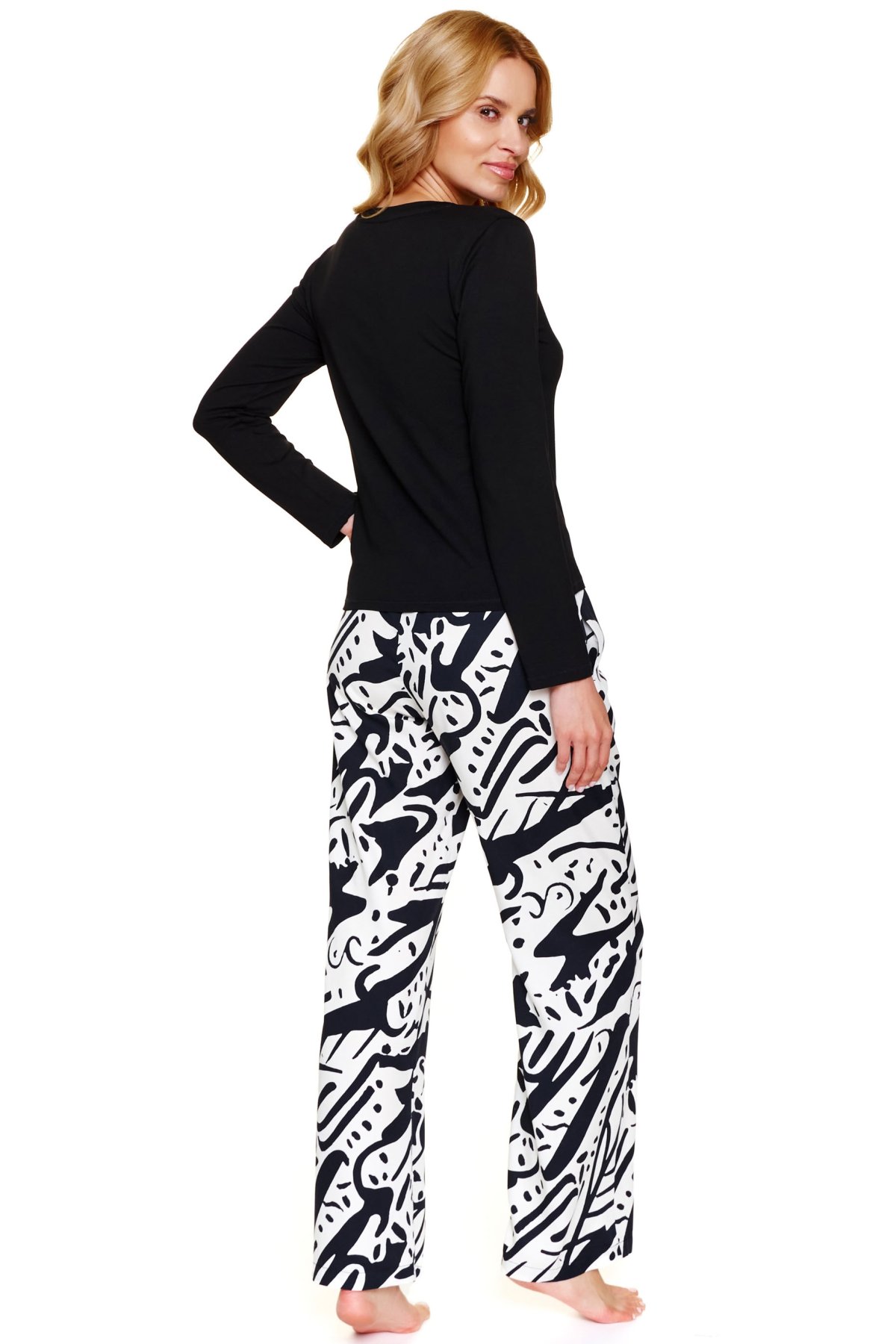 Dámské pyžamo z viskózy spojující eleganci, pohodlí a lehkost. Měkký horní díl v klasické černé barvě příjemně splývá na těle a díky volnému střihu zajišťuje maximální komfort během spánku i domácí relaxace. Dlouhé kalhoty s elastickým pasem a praktickými kapsami doplňuje stylový kontrastní potisk v černo-bílém provedení.