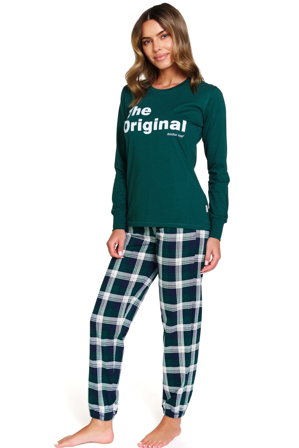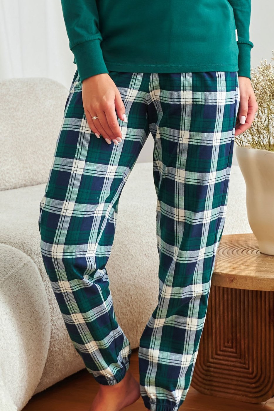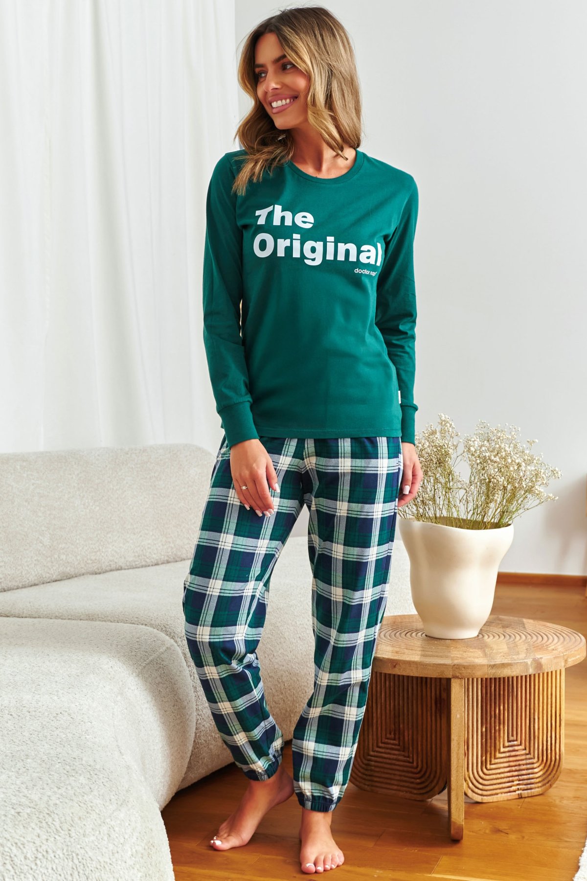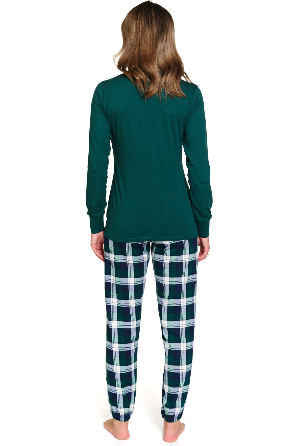 Dámské pyžamo v elegantní smaragdově zelené barvě. Je vyrobeno z vysoce kvalitní bavlny, která je jemná k pokožce a poskytuje dokonalý pocit pohodlí po celou noc. Horní díl s dlouhým rukávem zdobí decentní potisk, který dodává pyžamu svěží vzhled, zatímco dlouhé kalhoty s pohodlným střihem zajistí volnost pohybu a příjemné nošení. Perfektní model pro ženy, které hledají spojení jednoduchosti, kvality a přirozené elegance.