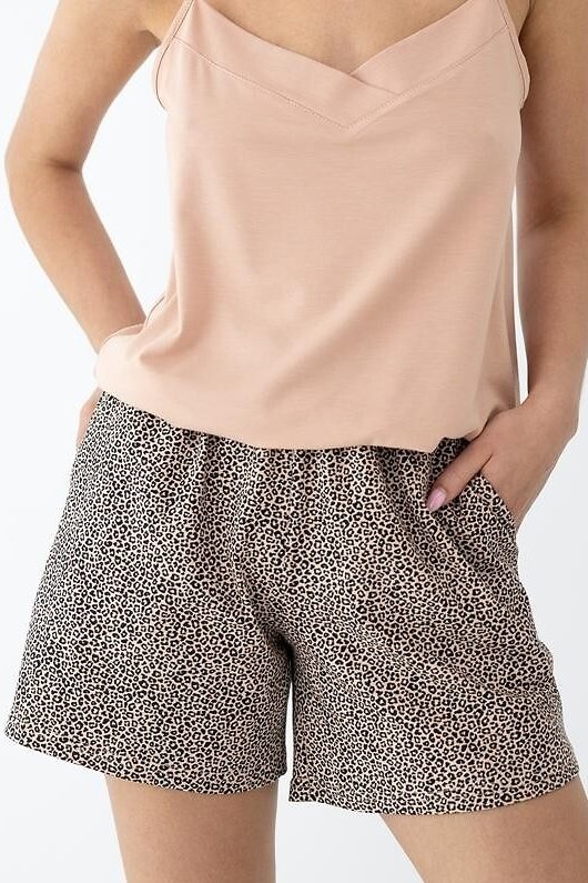 Dámské pyžamo Alessa je ideální pro teplé noci i domácí relax. Horní díl z lehké bambusové směsi je mimořádně jemný, pružný a příjemný k pokožce. Krátké šortky s moderním zvířecím potiskem dodávají soupravě styl a zaručují pohodlí díky měkkému pasu a praktickým kapsám.