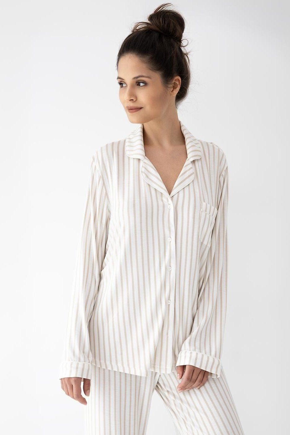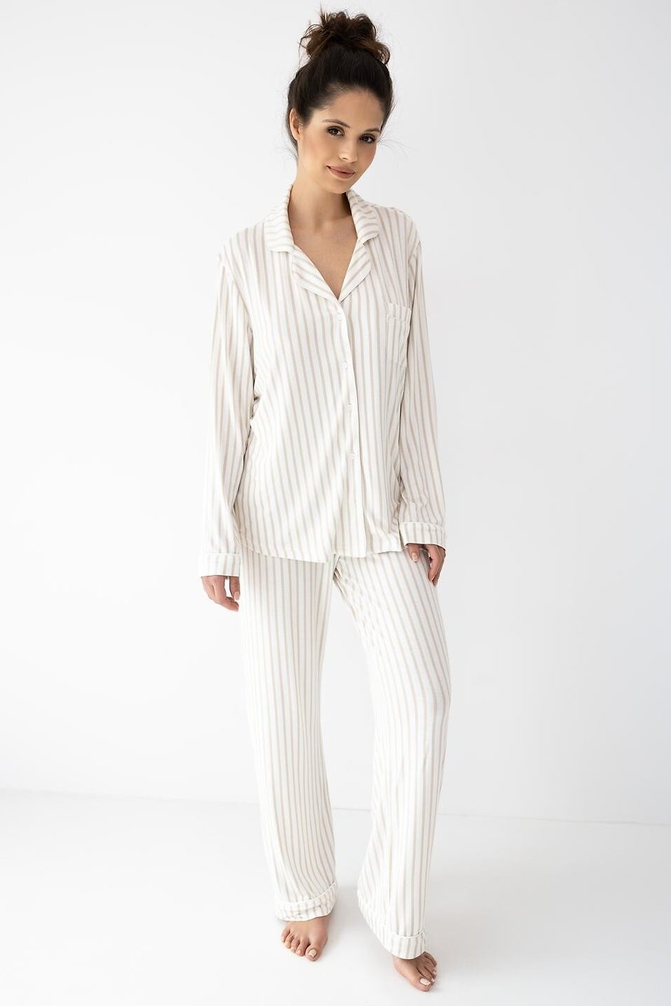 Tohle dámské pyžamo v košilovém stylu je skvělou volbou, když chcete pohodlí a zároveň upravený vzhled. Viskóza je hladká, příjemná na dotek a krásně splývá, takže se v ní budete cítit lehce i při celonočním nošení. Díky elastanu materiál jemně pruží a lépe se přizpůsobí pohybu. Proužky působí čistě a nadčasově, košilový límeček a knoflíčky dodají setu elegantní „loungewear“ charakter. Dlouhé rovné kalhoty mají komfortní pas s gumou potaženou úpletem, která netlačí a drží na místě. Ideální na chladnější večery, klidná rána i domácí relax.