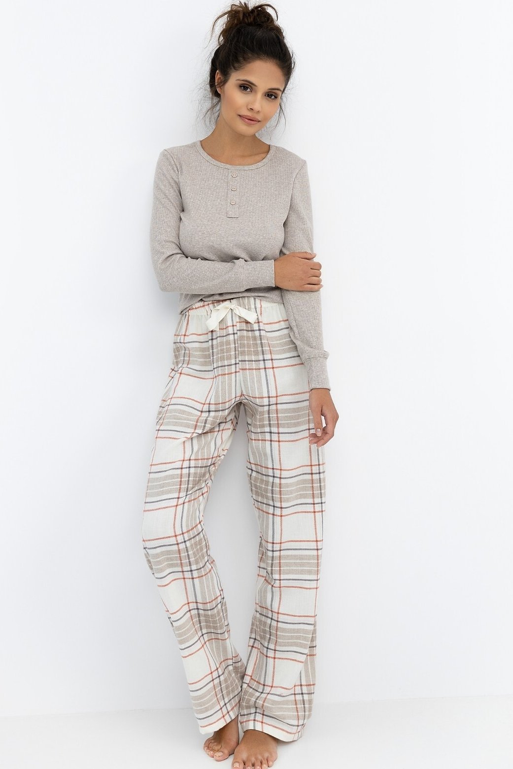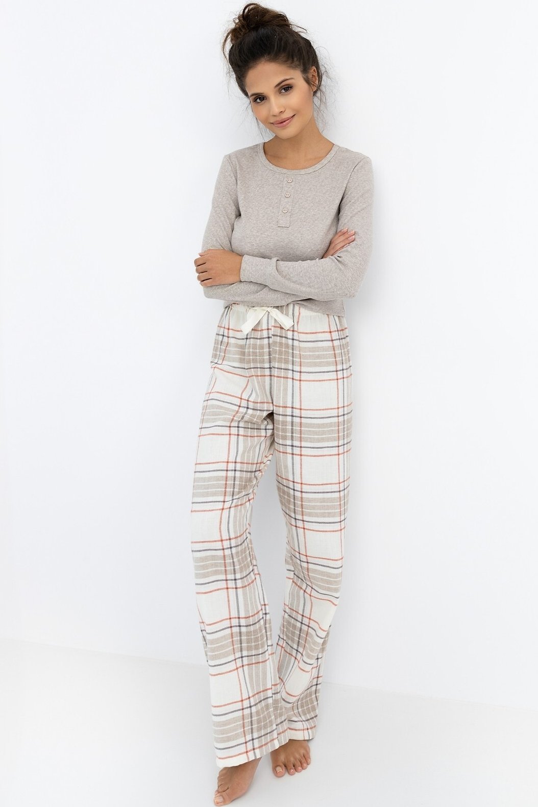 Spodní díl tvoří flanelové kalhoty v módním kostkovaném vzoru, které příjemně hřejí a perfektně ladí s vrškem. V pase je elastická guma doplněná šňůrkou na zavazování. Pyžamo je vyrobené z kombinace bavlny, polyesteru a elastanu, díky čemuž je měkké, pružné a příjemné na dotek. Ideální volba pro chladnější večery i pohodové víkendové ráno.