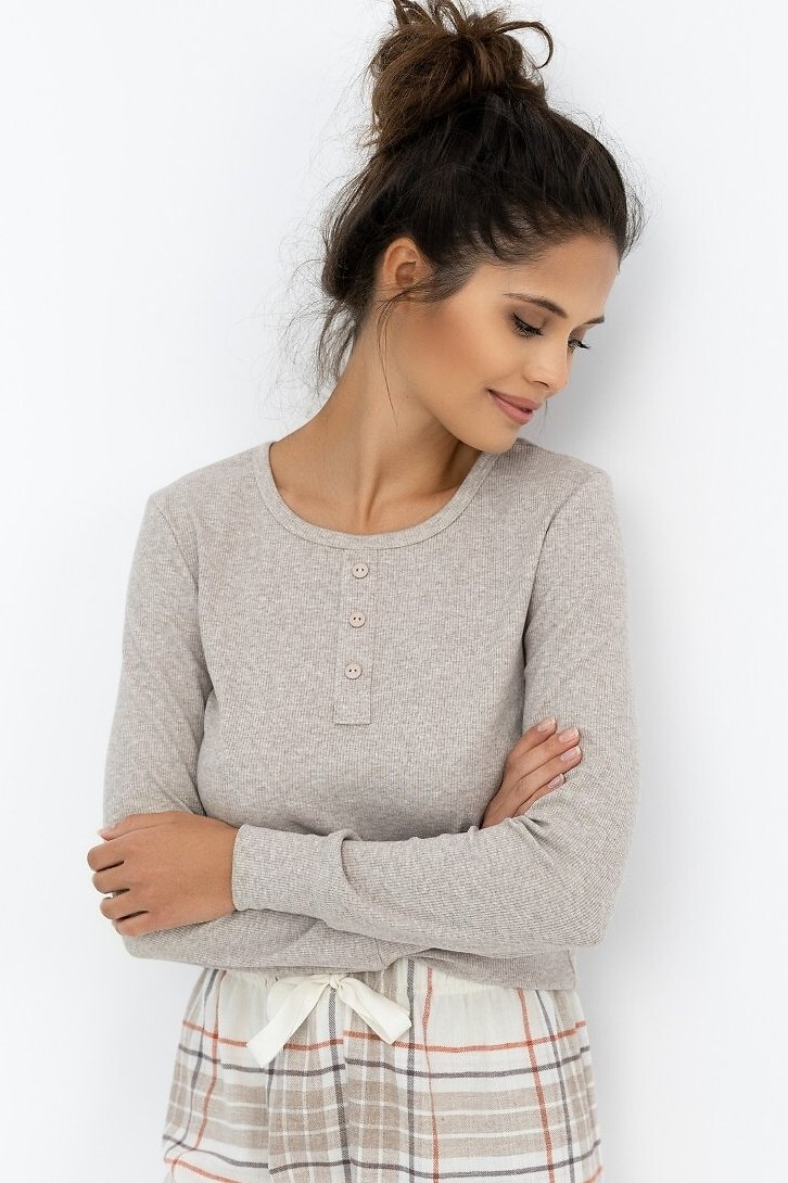 Dámské pyžamo Angelina představuje ideální kombinaci pohodlí, stylu a kvality. Horní díl tvoří melírované tričko s jemným žebrováním. Výstřih je ozdoben drobnými knoflíčky, což dodává pyžamu ženský půvab. Dlouhé rukávy jsou zakončeny pružným lemem, které chrání před chladem.