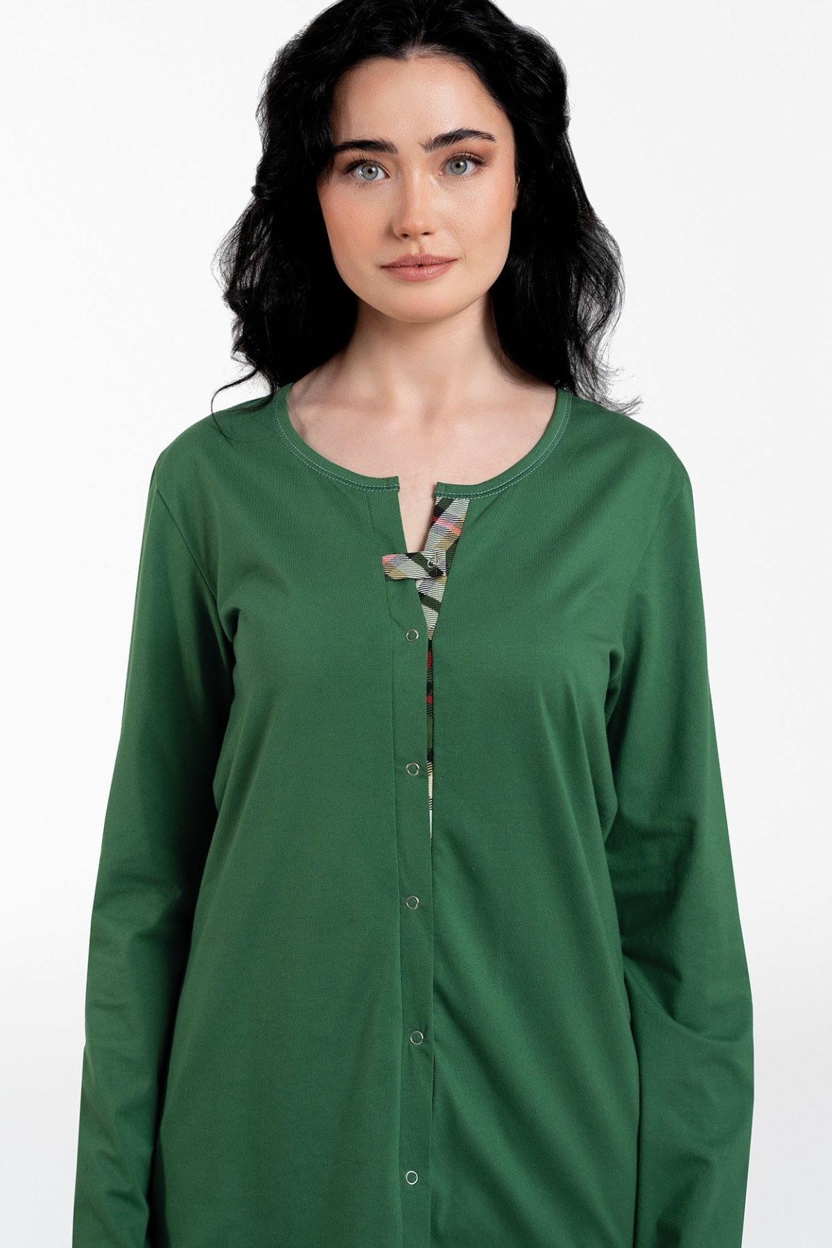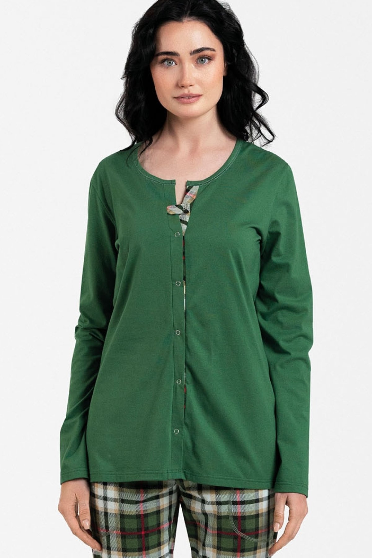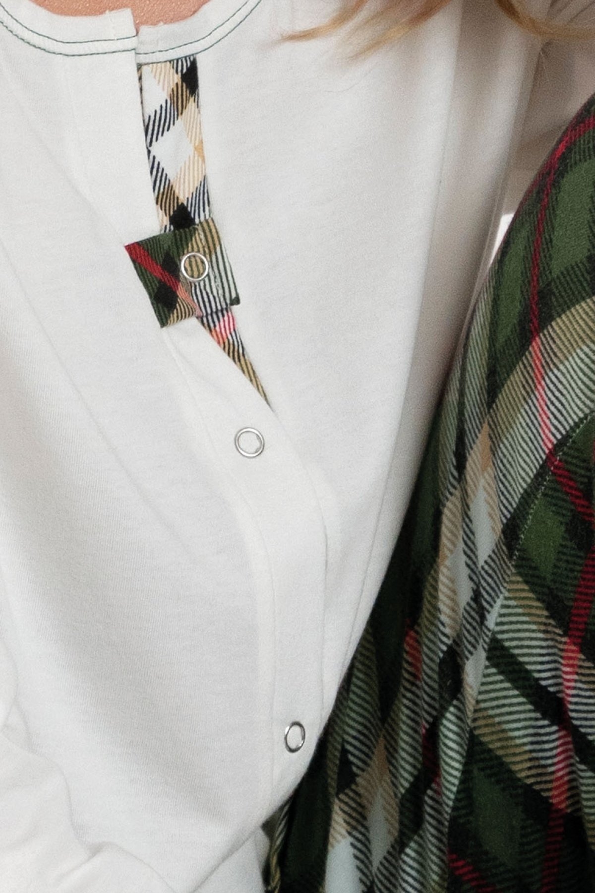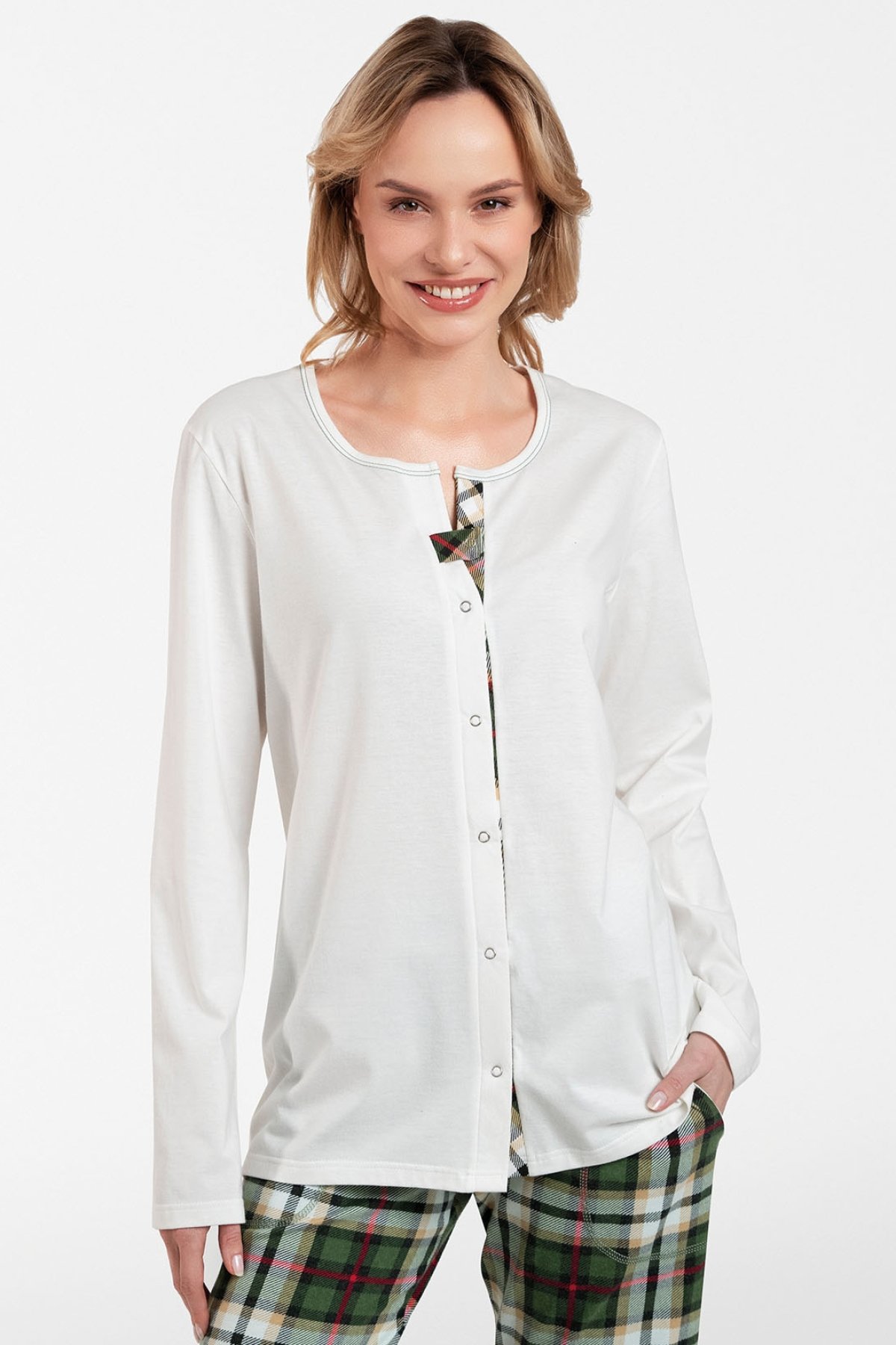 Horní díl je propínací, rozepínací patentky vedou od výstřihu až dolů, což urychlí jeho převlékání nebo usnadní případným maminkám kojení. Rukávy jsou dlouhé, střih maximálně pohodlný a neomezující. Dlouhé vzorované kalhoty mají příjemný, elastický pas, který netlačí. Zakončení nohavic je rovné. Samozřejmostí jsou i postranní kapsičky na drobné nezbytnosti.