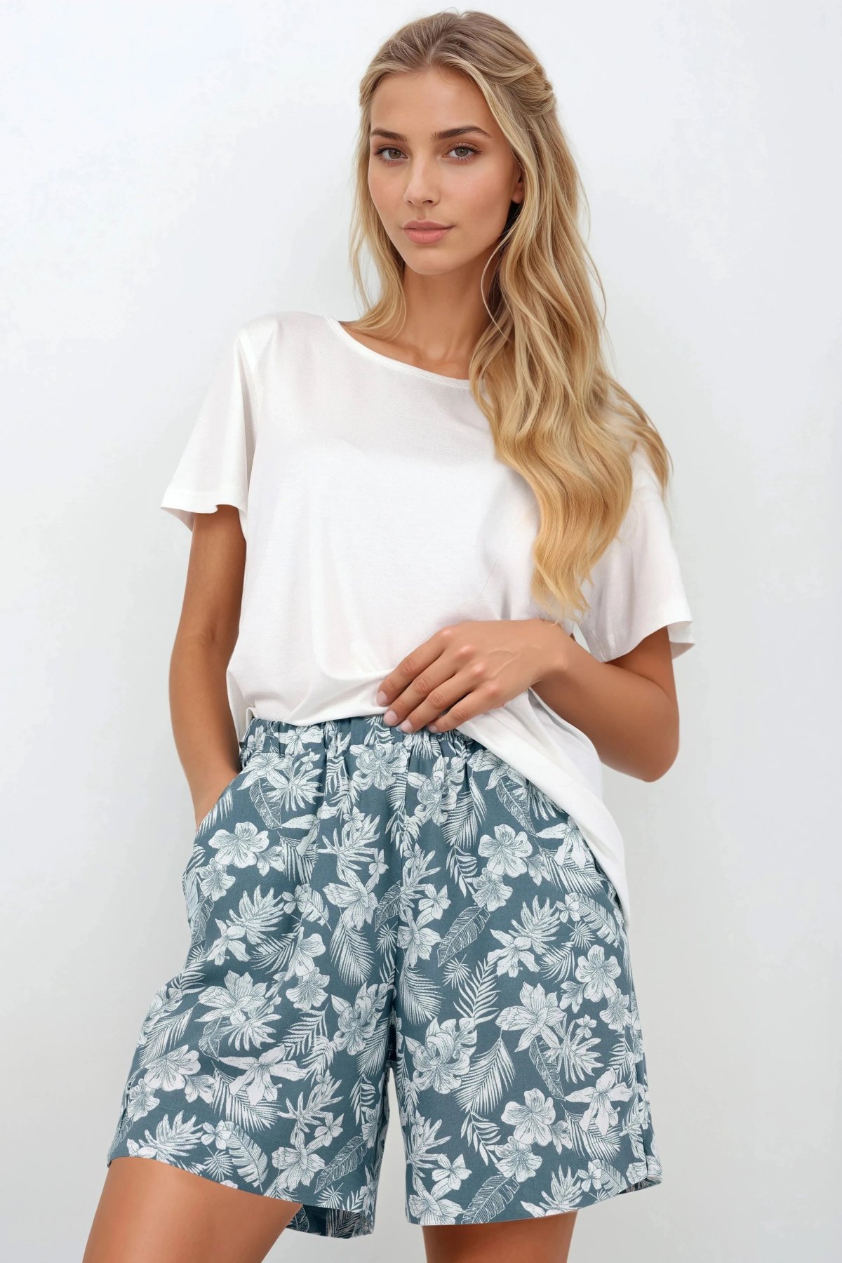 Toto dvoudílné dámské pyžamo je ideální volbou pro ženy, které milují lehkost, volnost a přirozený styl. Volná blůzka s krátkým rukávem a půlkulatým výstřihem z viskózy s příměsí elastanu působí jemně a elegantně. Doplněna je krátkými šortkami s květinovým vzorem, které zaujmou nejen svěžím designem, ale i praktičností – mají kapsy a pohodlnou gumu v pase. Celý komplet je vyroben z měkké, prodyšné tkaniny, která je příjemná na dotek a nechává pokožku volně dýchat. Skvěle se hodí nejen na spaní, ale i jako ležérní homewear pro chvíle odpočinku doma.