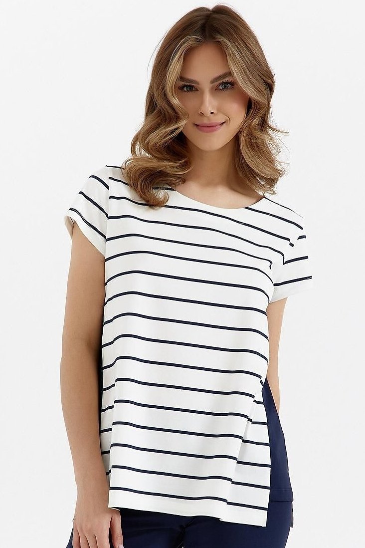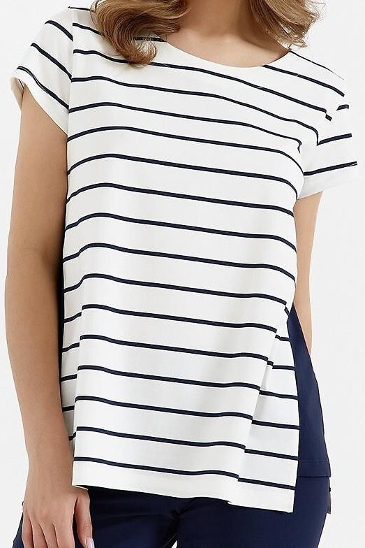 Horní díl tvoří delší tričko s krátkými rukávy a kulatým výstřihem, zdobené moderním proužkovaným vzorem. Po stranách se nacházejí jednobarevné vsadky, které opticky zeštíhlují postavu a dodávají modelu zajímavý vzhled.