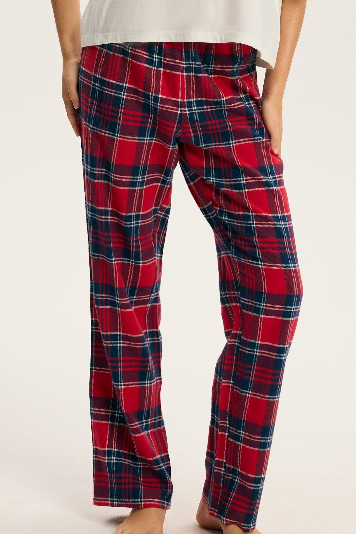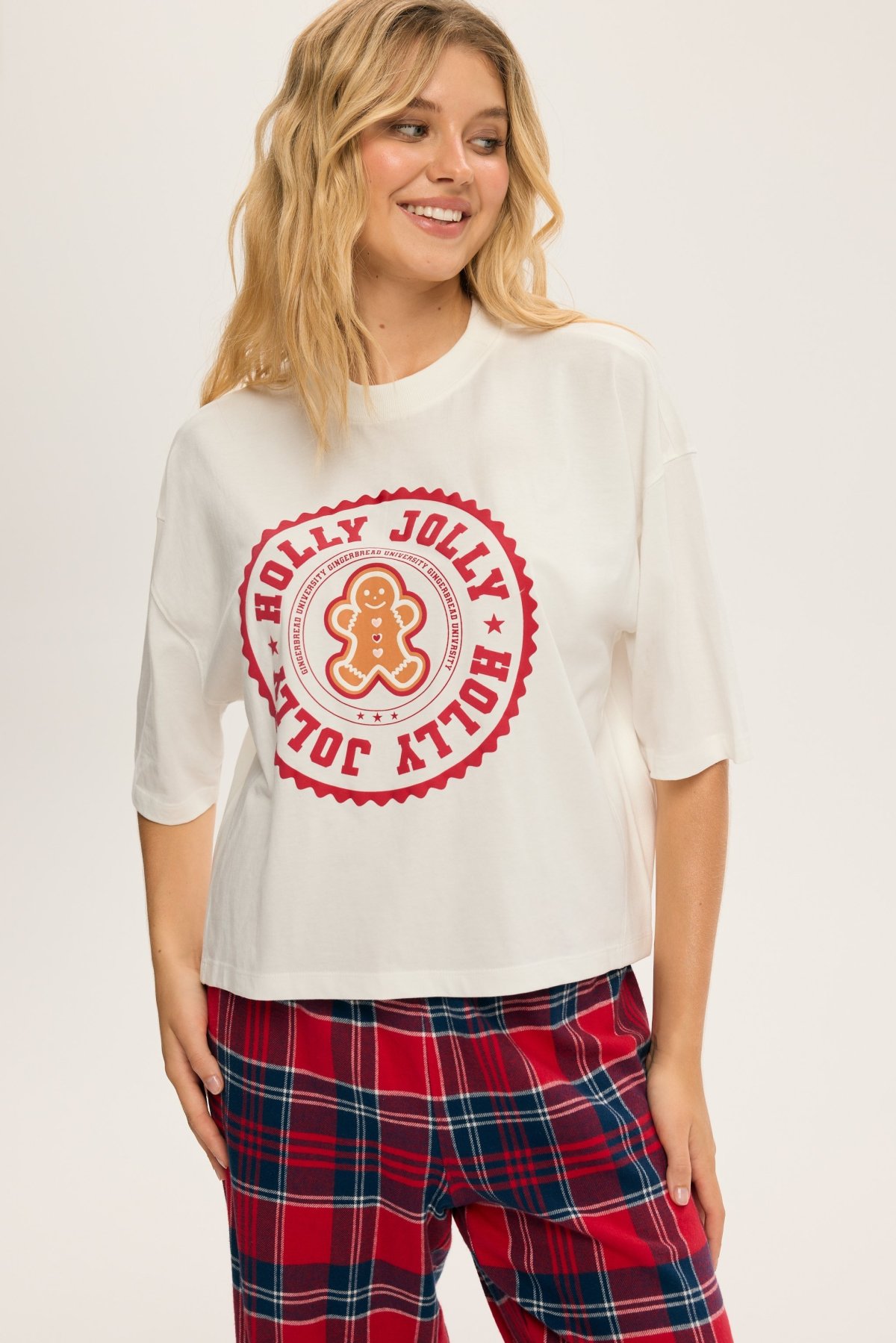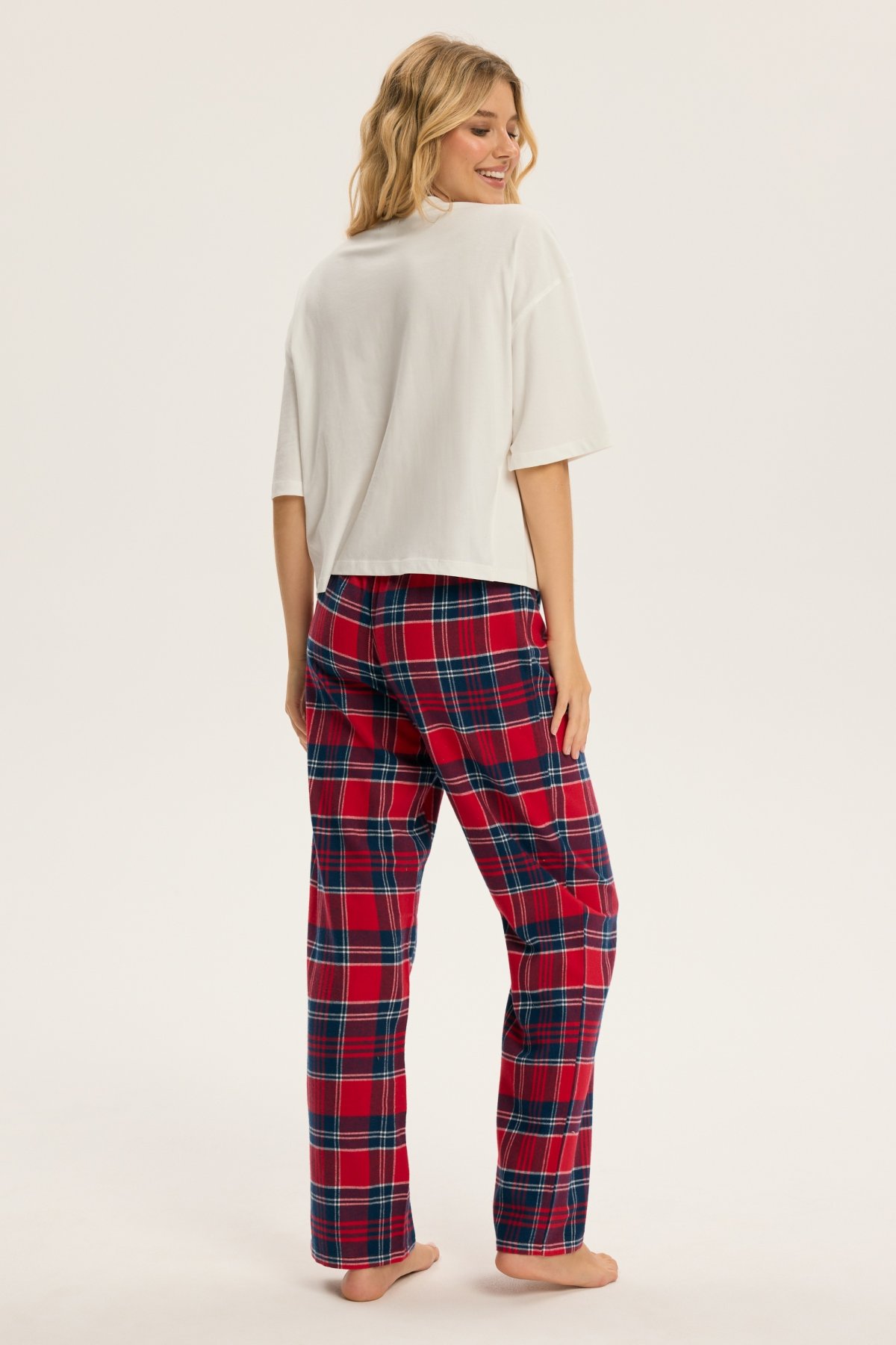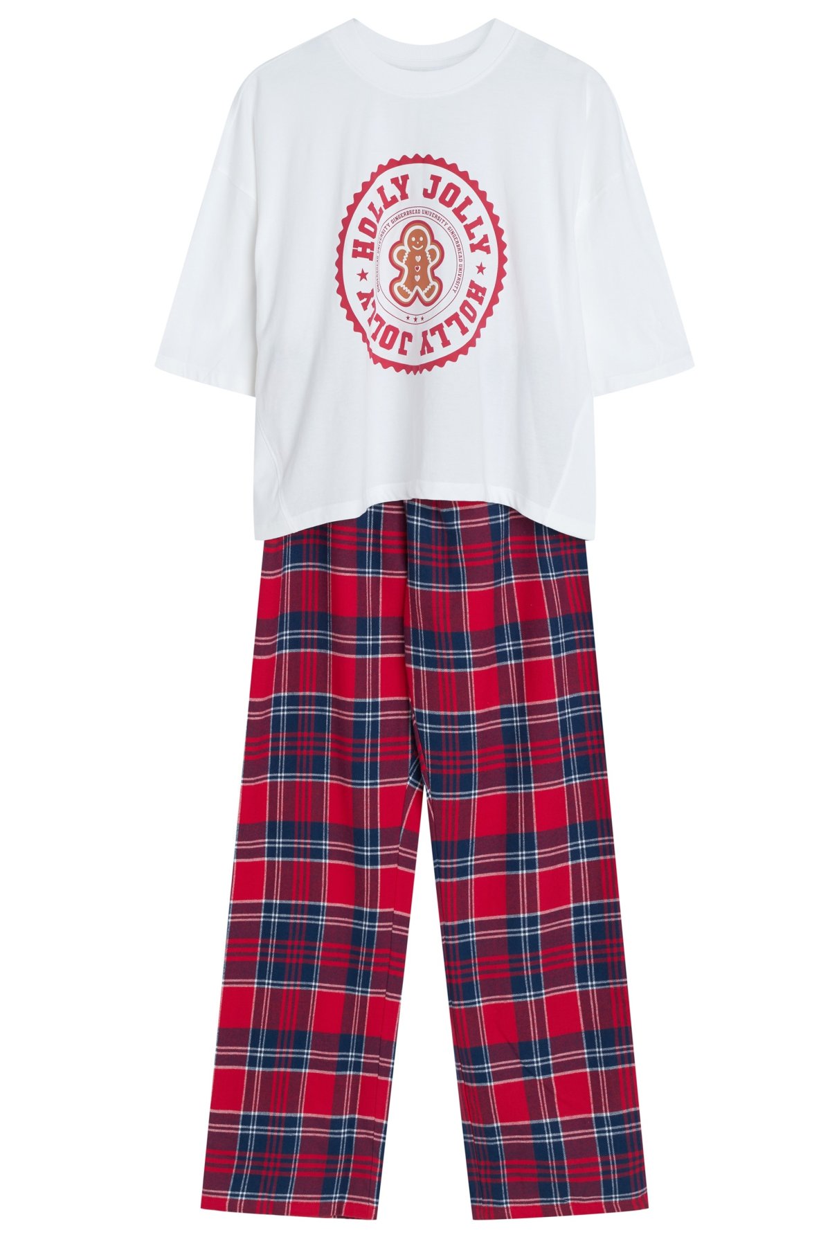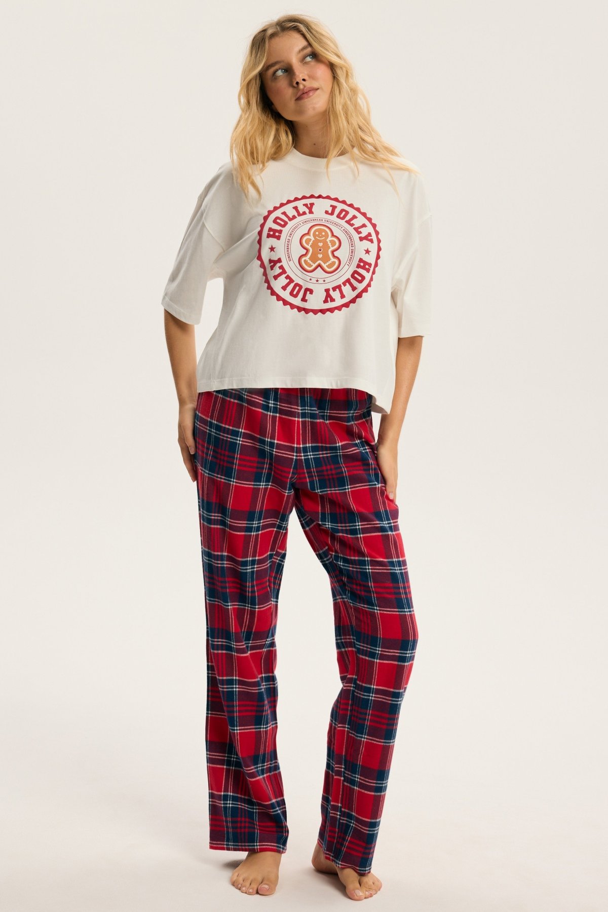 Dámské pyžamo CandyCane vnáší do zimních večerů hřejivou sváteční atmosféru. Horní díl z měkké bavlny v krémovém odstínu zdobí potisk pana perníčka a nápis Holly Jolly, který evokuje pohodu a radost Vánoc. Kostkované červené kalhoty s elastickým pasem doplňují celý set o retro nádech. Volný střih a příjemný materiál zaručují komfort během spánku i při domácím lenošení. Perfektní volba na zimní období – pro sebe i jako milý dárek.