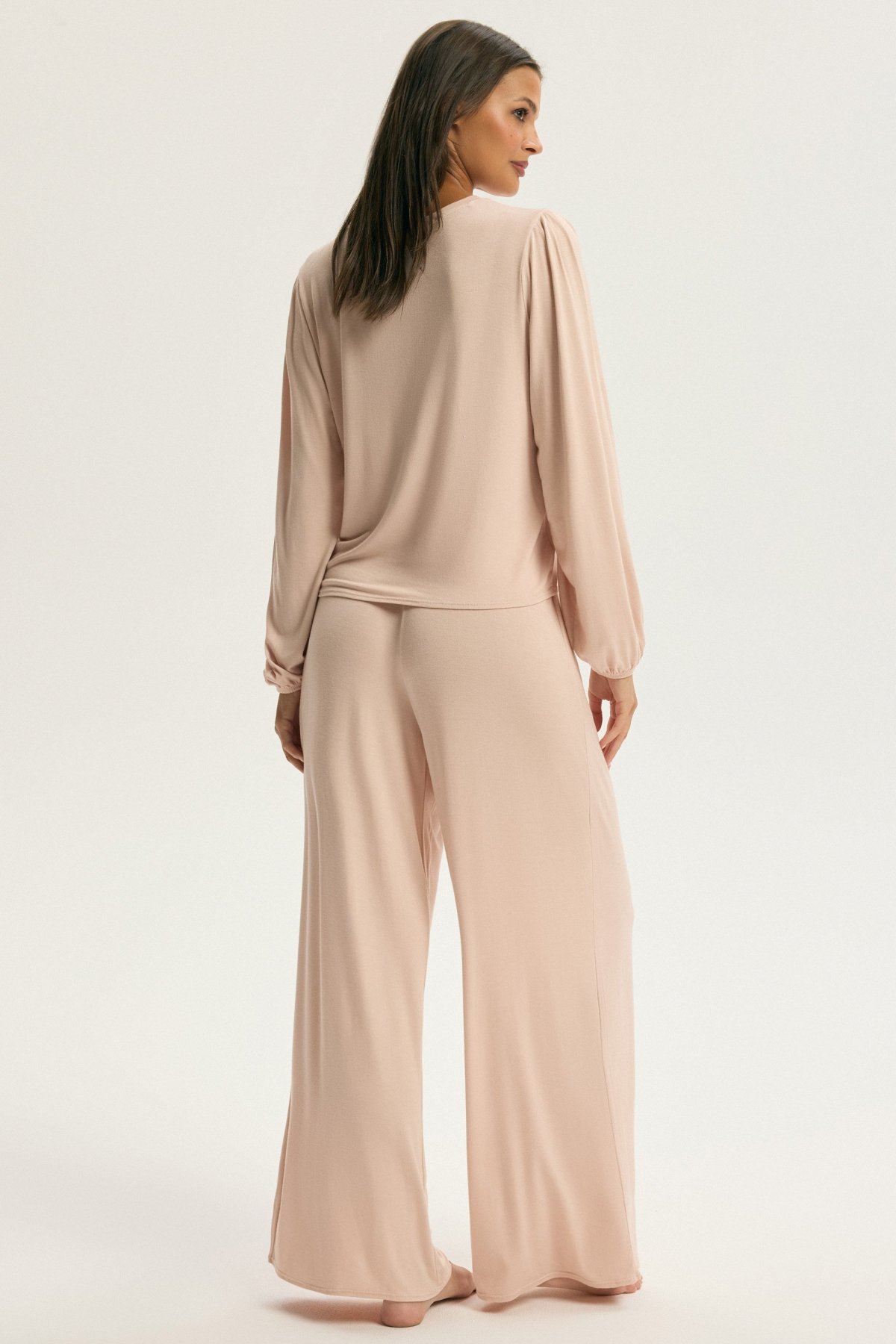 Dámské pyžamo Carmona přináší dokonalou rovnováhu mezi elegancí a komfortem. Vyrobené z měkké viskózy, příjemně hladí pokožku a zajišťuje celonoční pohodlí. Vrchní díl s dlouhými rukávy má volnější střih, jemné řasení v oblasti ramen dodává celku ženský a sofistikovaný nádech. Dlouhé kalhoty s rovným střihem opticky prodlužují siluetu a díky elastickému pasu zaručují volnost pohybu. Pyžamo působí klidně, útulně a nadčasově – ideální pro chladnější večery i pomalá víkendová rána. V tomto modelu se elegance snoubí s přirozeností a každý dotek látky přináší pocit měkkosti a harmonie.