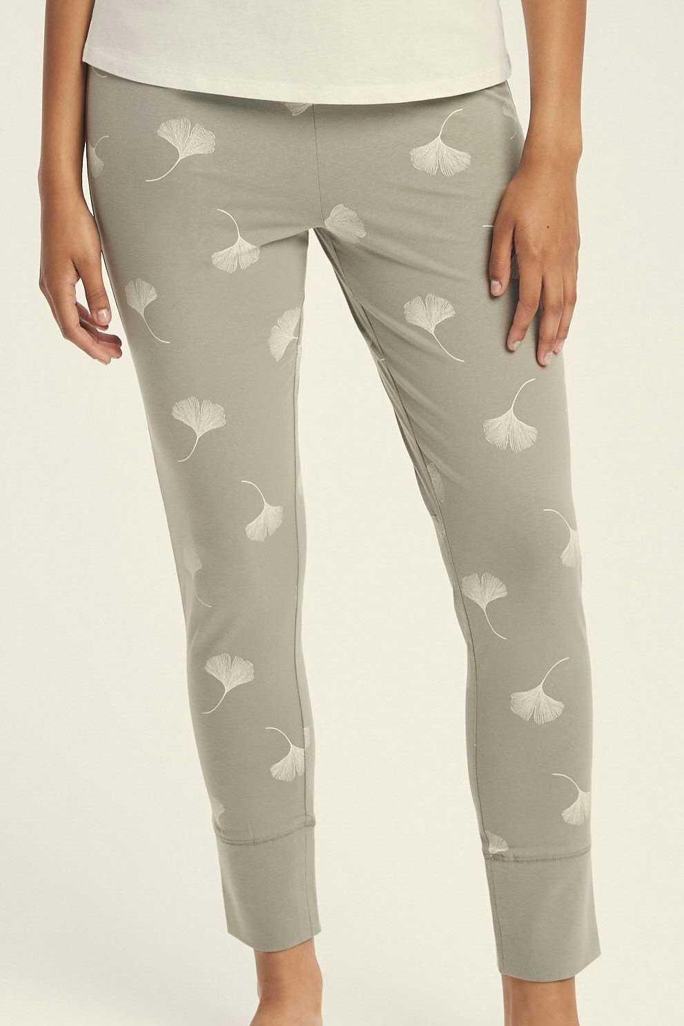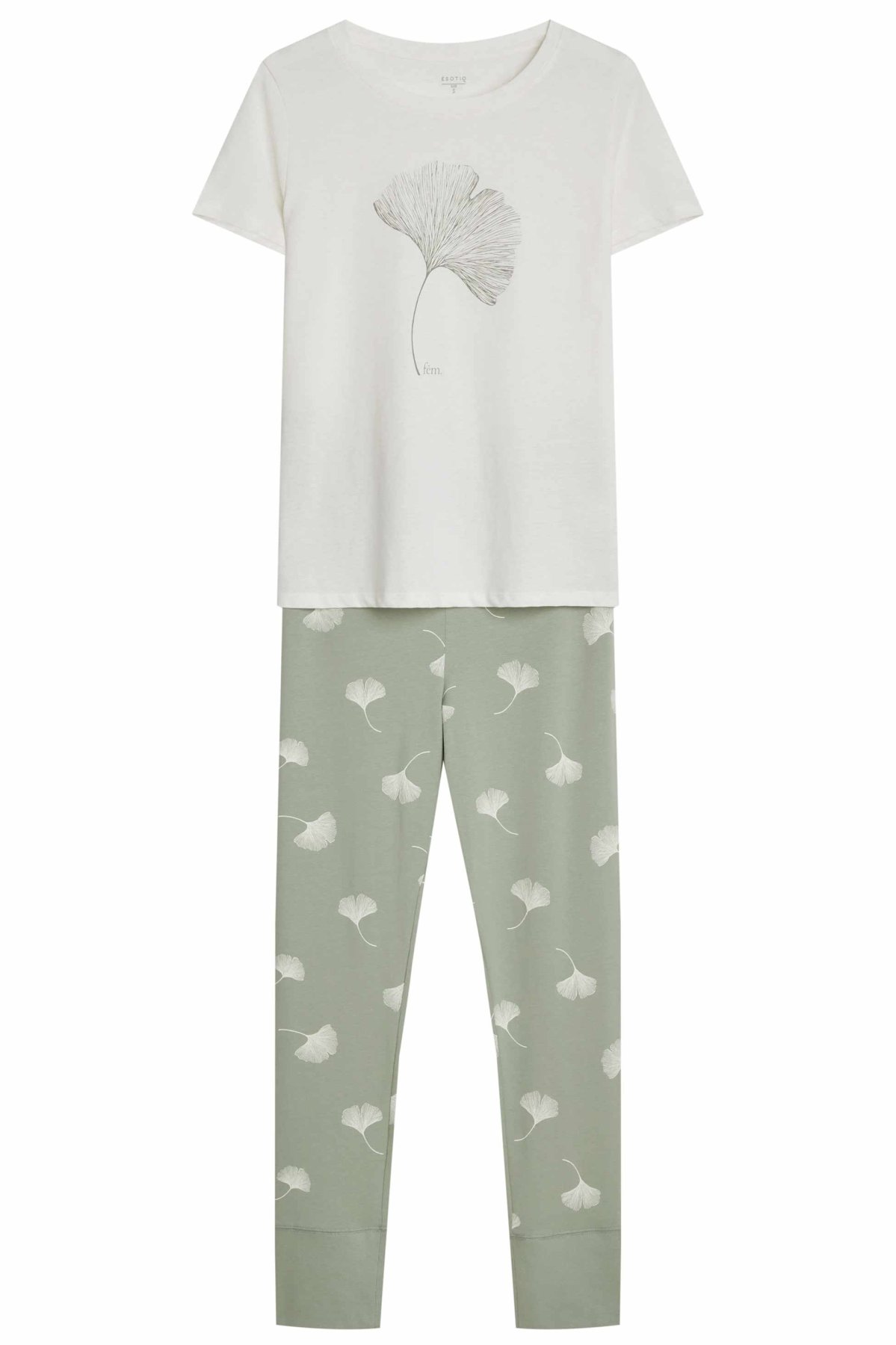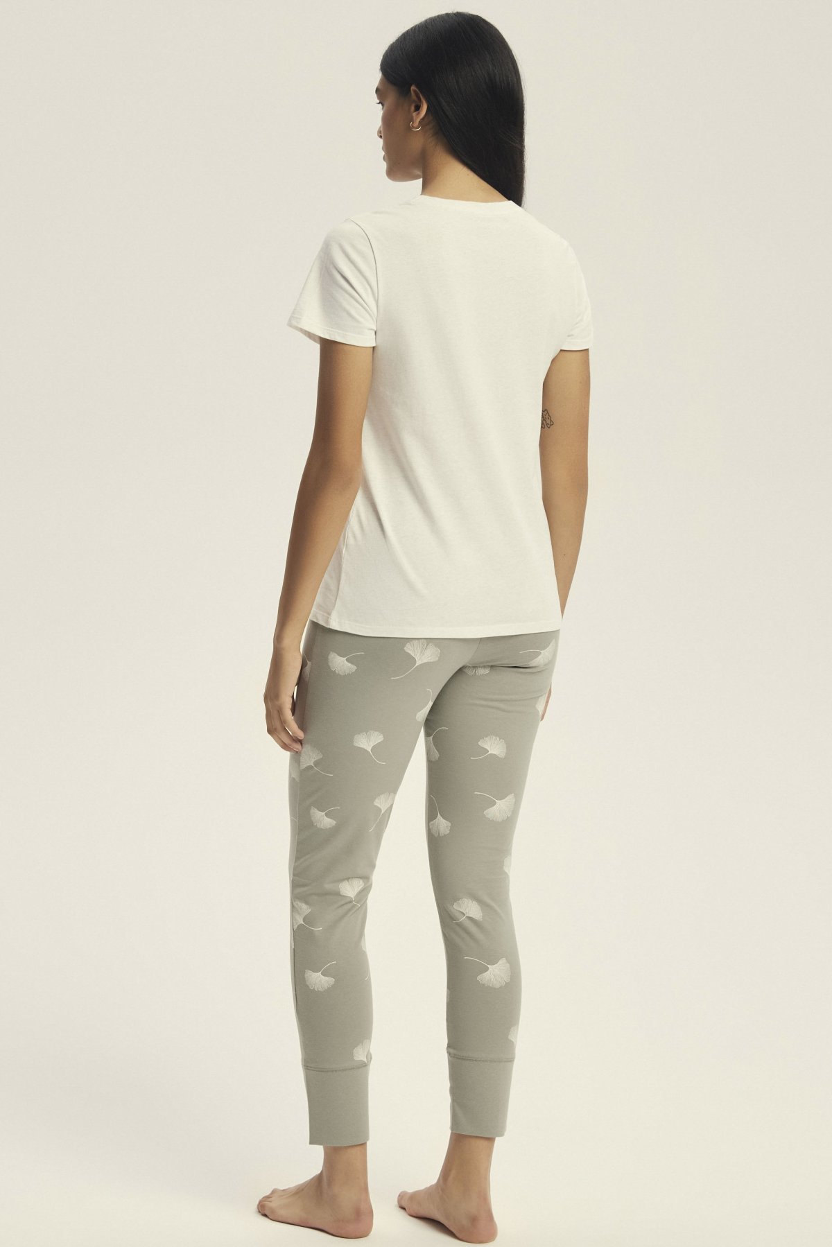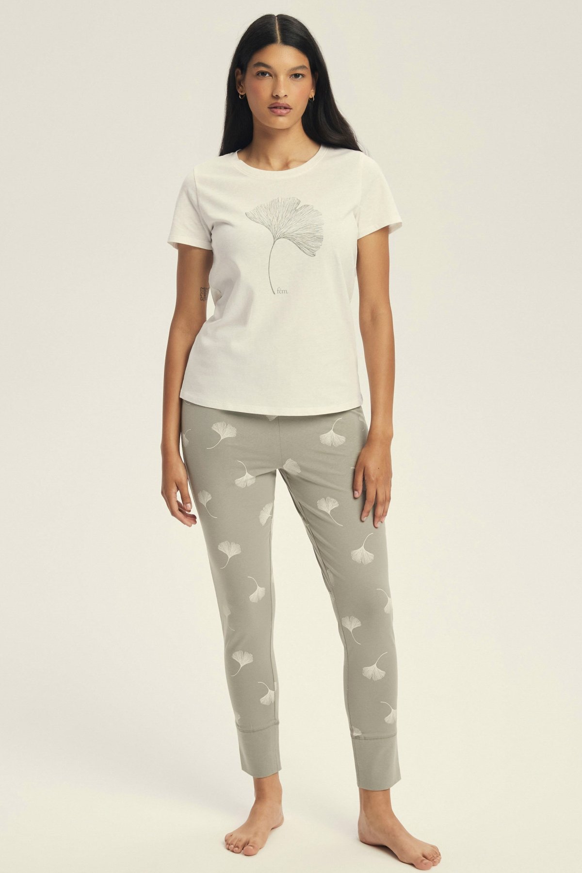 Jemné dámské pyžamo Cervia v odstínu ecru je kombinací přirozeného komfortu a decentního stylu. Měkká bavlna zahalí tělo do hebkosti a tepla, zatímco rostlinný motiv na horním dílu dodává celku ženský půvab. Dlouhé kalhoty se zúženým střihem směrem ke kotníkům ladně doplňují triko, čímž vzniká harmonický, ucelený komplet ideální na chladnější večery i víkendové ráno.