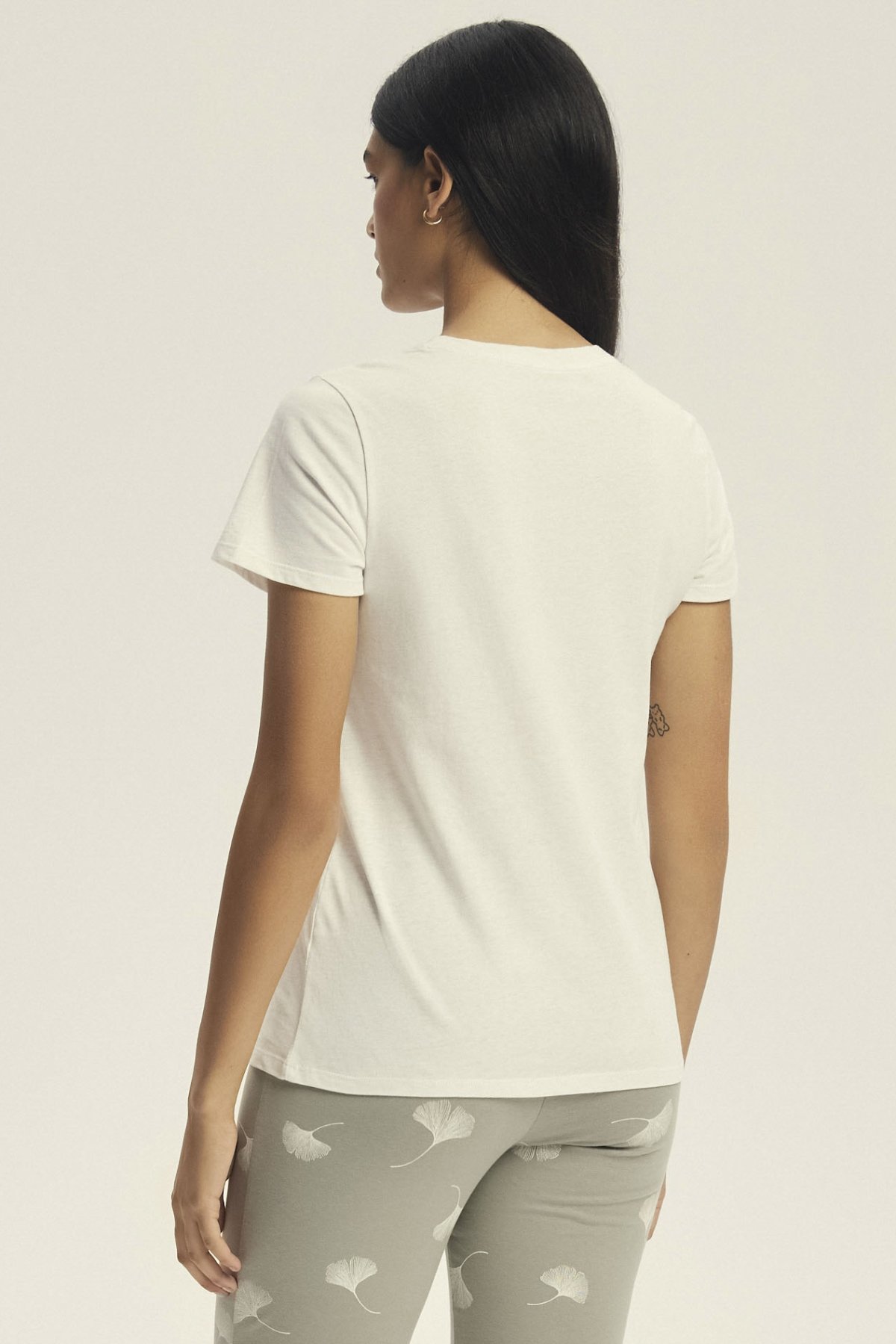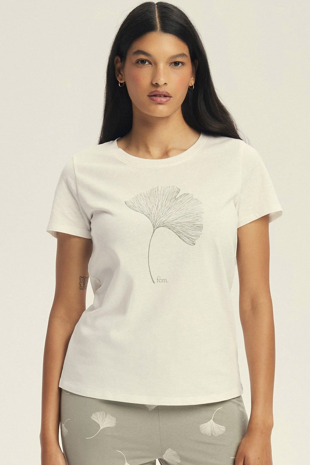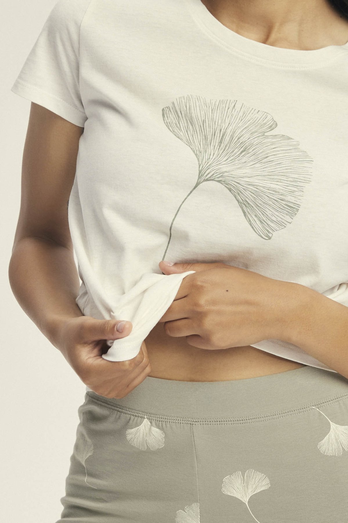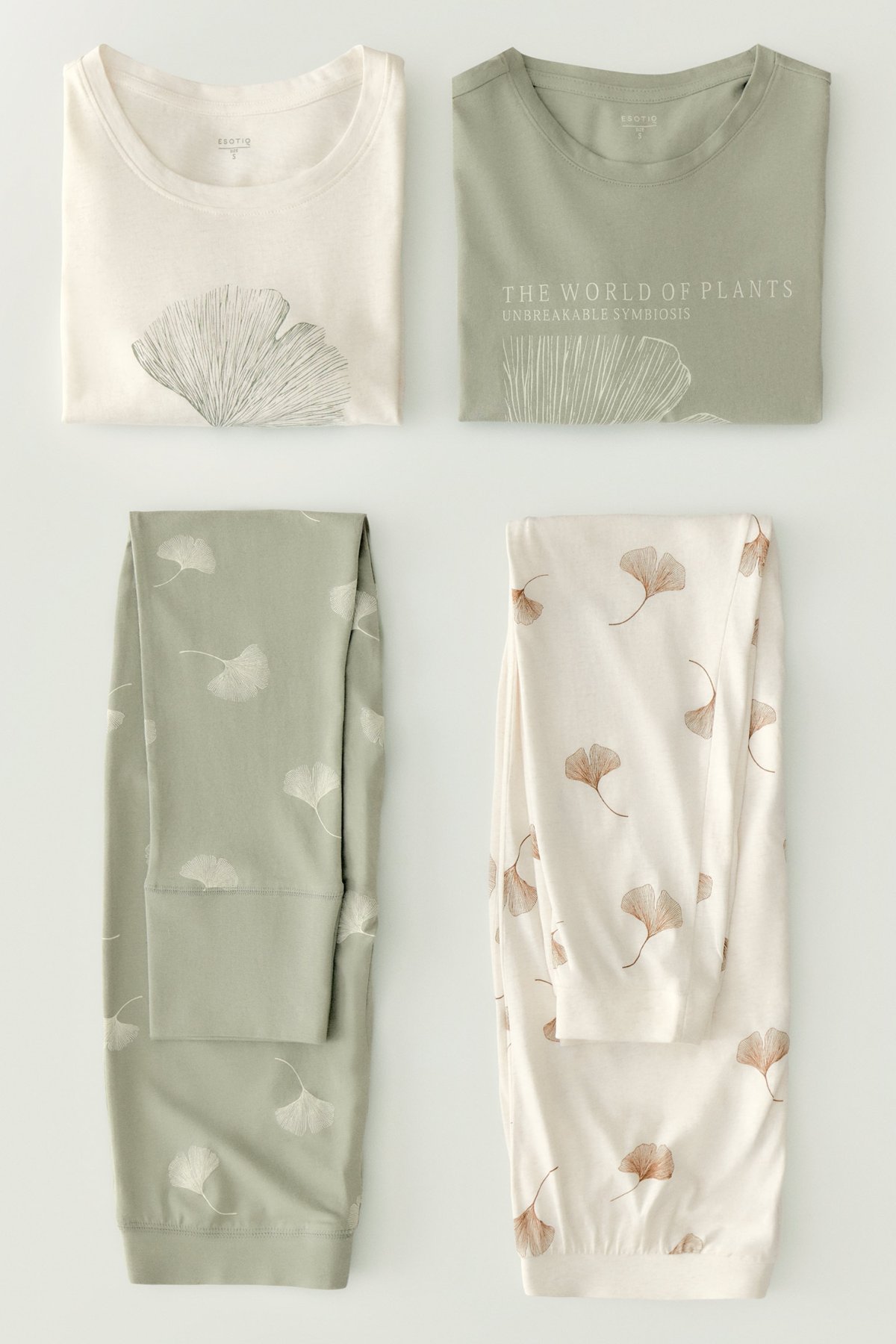 Jemné dámské pyžamo Cervia v odstínu ecru je kombinací přirozeného komfortu a decentního stylu. Měkká bavlna zahalí tělo do hebkosti a tepla, zatímco rostlinný motiv na horním dílu dodává celku ženský půvab. Dlouhé kalhoty se zúženým střihem směrem ke kotníkům ladně doplňují triko, čímž vzniká harmonický, ucelený komplet ideální na chladnější večery i víkendové ráno.