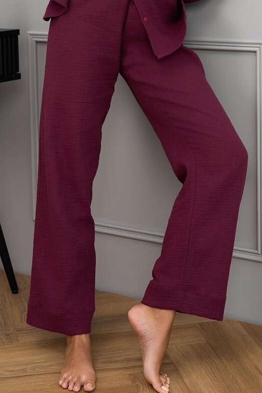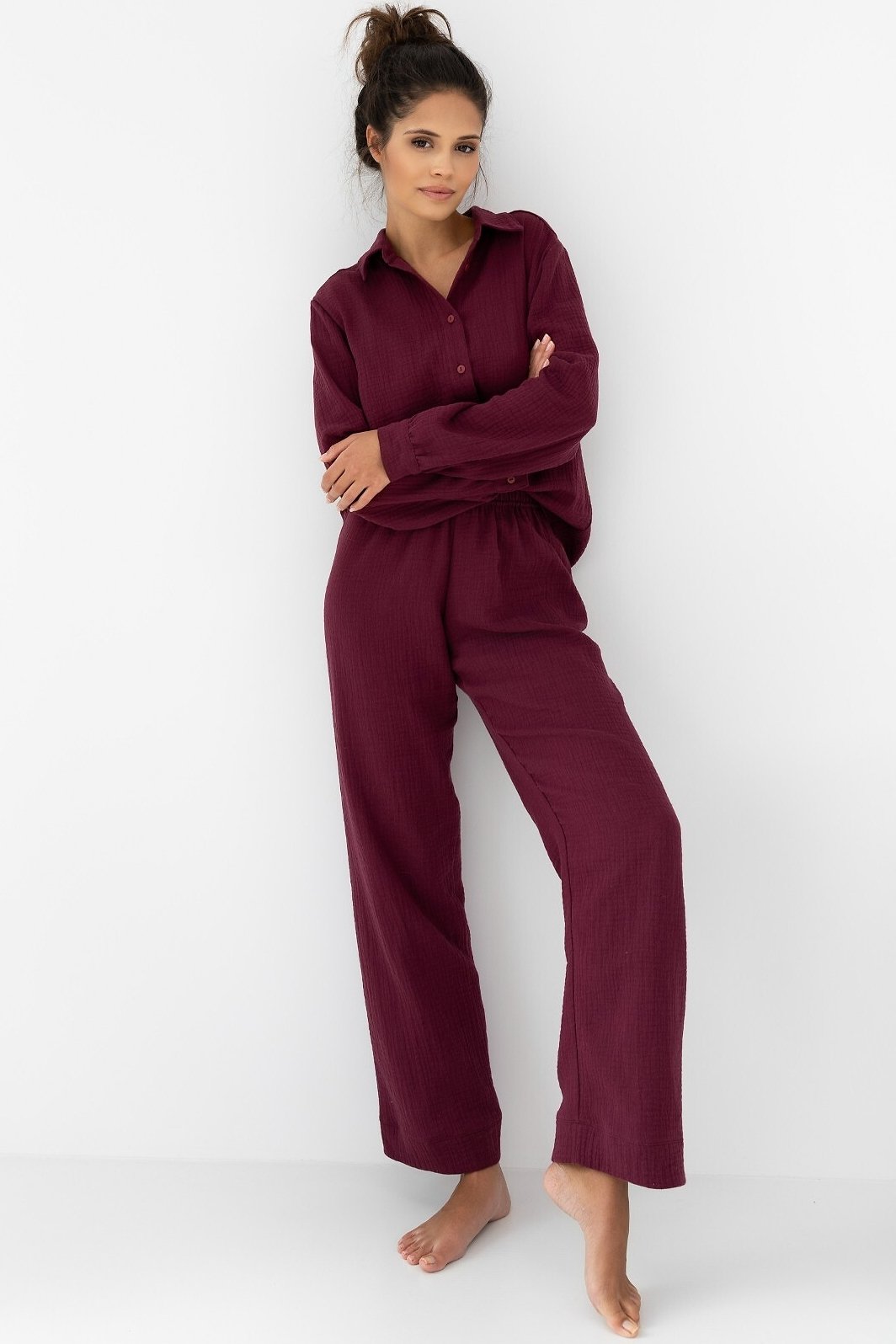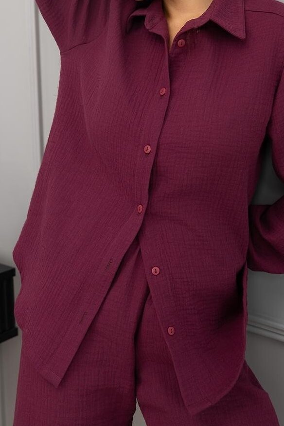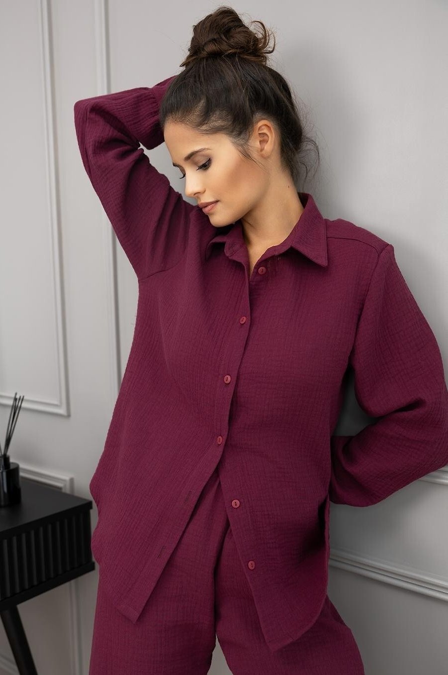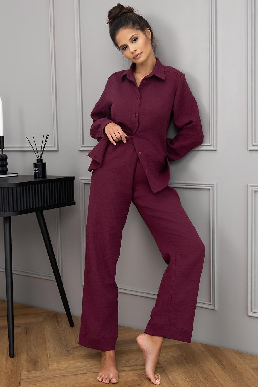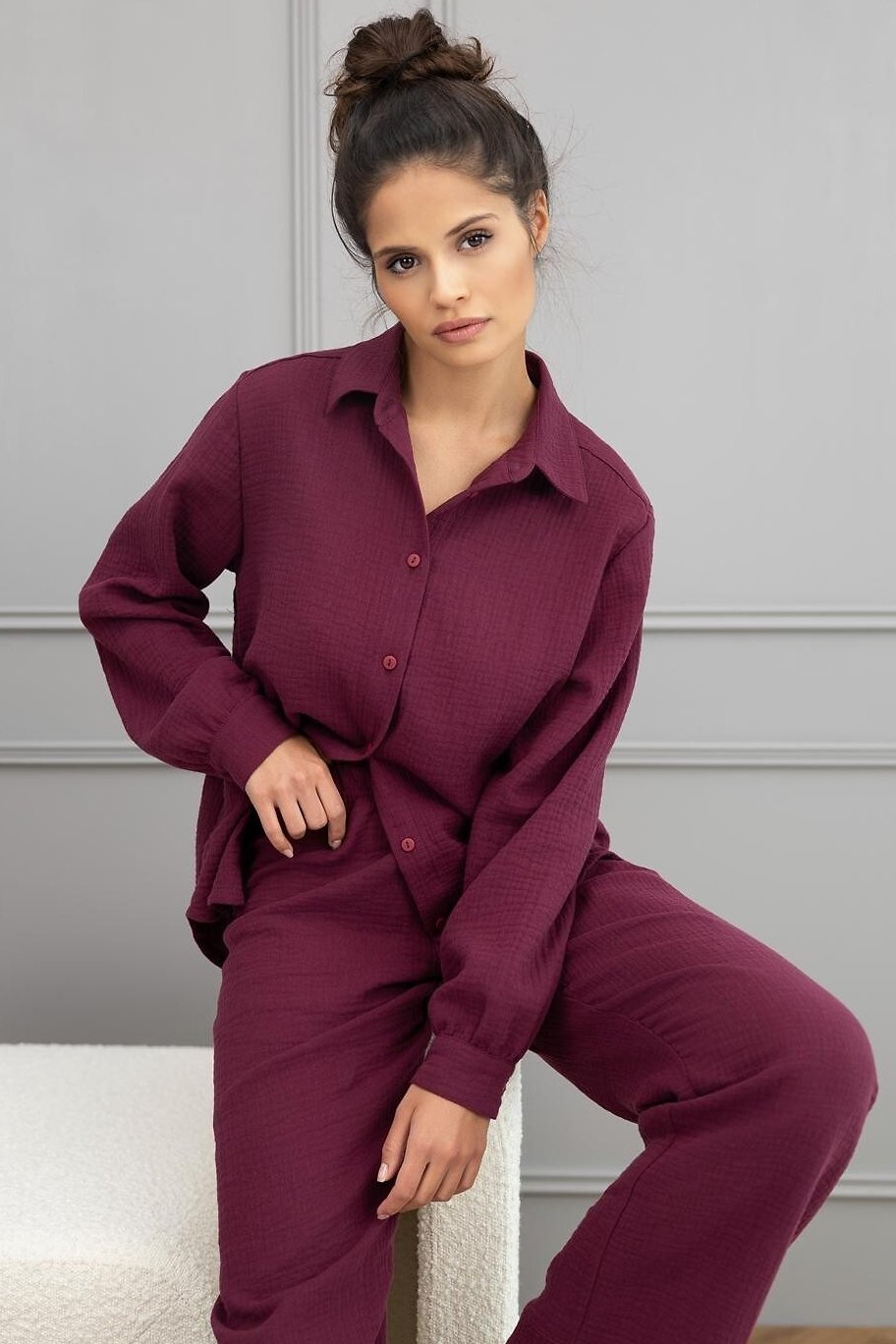Toto dámské pyžamo z mušelínu je dokonalou kombinací lehkosti, komfortu a elegance. Mušelínový materiál je příjemně prodyšný, jemný na dotek a skvělý pro klidný spánek i domácí pohodu. Horní díl tvoří rozepínací košile s límečkem, která působí elegantně a díky dlouhým rukávům s manžetami je i praktická. Spodní díl představují volné kalhoty s dlouhými nohavicemi a pružnou gumou v pase, která zajišťuje maximální pohodlí a volnost pohybu. Jednobarevný design v sytém odstínu dodává pyžamu stylový a nadčasový vzhled. Perfektní volba pro ženy, které chtějí spojit pohodlí s jemnou elegancí.