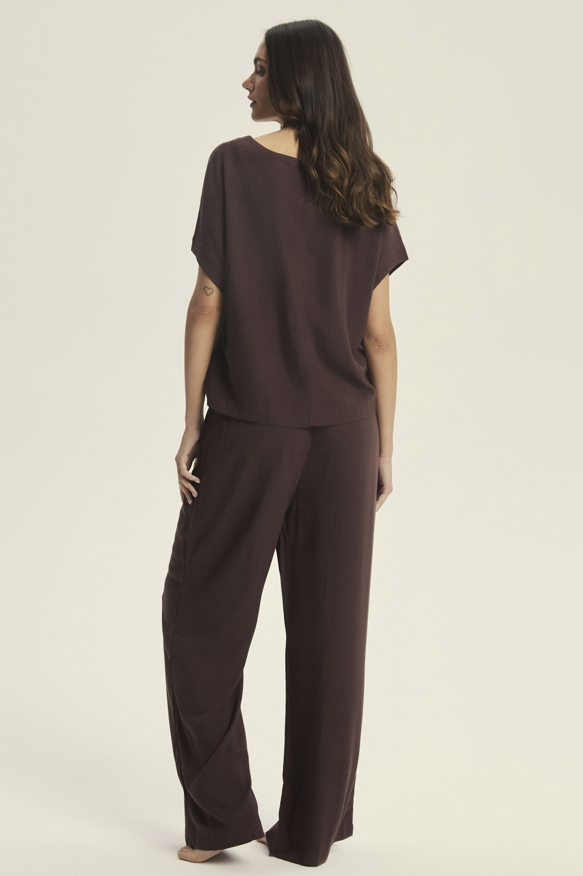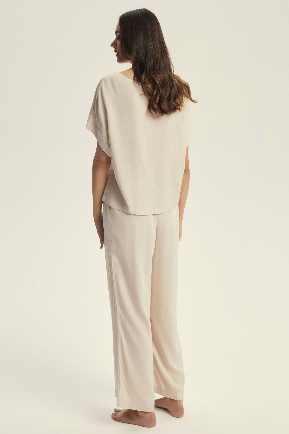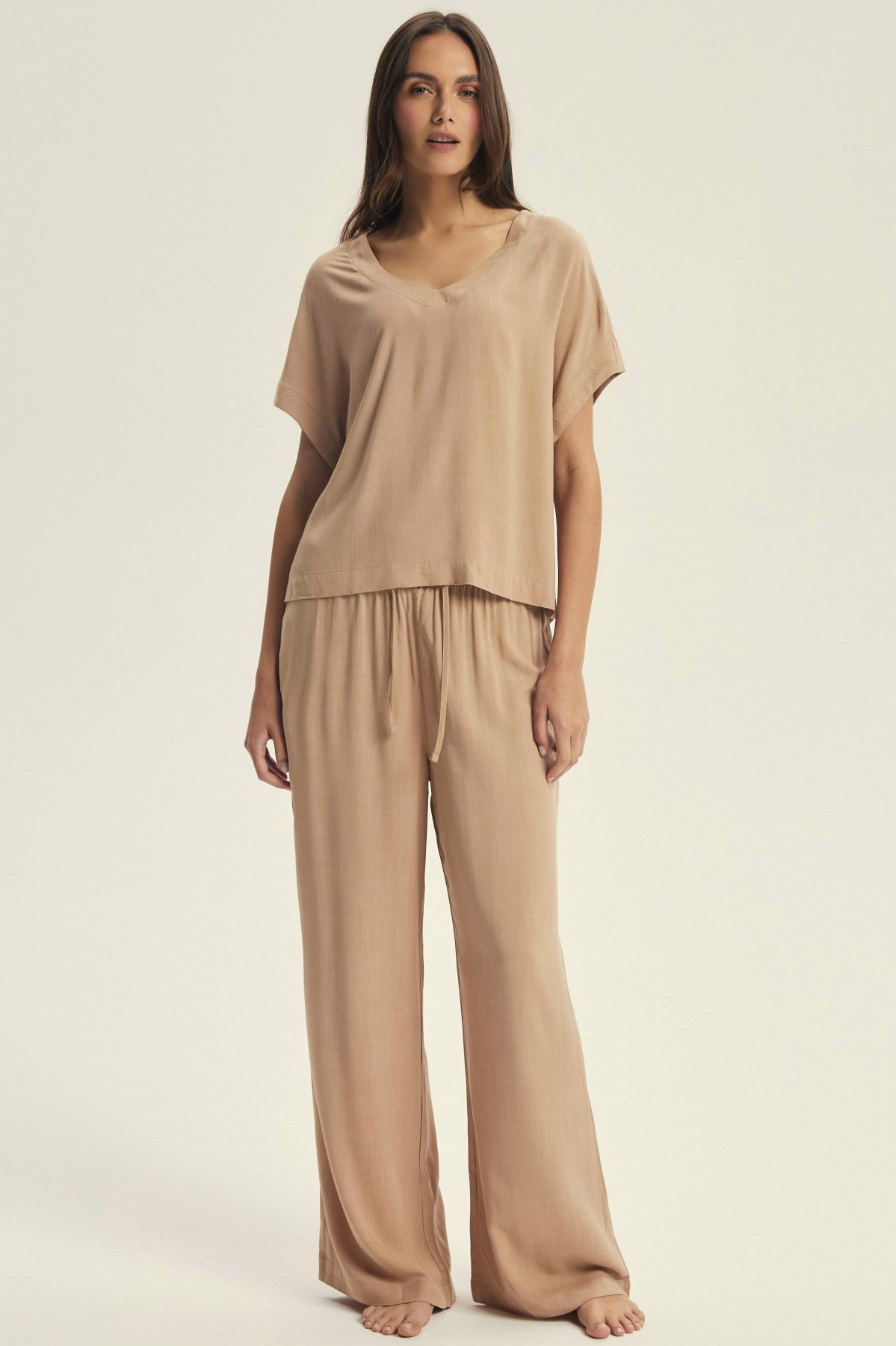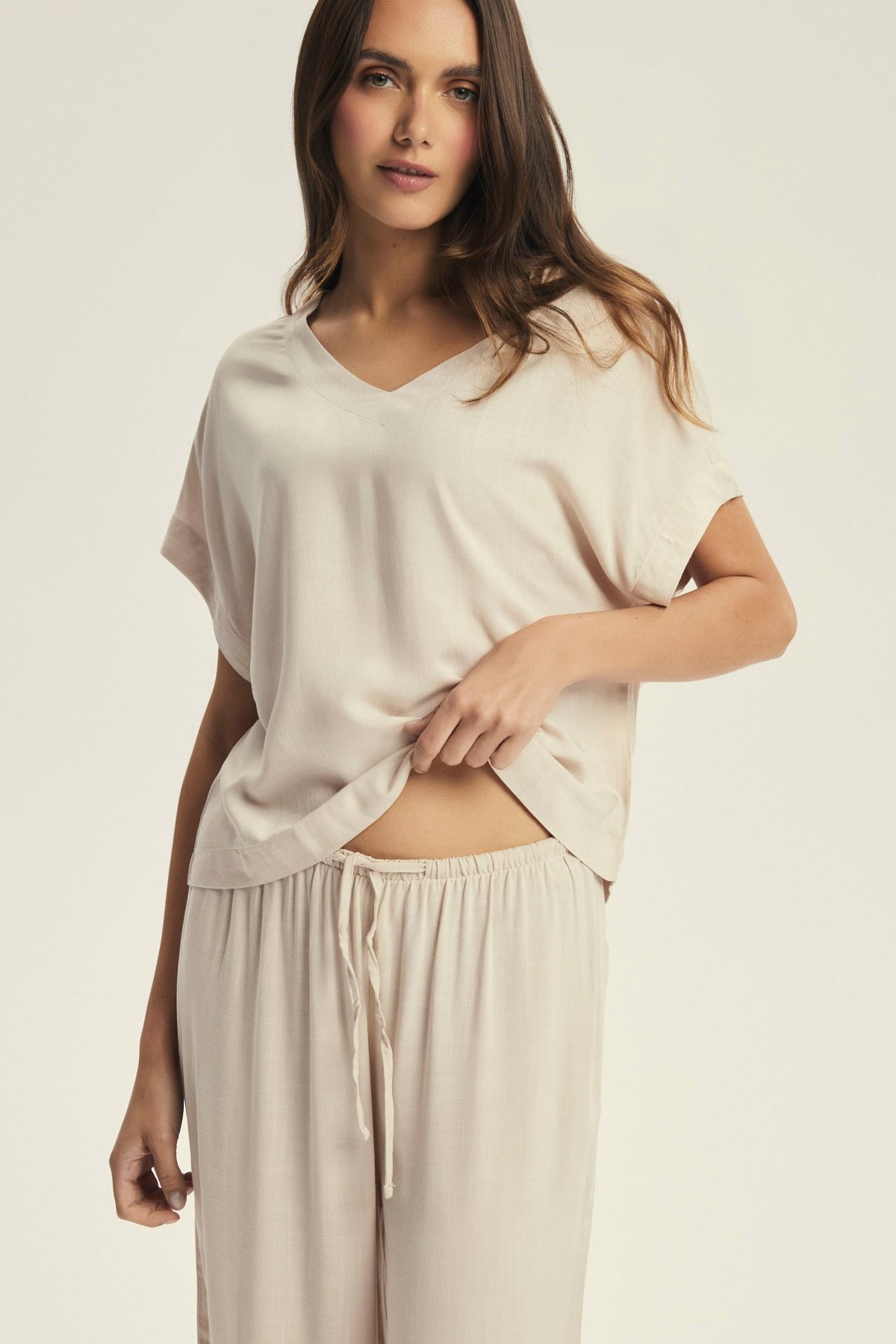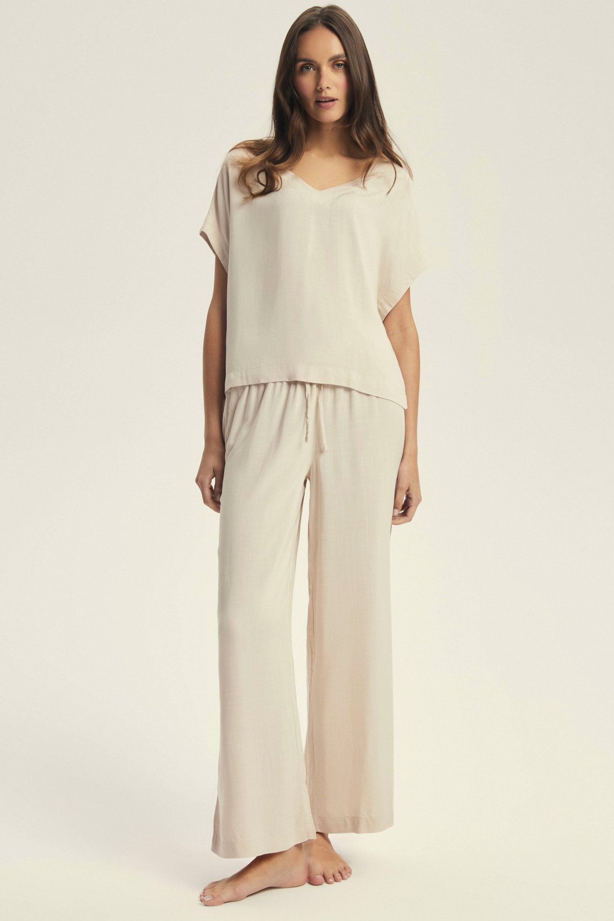 Dámské pyžamo Corenso představuje spojení přirozené ženskosti a jemného luxusu. Je vyrobené z viskózy, působí na těle jako chladivý dotek. Lehká halenka s krátkým rukávem a výstřihem do „V“ ladně splývá po siluetě, dlouhé volné kalhoty s rovným střihem doplňuje praktické zavazování v pase. Decentní, minimalistický vzhled s nádechem romantiky dělá z modelu Corenso ideální volbu pro ženy, které chtějí vypadat elegantně i doma.