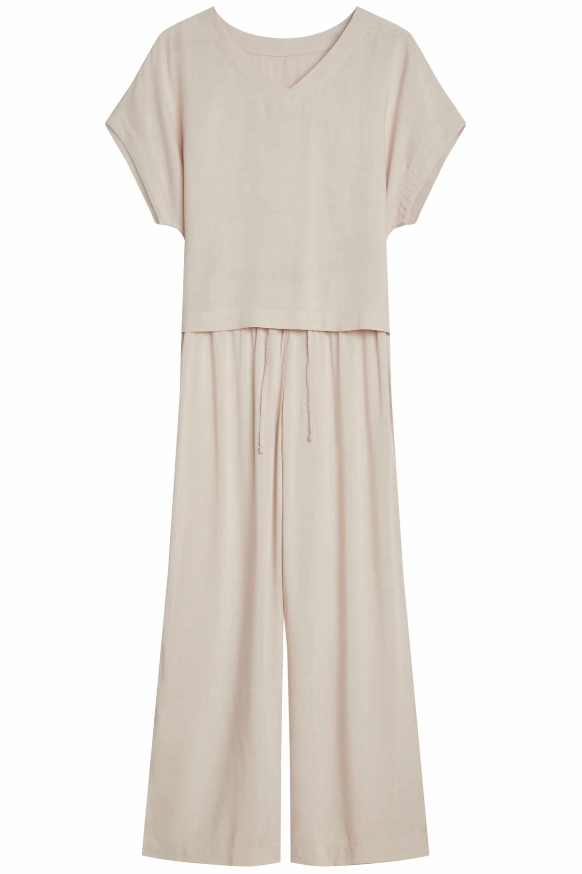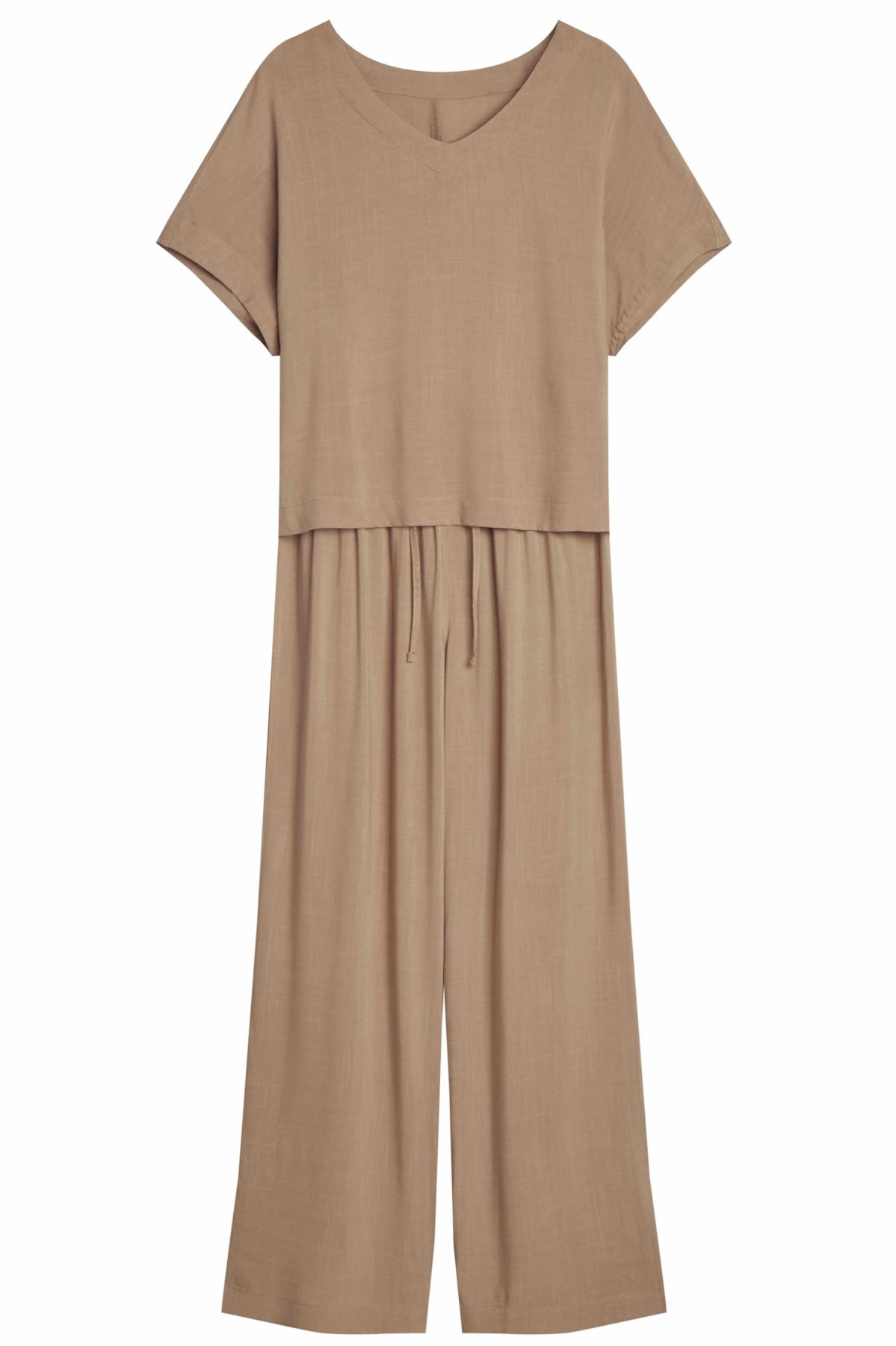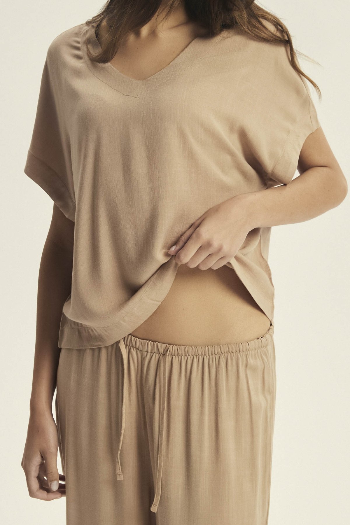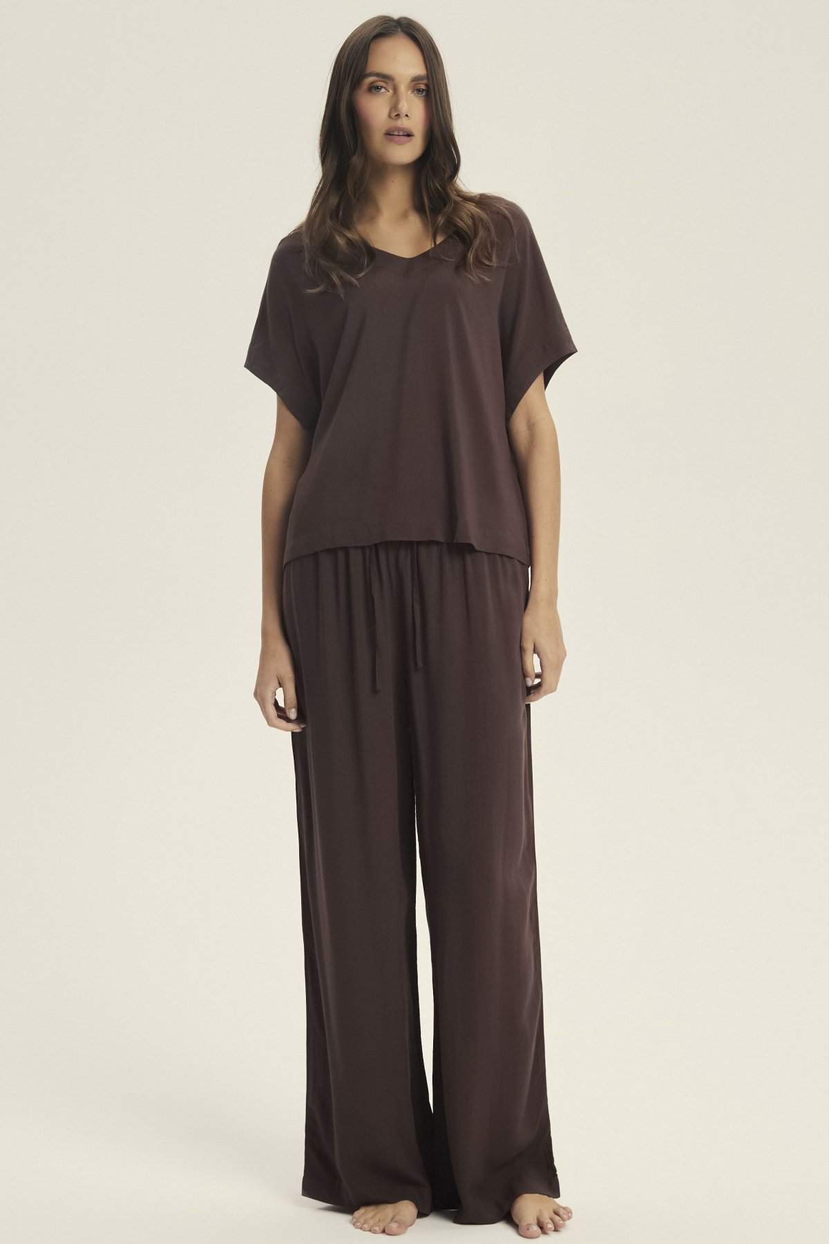 Dámské pyžamo Corenso představuje spojení přirozené ženskosti a jemného luxusu. Je vyrobené z viskózy, působí na těle jako chladivý dotek. Lehká halenka s krátkým rukávem a výstřihem do „V“ ladně splývá po siluetě, dlouhé volné kalhoty s rovným střihem doplňuje praktické zavazování v pase. Decentní, minimalistický vzhled s nádechem romantiky dělá z modelu Corenso ideální volbu pro ženy, které chtějí vypadat elegantně i doma.