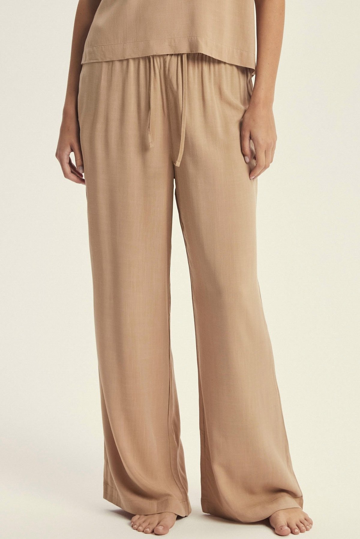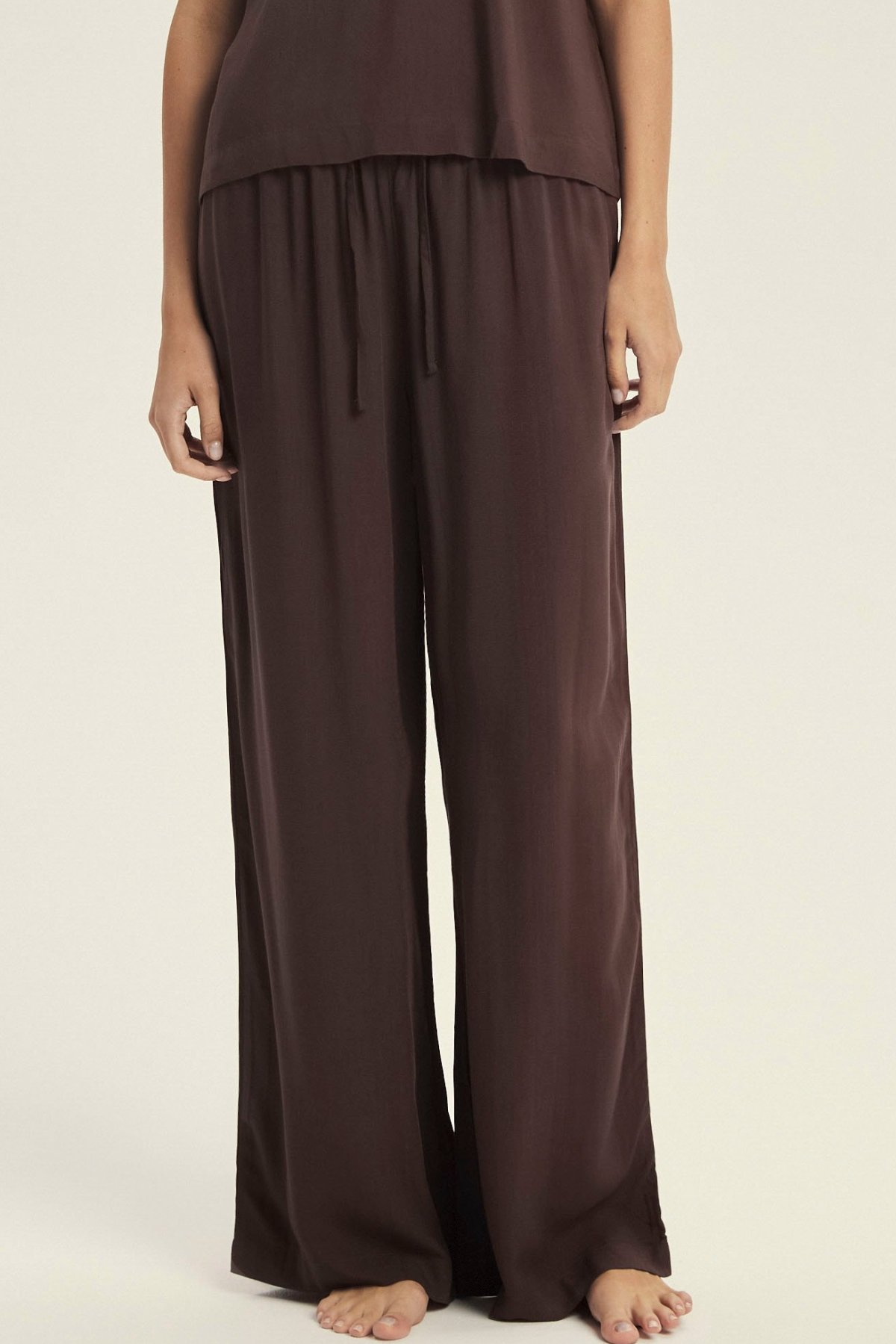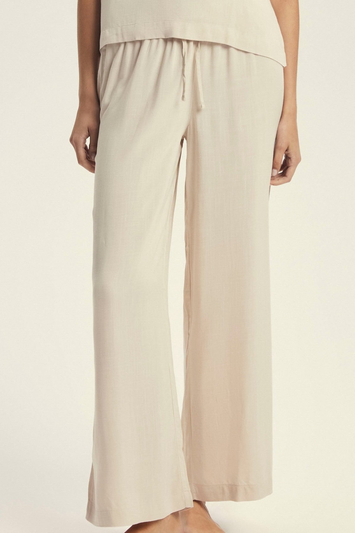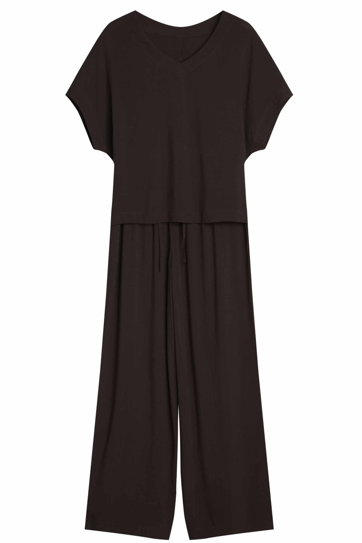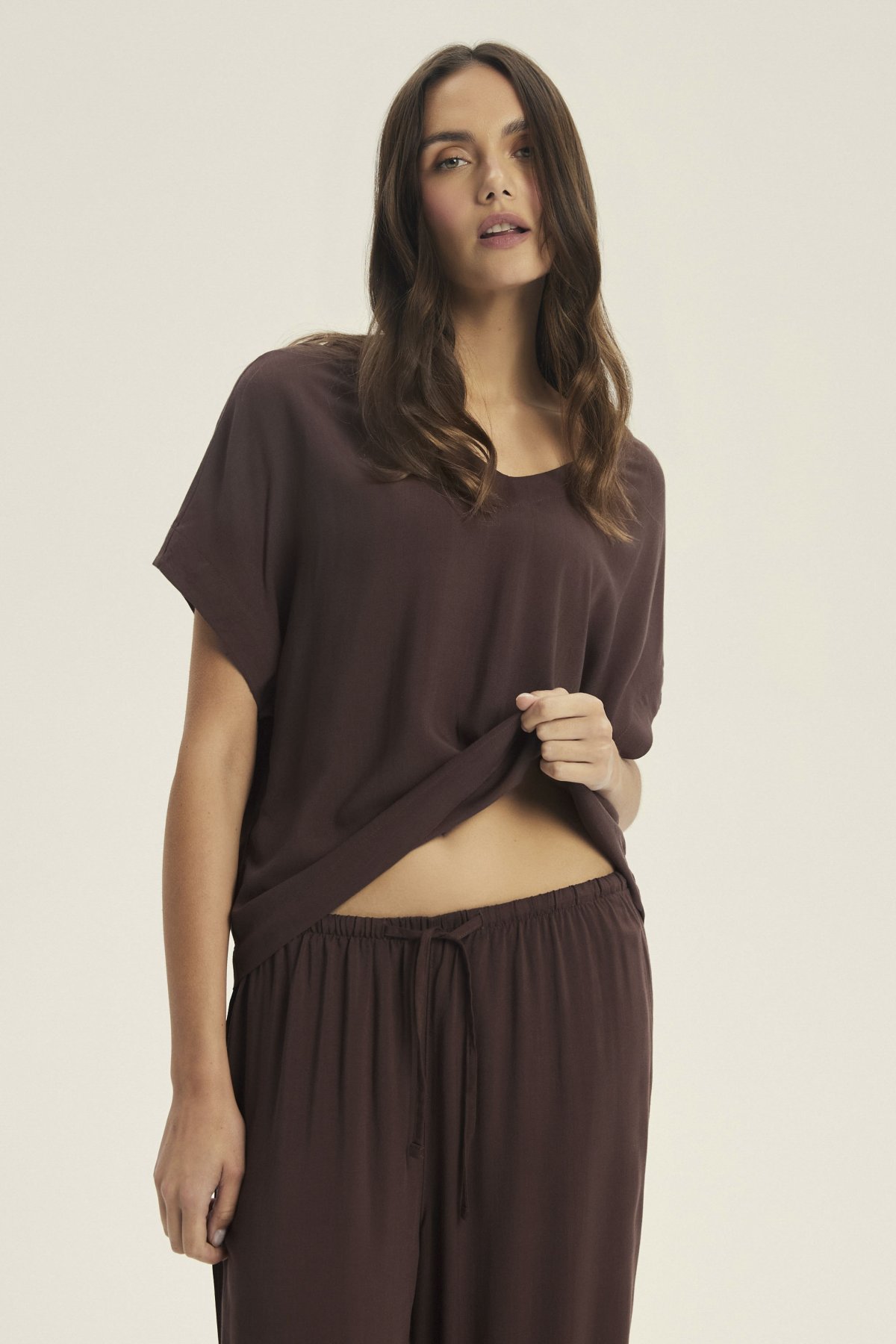 Dámské pyžamo Corenso představuje spojení přirozené ženskosti a jemného luxusu. Je vyrobené z viskózy, působí na těle jako chladivý dotek. Lehká halenka s krátkým rukávem a výstřihem do „V“ ladně splývá po siluetě, dlouhé volné kalhoty s rovným střihem doplňuje praktické zavazování v pase. Decentní, minimalistický vzhled s nádechem romantiky dělá z modelu Corenso ideální volbu pro ženy, které chtějí vypadat elegantně i doma.