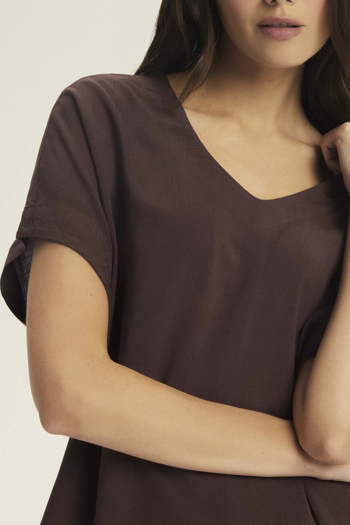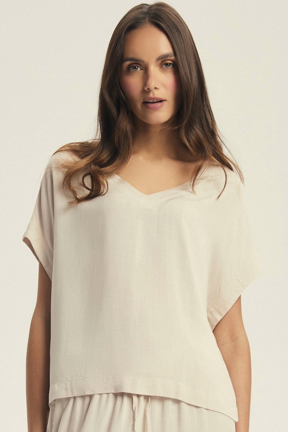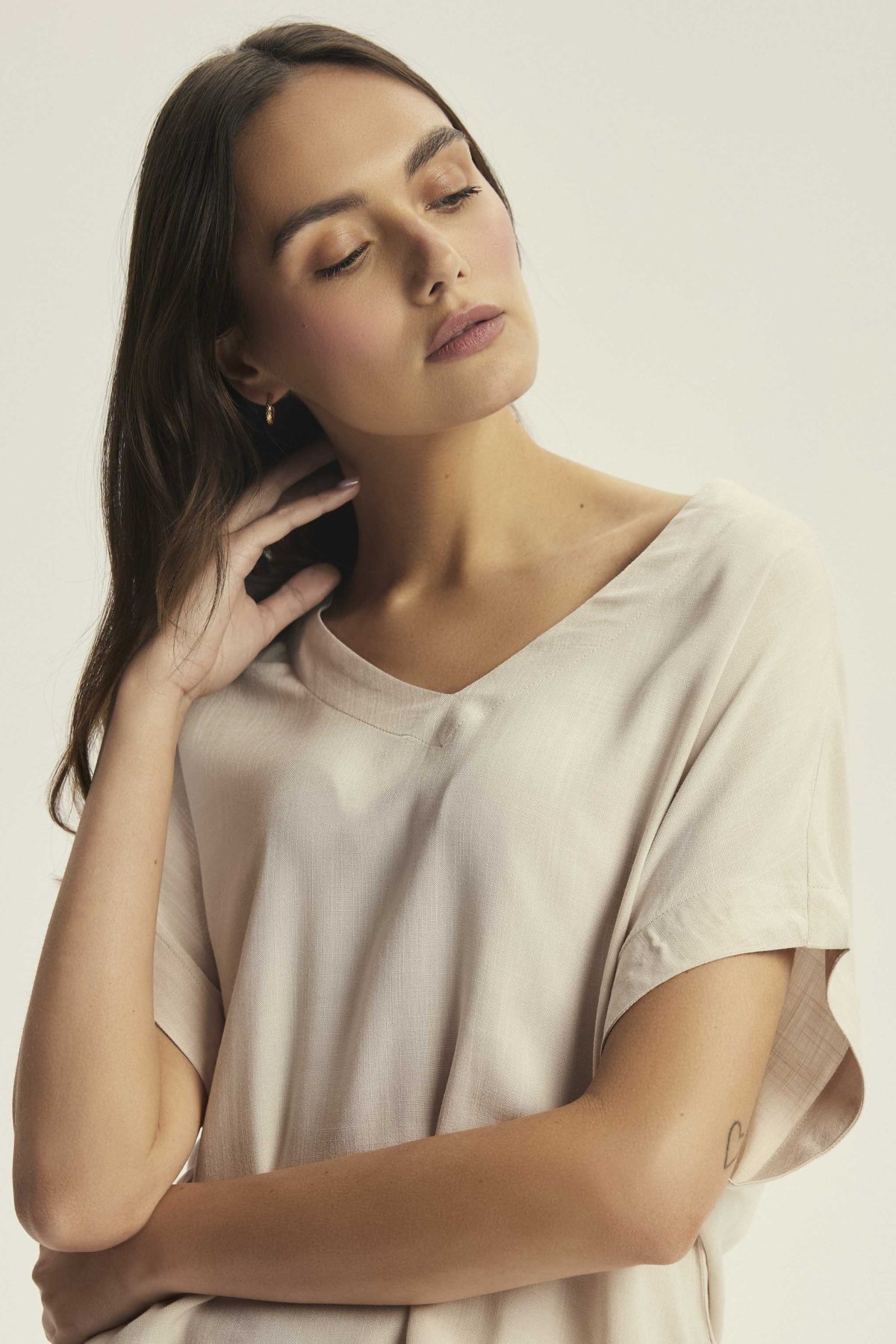 - volná halenka s krátkým rukávem a výstřihem do „V“