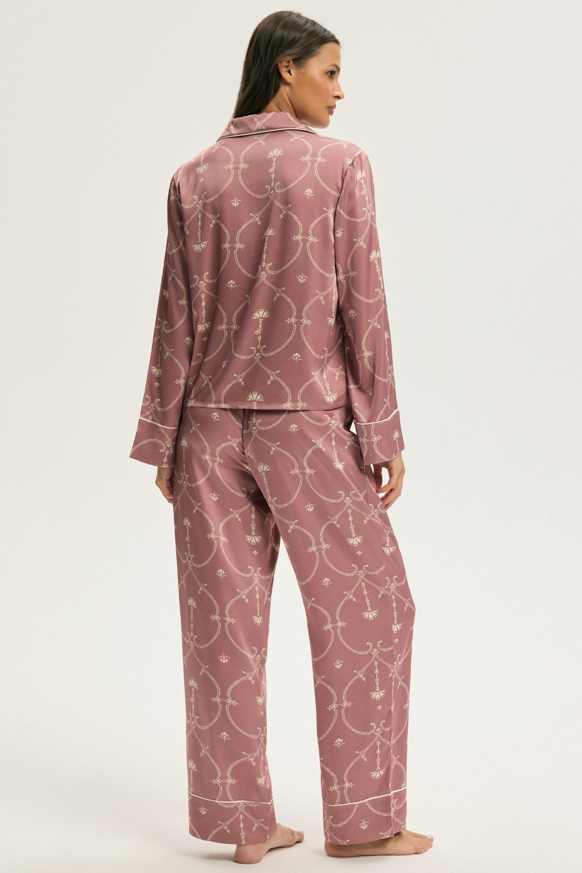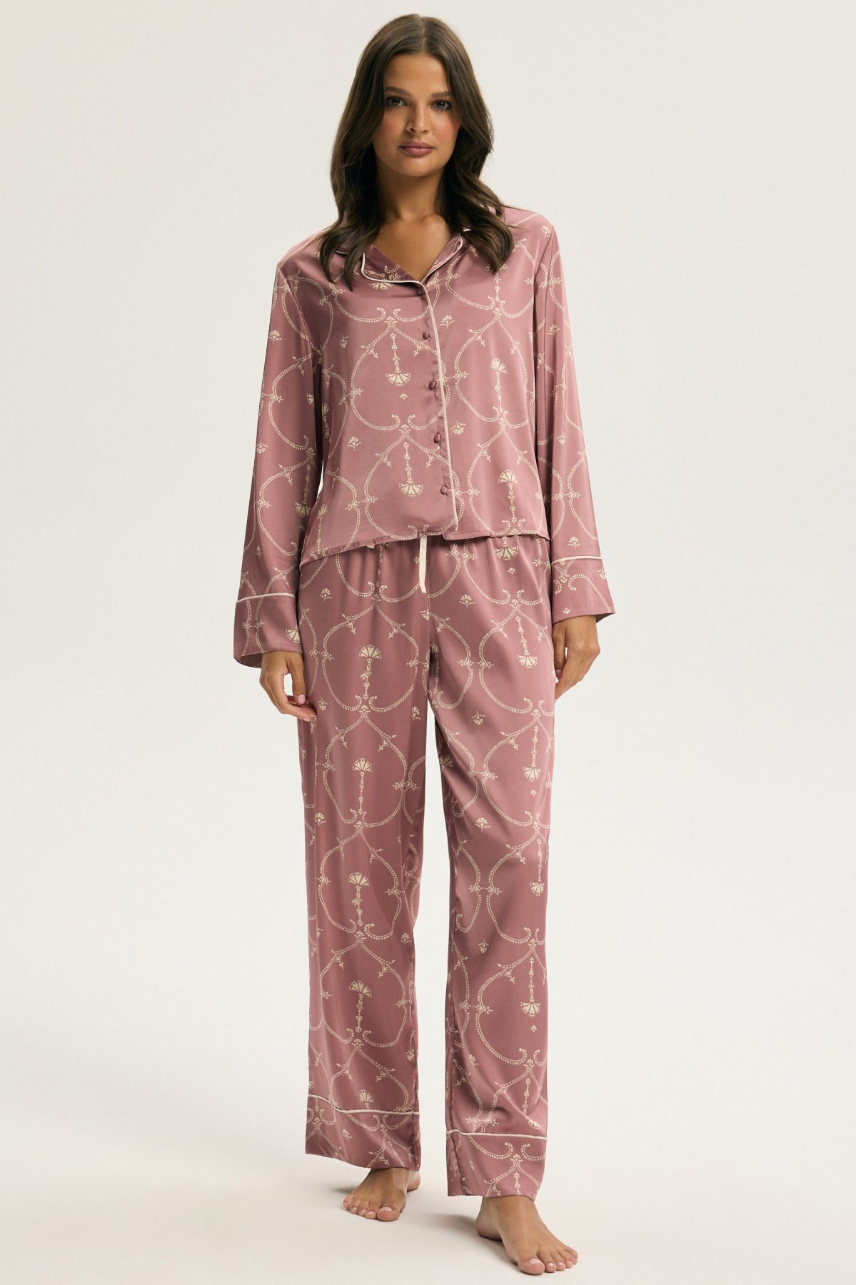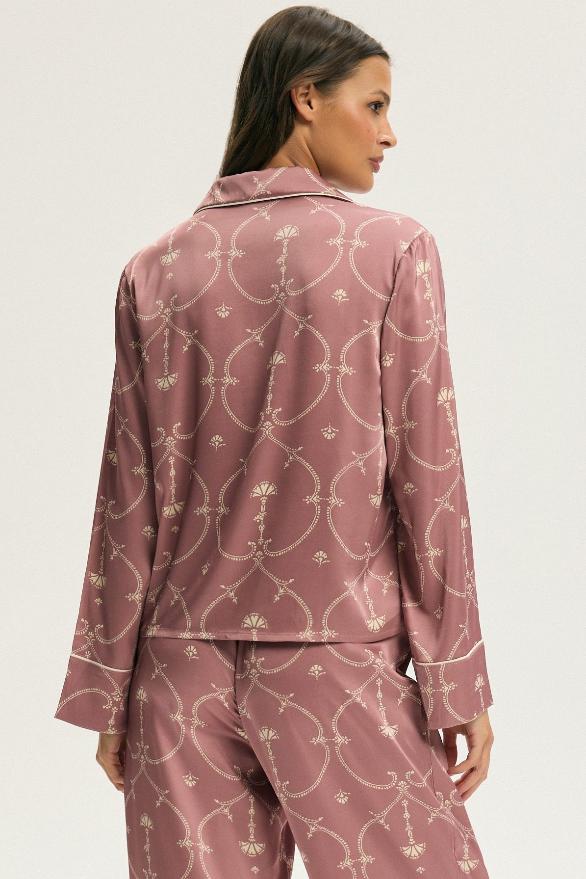Dámské pyžamo Cosmati představuje spojení klasické elegance a ženského šarmu. Hebký satén s jemným leskem lehce klouže po pokožce, vytváří pocit luxusu a dokonale se přizpůsobí pohybu těla. Košile s límečkem a zapínáním dodává celku noblesu. Dlouhé kalhoty s volným střihem a stahováním v pase zajišťují maximální komfort. Dekorativní květinový motiv působí něžně a zvýrazňuje jemnost materiálu. Celý komplet doplňuje elegantní lemování.
