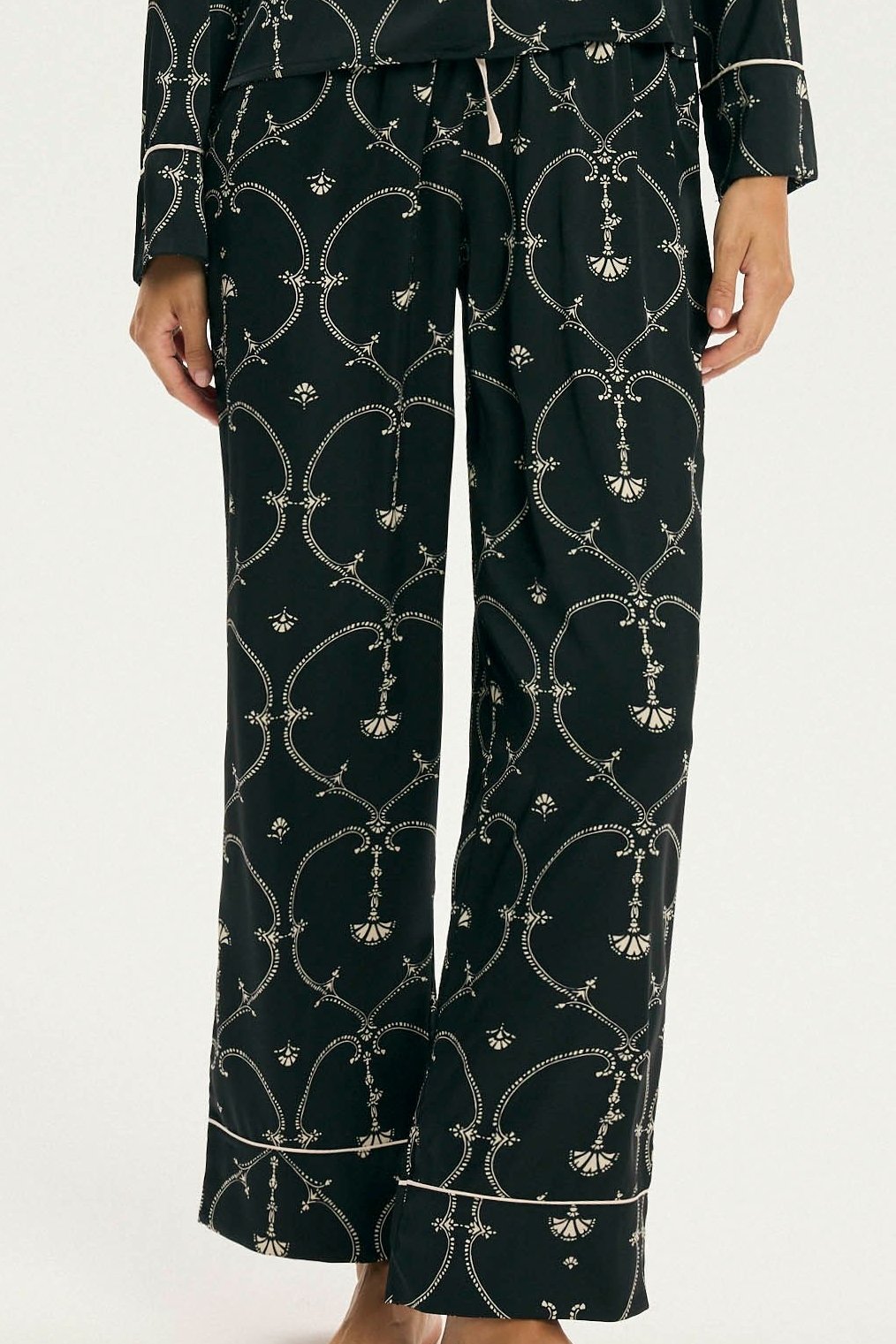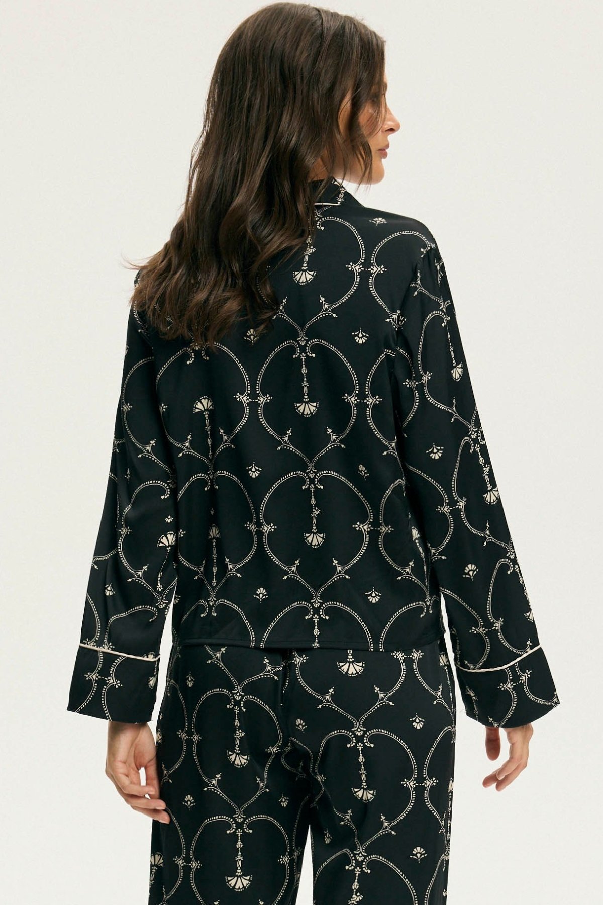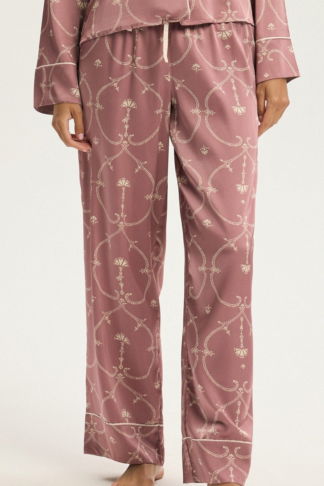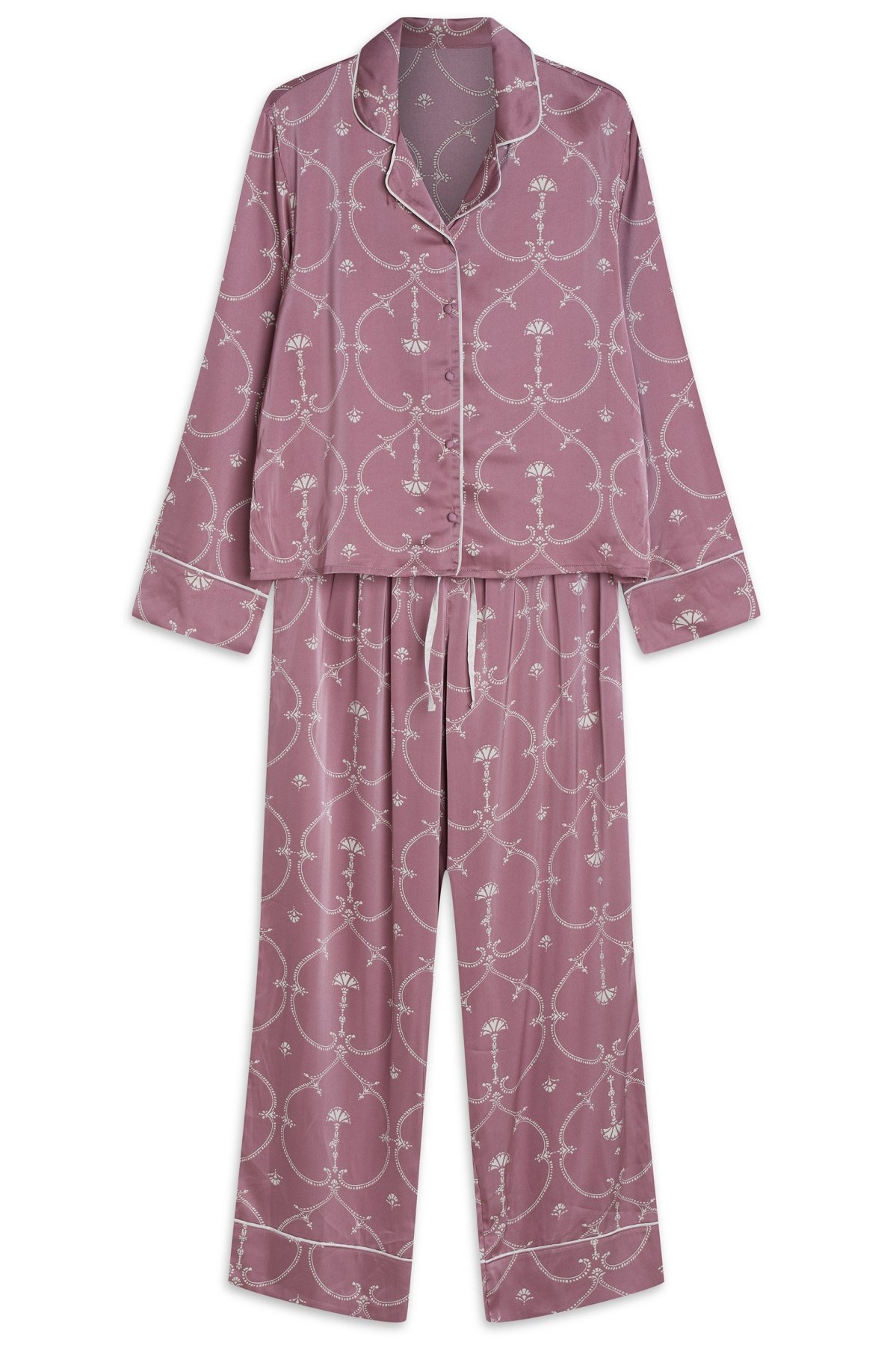 Dámské pyžamo Cosmati představuje spojení klasické elegance a ženského šarmu. Hebký satén s jemným leskem lehce klouže po pokožce, vytváří pocit luxusu a dokonale se přizpůsobí pohybu těla. Košile s límečkem a zapínáním dodává celku noblesu. Dlouhé kalhoty s volným střihem a stahováním v pase zajišťují maximální komfort. Dekorativní květinový motiv působí něžně a zvýrazňuje jemnost materiálu. Celý komplet doplňuje elegantní lemování.