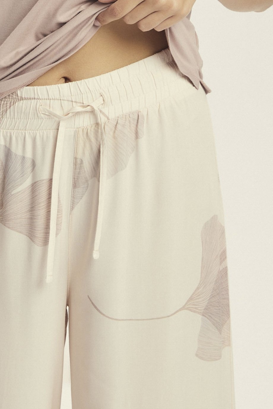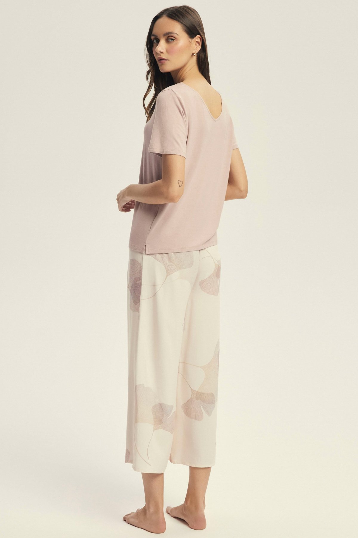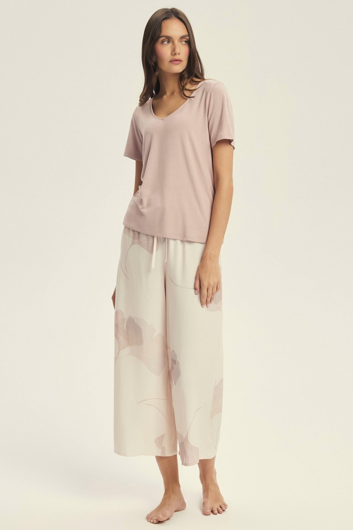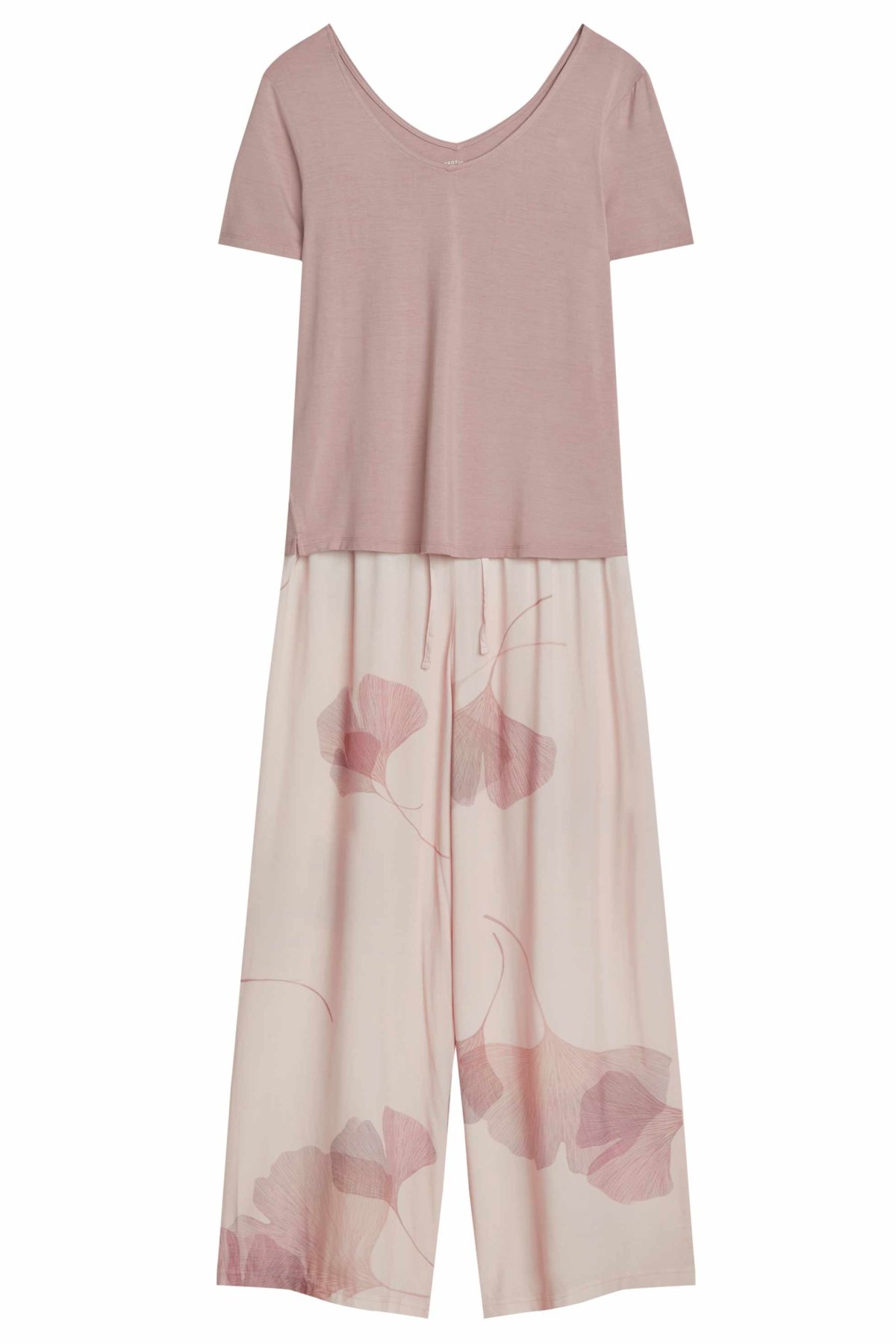 Triko s krátkým rukávem z viskózy v odstínu pudrově růžové krásně ladí se vzdušnými kalhotami s potiskem inspirovaným tvarem listů ginkga. Lehounká, splývavá tkanina příjemně chladí pokožku a zajišťuje volnost pohybu při spánku i během odpočinku. Kalhoty s elastickým pasem se dokonale přizpůsobí postavě a díky širokým nohavicím působí žensky i ležérně zároveň.