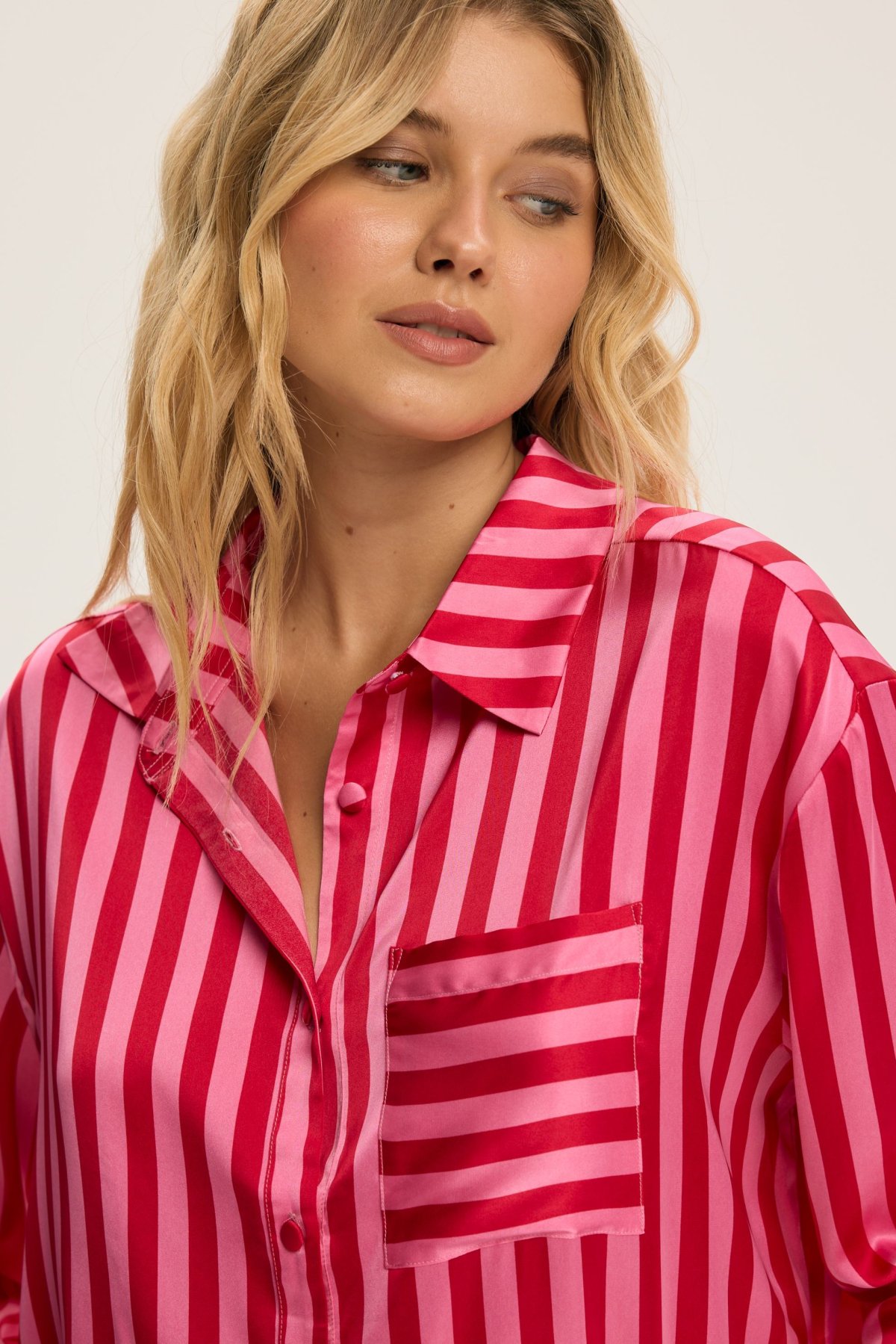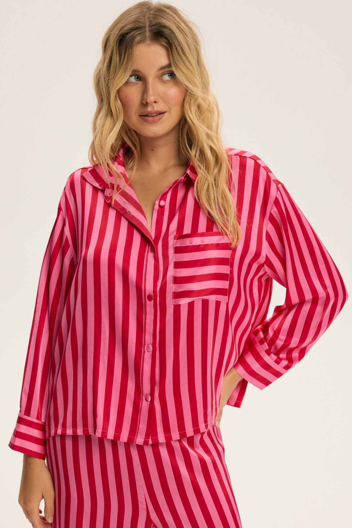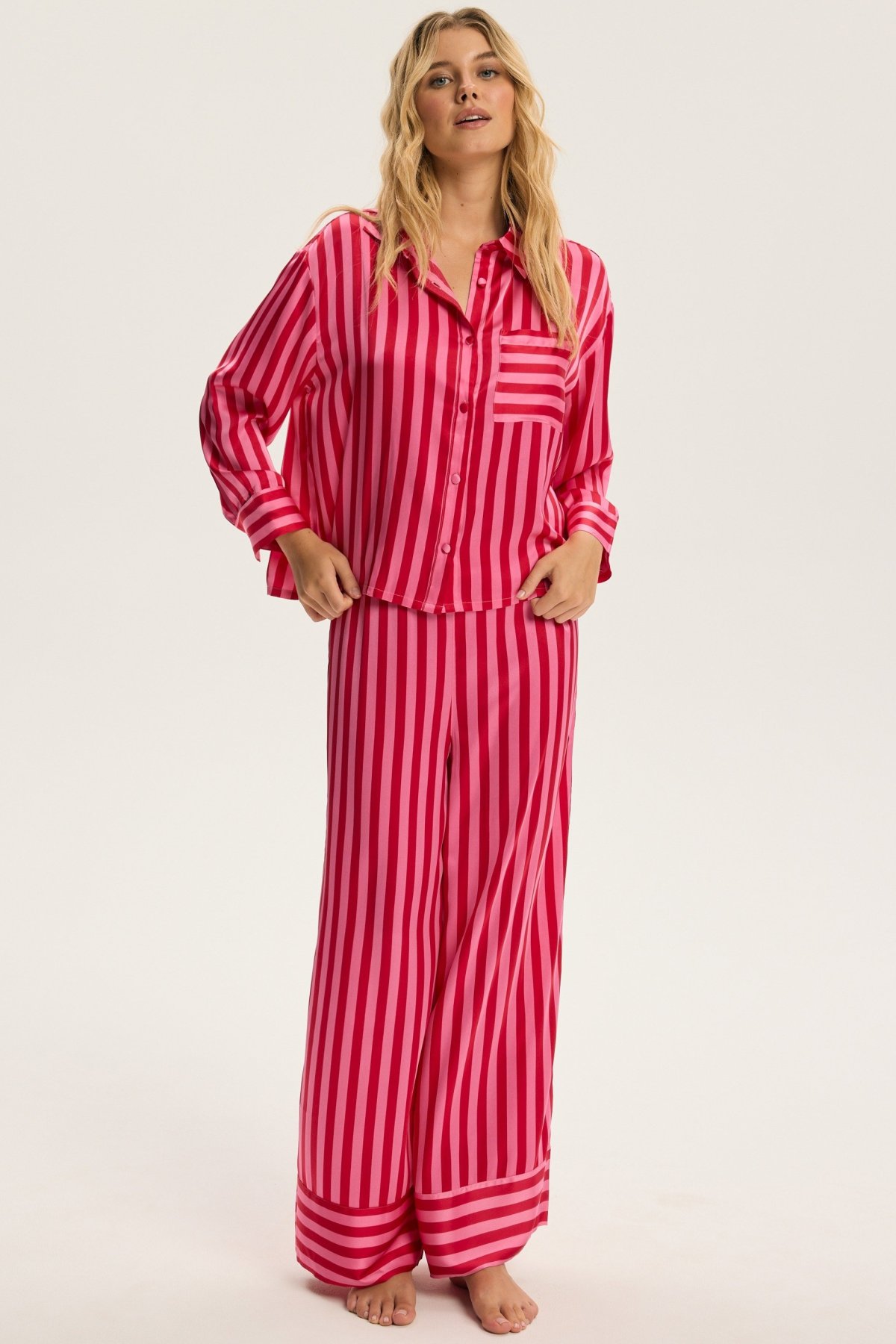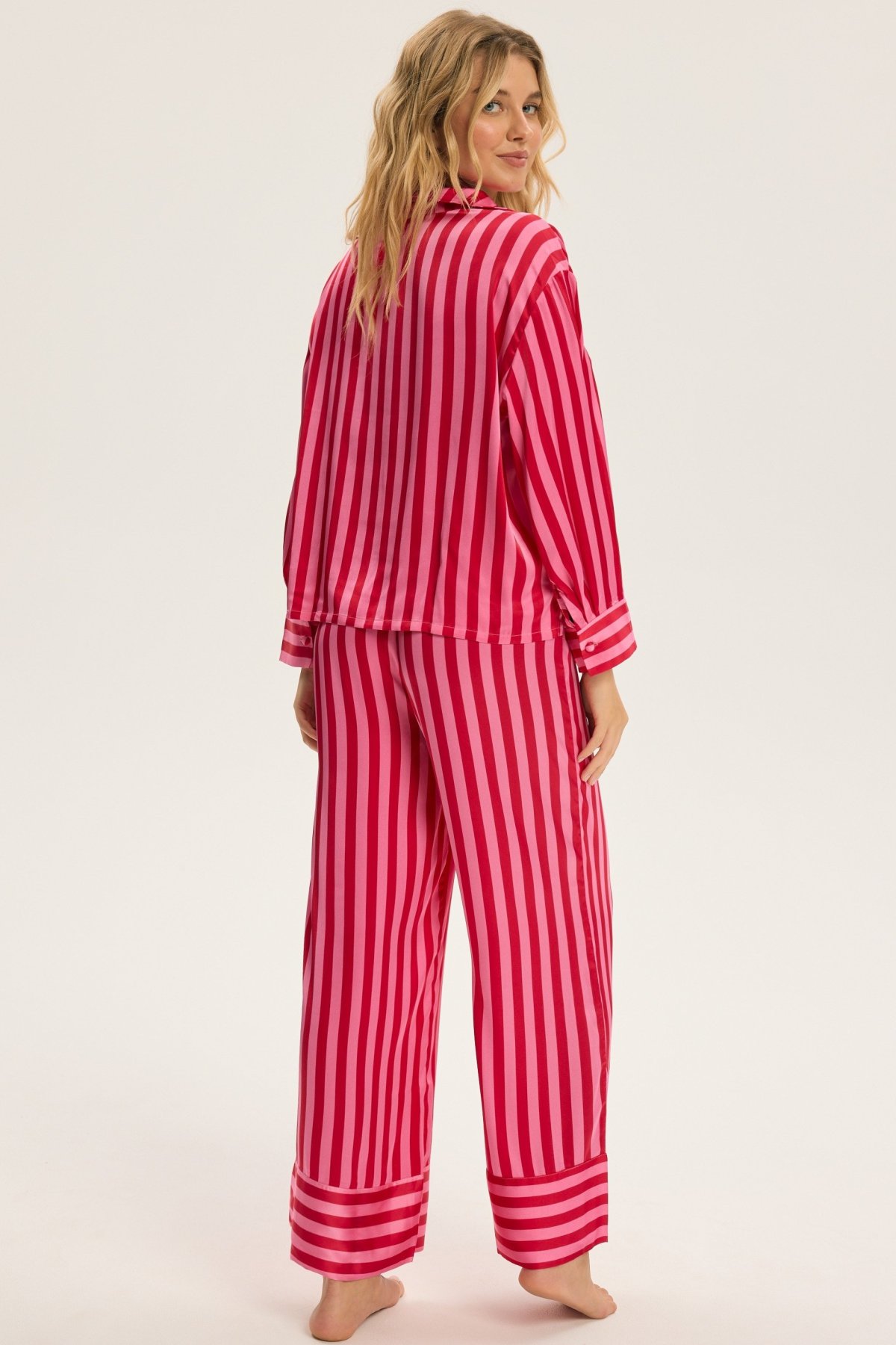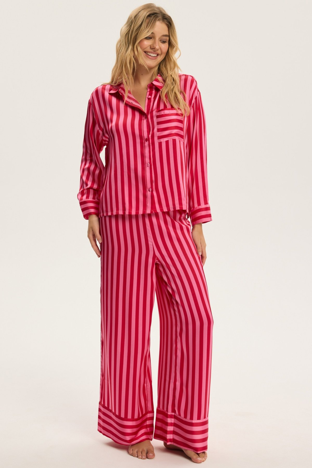 Dámské pyžamo Cress je symbolem moderní ženskosti a sofistikovaného stylu. Vyrobené z lesklé saténové látky, která působí elegantně a smyslně zároveň. Klasicky střižená košile s dlouhým rukávem a knoflíčky získává díky lehce volnému střihu moderní, uvolněný charakter. Dlouhé kalhoty se širokými nohavicemi se ladně pohybují při každém kroku, čímž vytvářejí dojem plynulosti a elegance. Růžovo-malinový odstín dodává celku ženský půvab a svěžest. Tento komplet je ideální volbou pro ženy, které chtějí spojit pohodlí, styl a dotek luxusu – a proměnit každý večer v malý rituál krásy.