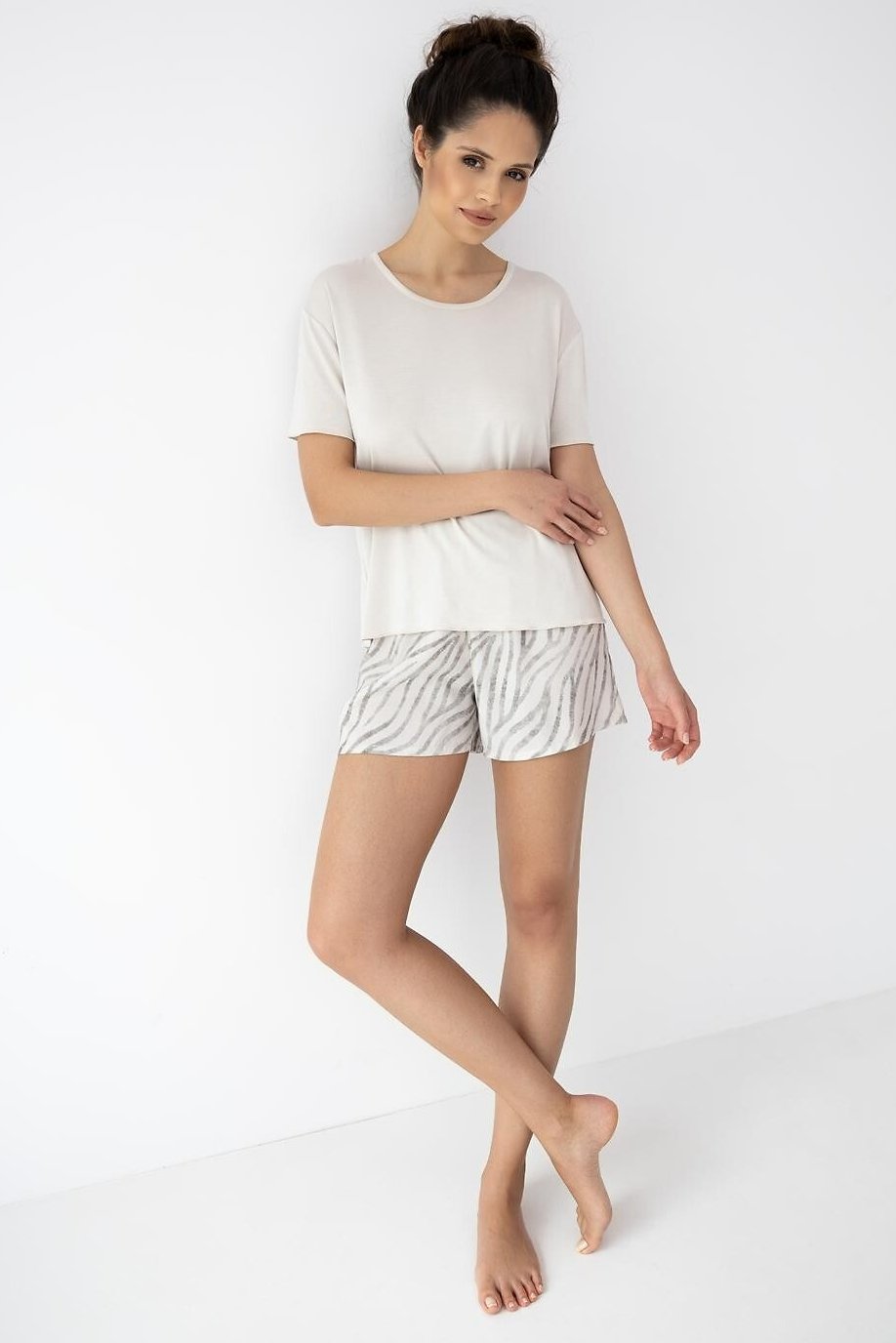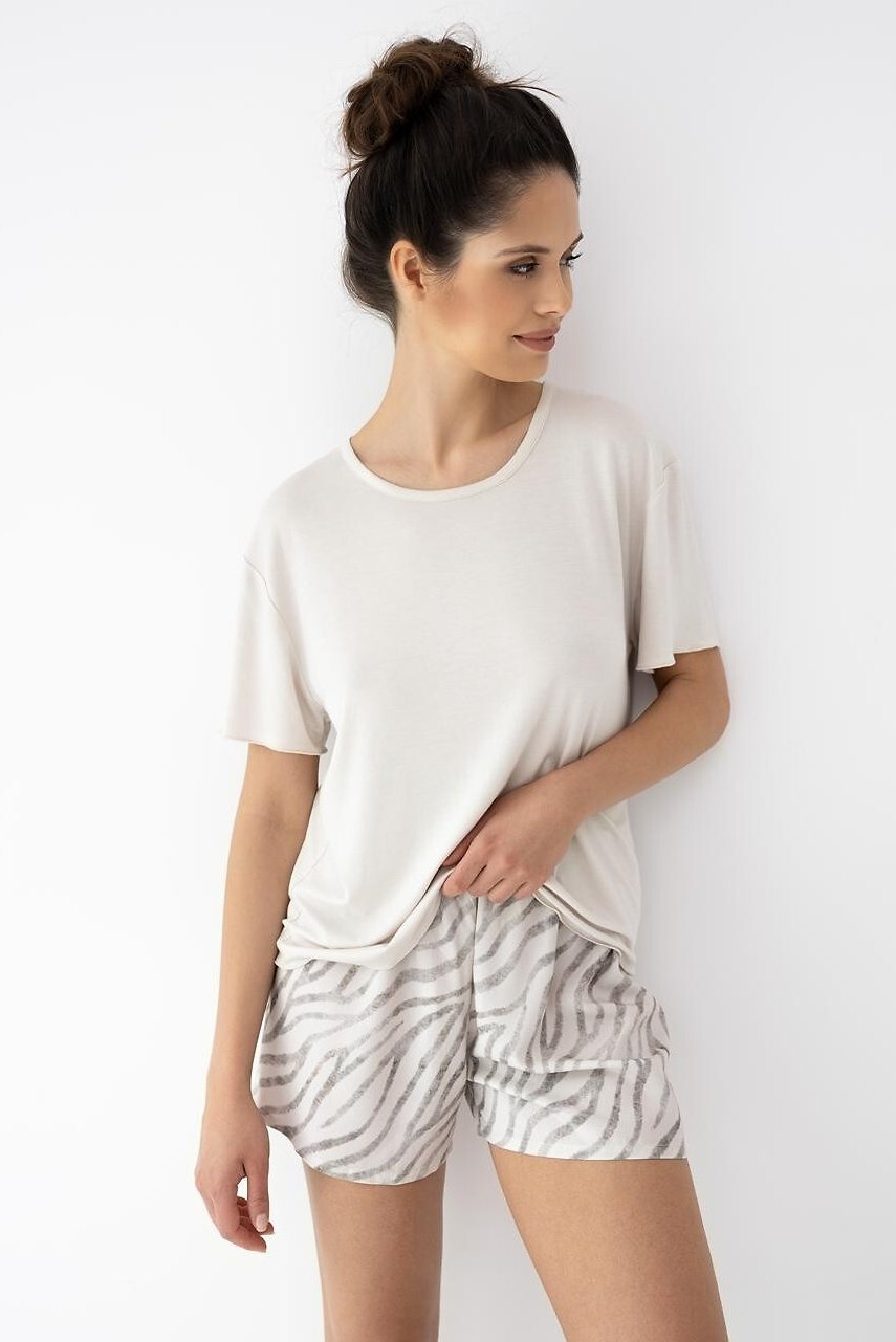 Tohle dámské pyžamo je jako stvořené pro dny, kdy chcete maximální lehkost. Jednobarevné tričko z viskózové pleteniny je hebké, příjemně pruží a díky elastanu se hezky přizpůsobí postavě bez pocitu stažení. Krátký rukáv a půlkulatý výstřih působí čistě a přirozeně. Vzorované šortky jsou ušité z tenké, prodyšné viskózy, která krásně splývá a na kůži je jemná i během horkých nocí. Kombinace hladkého vršku a výraznějších šortek vytváří vyvážený, pohodlný komplet, který využijete nejen na spaní, ale i na lenivé ranní chvíle doma.