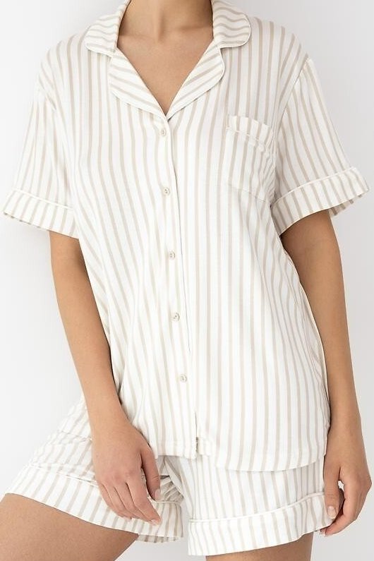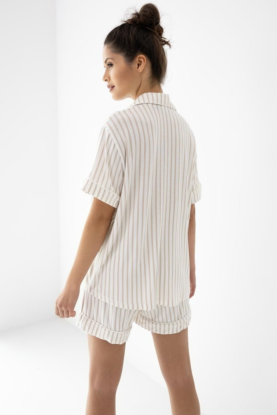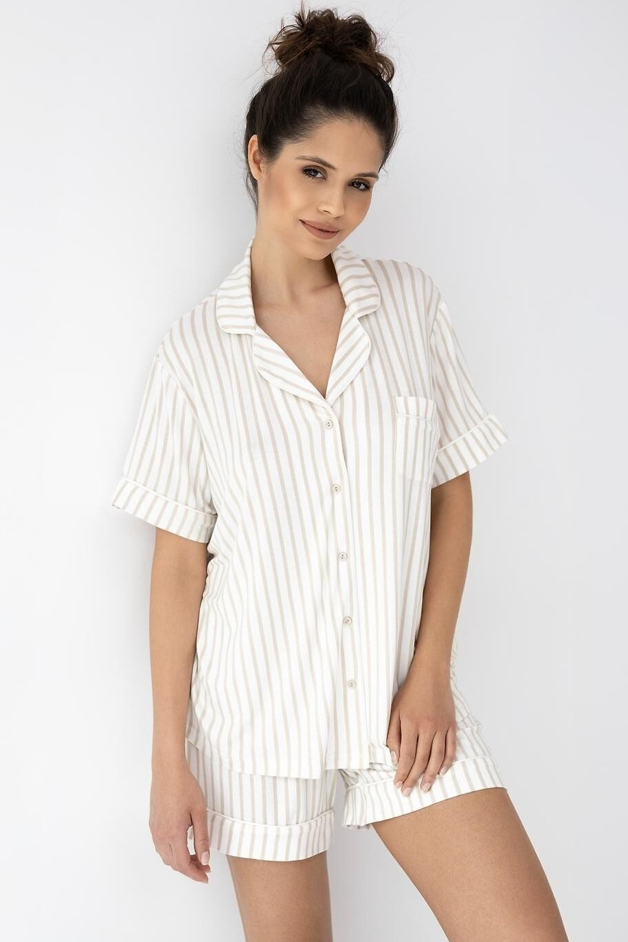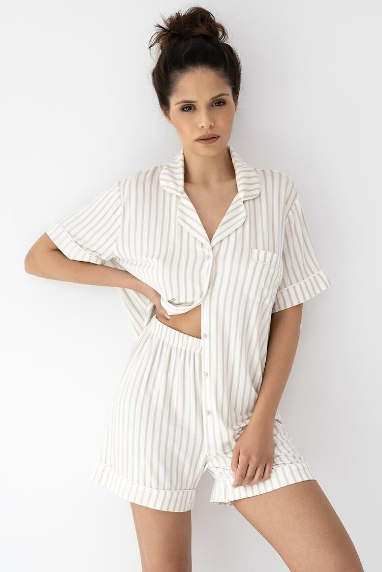 Dámské pyžamo z kvalitní viskózy je příjemně hladké, chladivé na dotek a krásně splývá, takže se hodí hlavně na teplejší noci i domácí relax. Košilový top s límečkem a knoflíčky působí upraveně, přitom zůstává pohodlný a snadno se obléká. Proužky dodají modelu svěží, minimalistický styl a náprsní kapsička celý vzhled příjemně doplní. Krátké šortky mají měkký pas s gumou potaženou úpletem, která drží, ale netlačí – ideální, když chcete volnost a komfort bez kompromisů. Pyžamo, které vypadá hezky a nosí se ještě lépe.