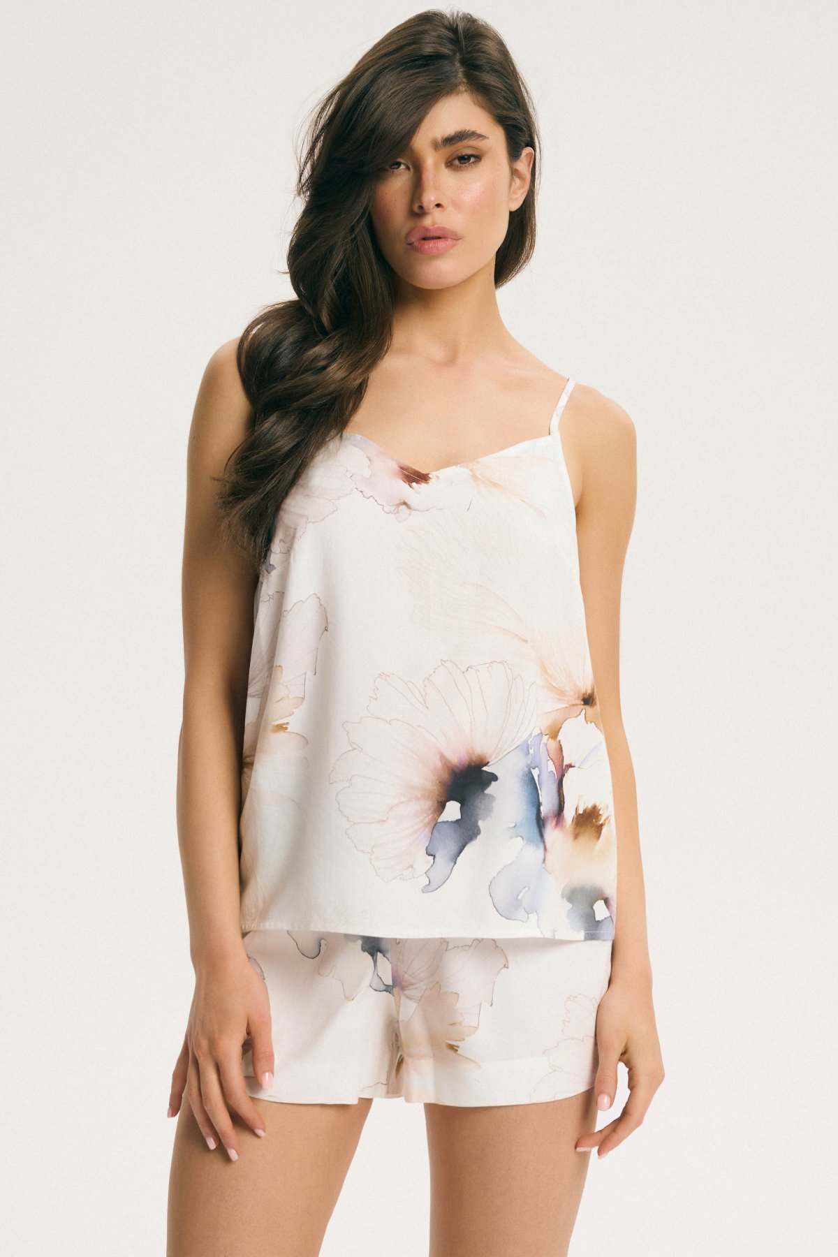 Dámské pyžamo Esotiq Delightful tvoří lehký komplet s topem na tenkých ramínkách a krátkými šortkami. Regulovatelná ramínka umožňují lepší usazení horního dílu, zatímco elastický pas a volnější střih šortek podporují pohodlí při spaní i domácím nošení. Krémový podklad s jemným květinovým potiskem působí měkce a svěže. Viskózový materiál je lehký, splývavý a příjemný na těle.