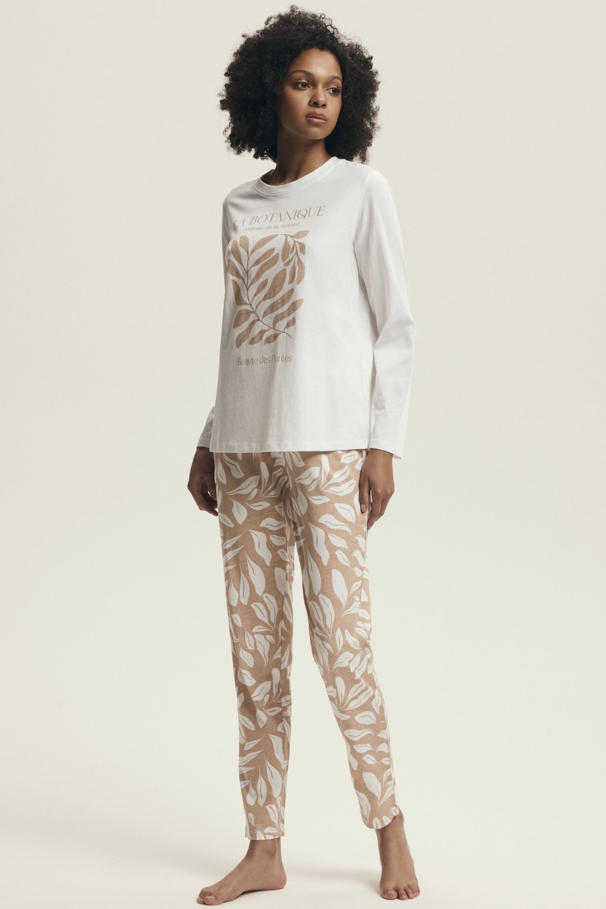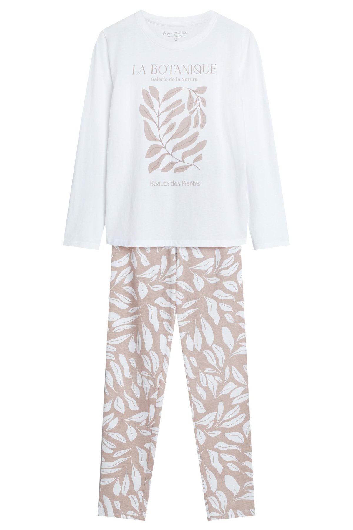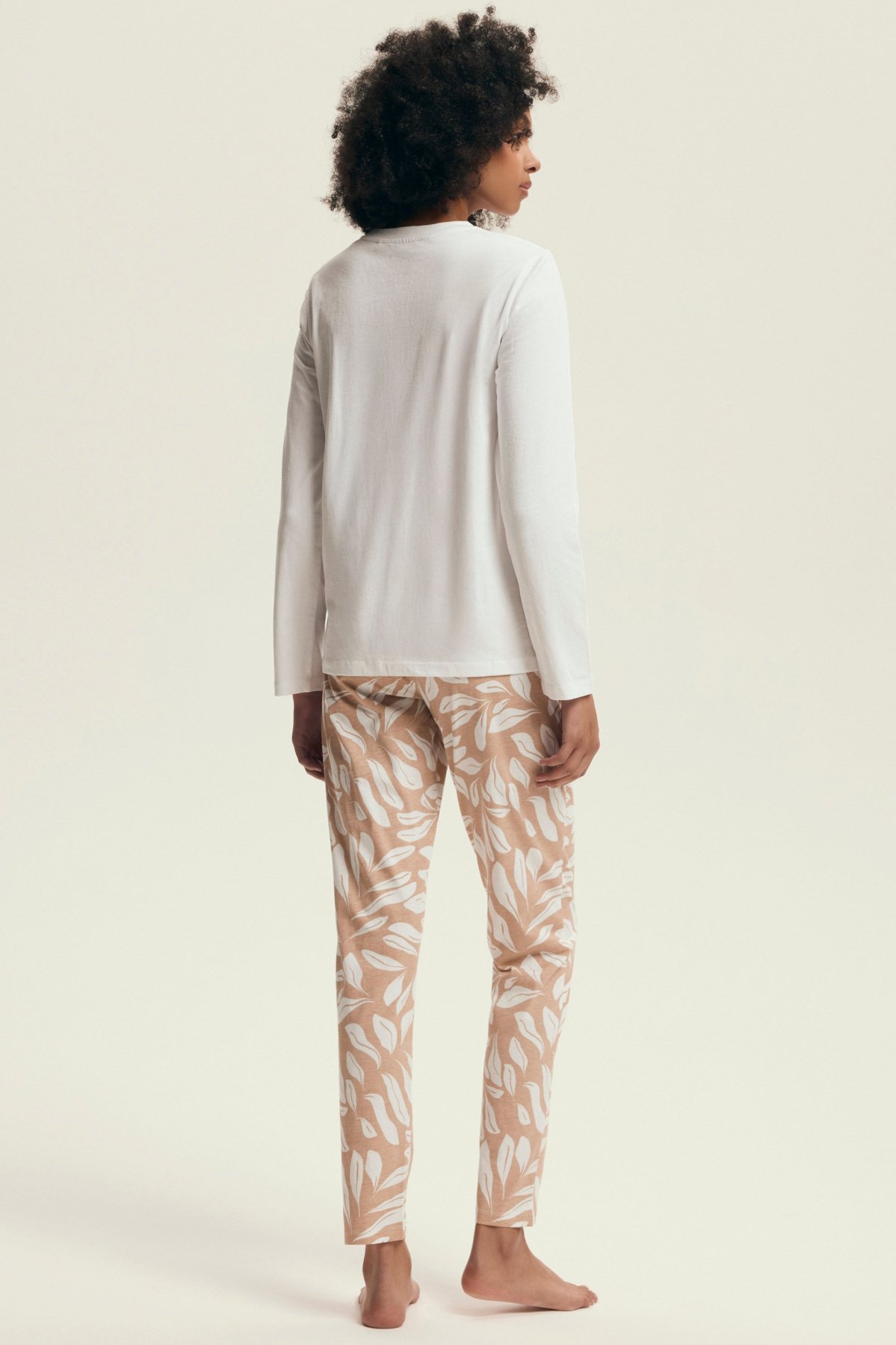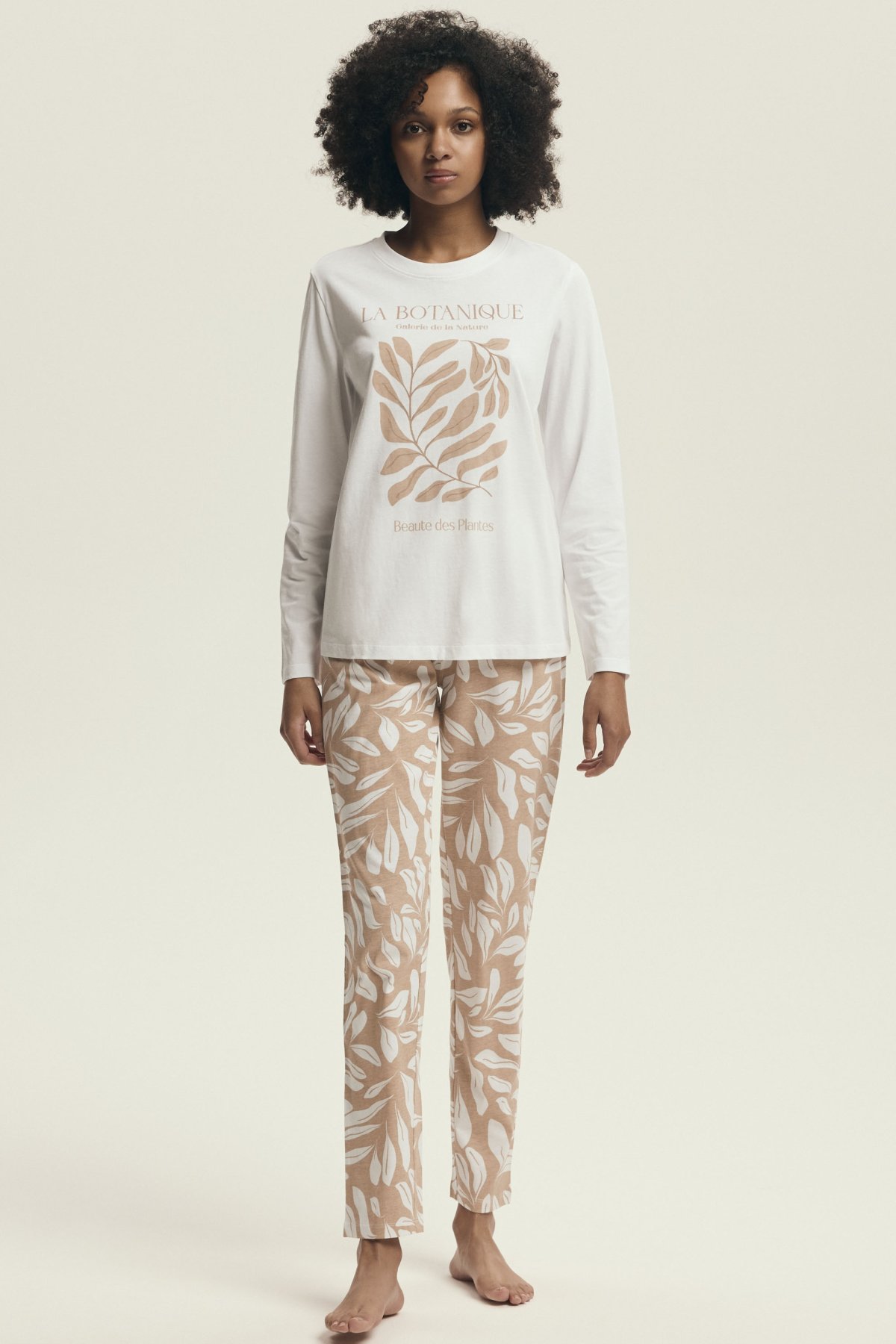 Dámské bavlněné pyžamo Dextra přináší maximální pohodlí v přírodním stylu. Horní díl s dlouhým rukávem zdobí jemný potisk s botanickým motivem, který dodává soupravě jemný a klidný charakter. Kalhoty mají celoplošný vzor v přírodních tónech a pružný pas pro volnost pohybu. Měkká bavlna příjemně přiléhá k pokožce a zaručuje komfort po celou noc. Pyžamo je vhodné pro spánek i domácí relax.