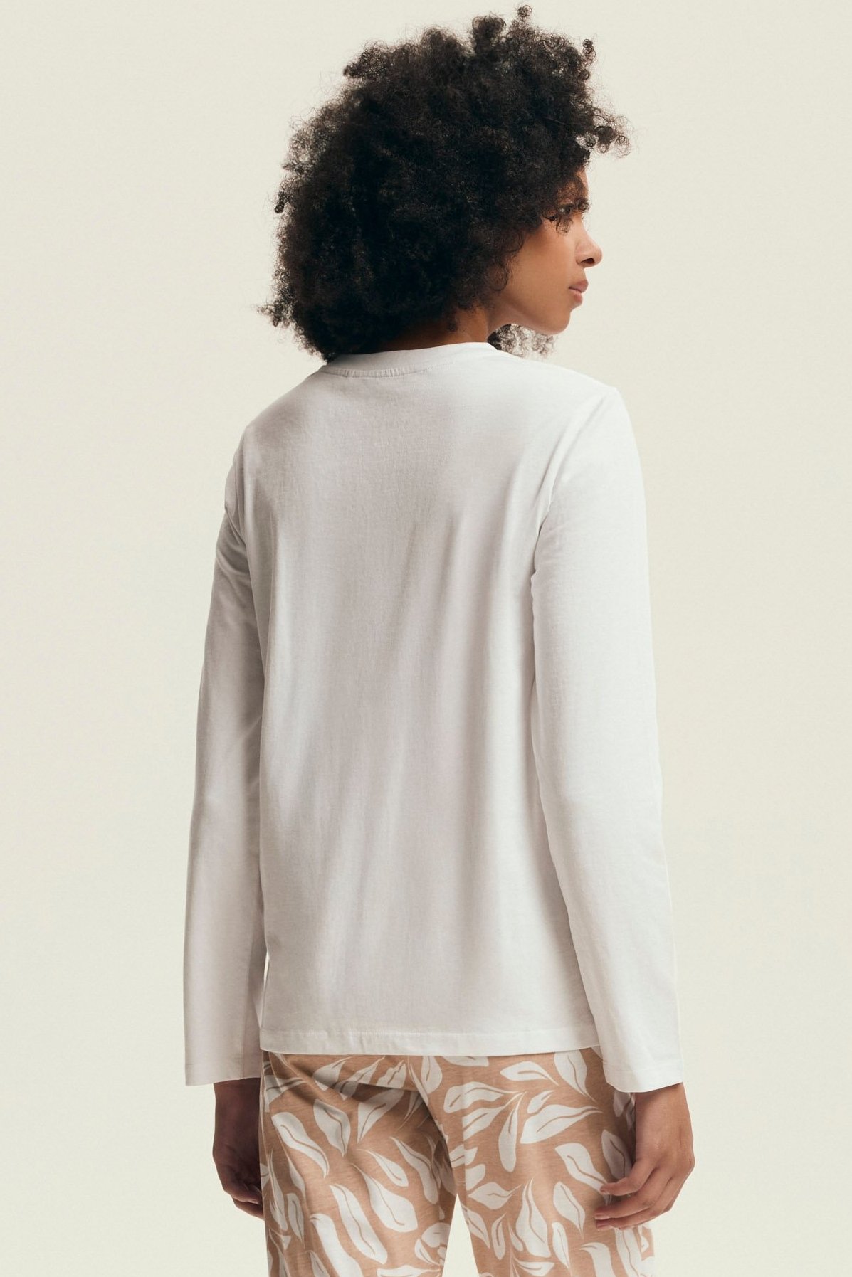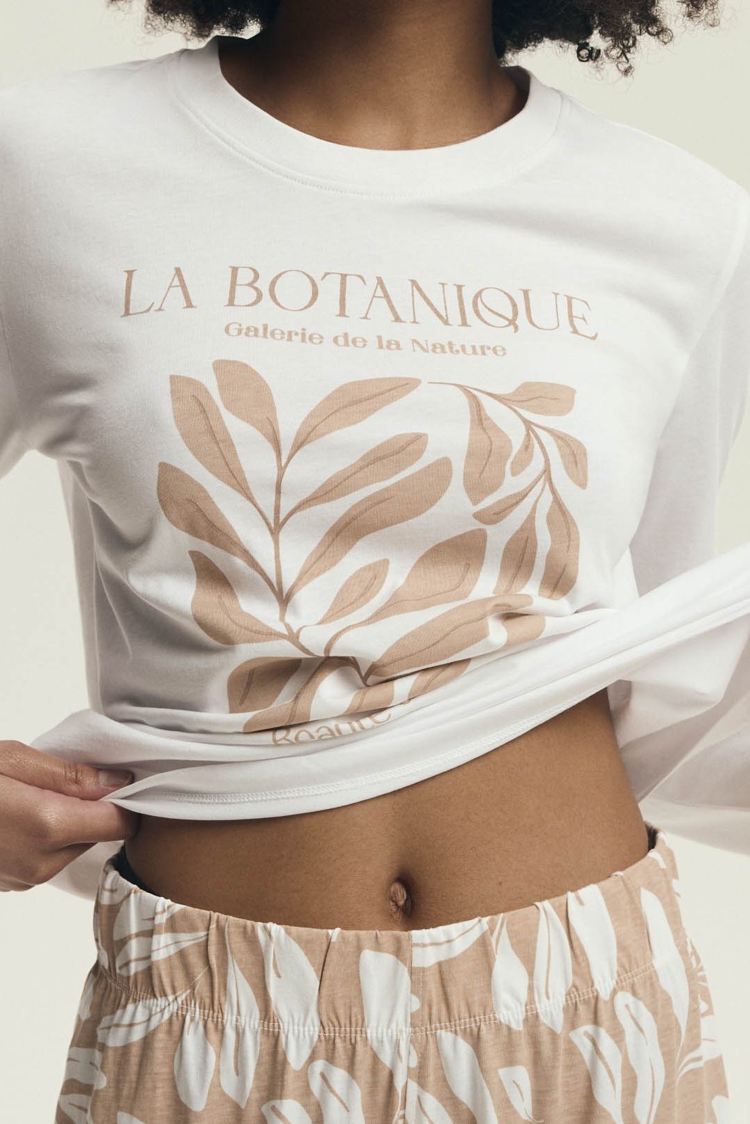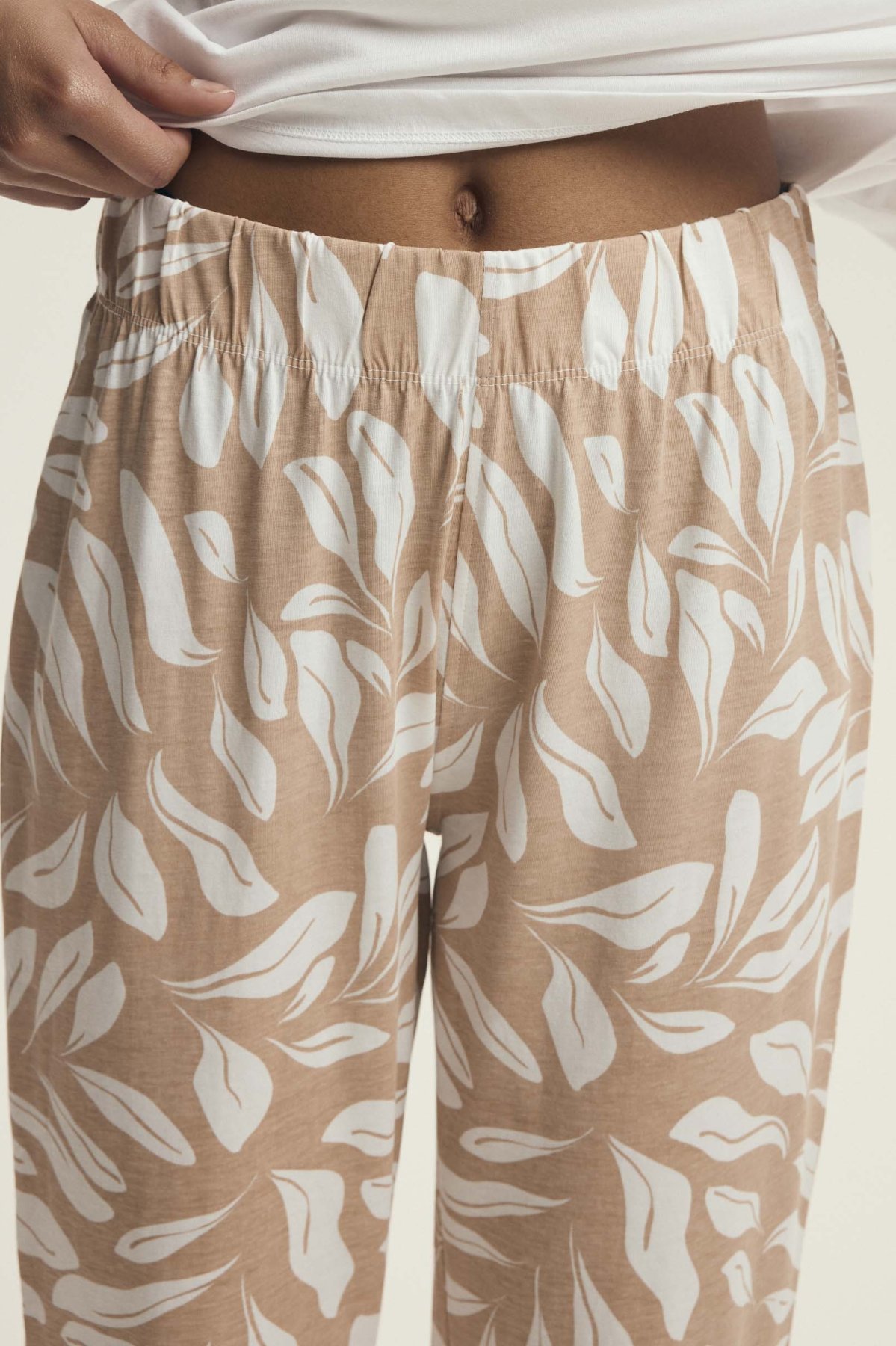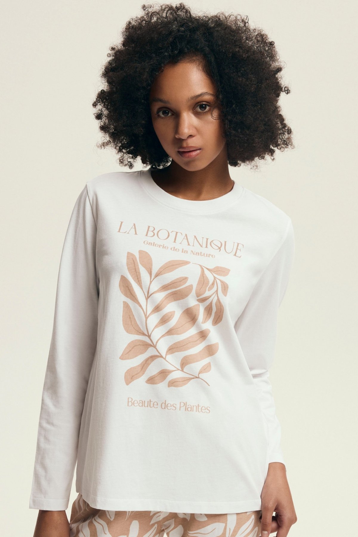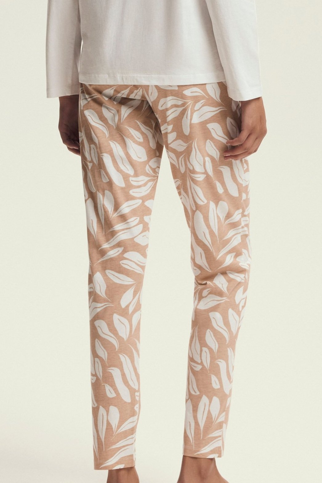 Dámské bavlněné pyžamo Dextra přináší maximální pohodlí v přírodním stylu. Horní díl s dlouhým rukávem zdobí jemný potisk s botanickým motivem, který dodává soupravě jemný a klidný charakter. Kalhoty mají celoplošný vzor v přírodních tónech a pružný pas pro volnost pohybu. Měkká bavlna příjemně přiléhá k pokožce a zaručuje komfort po celou noc. Pyžamo je vhodné pro spánek i domácí relax.