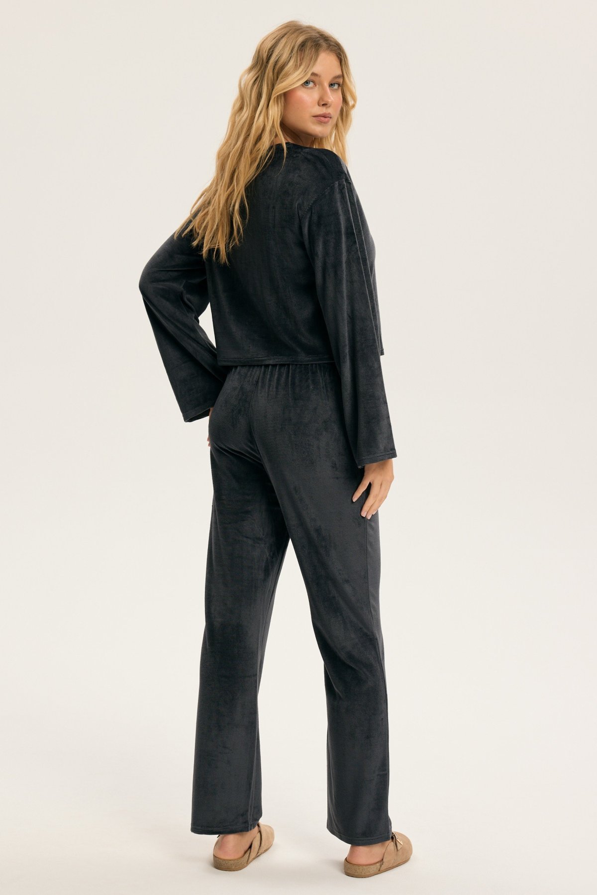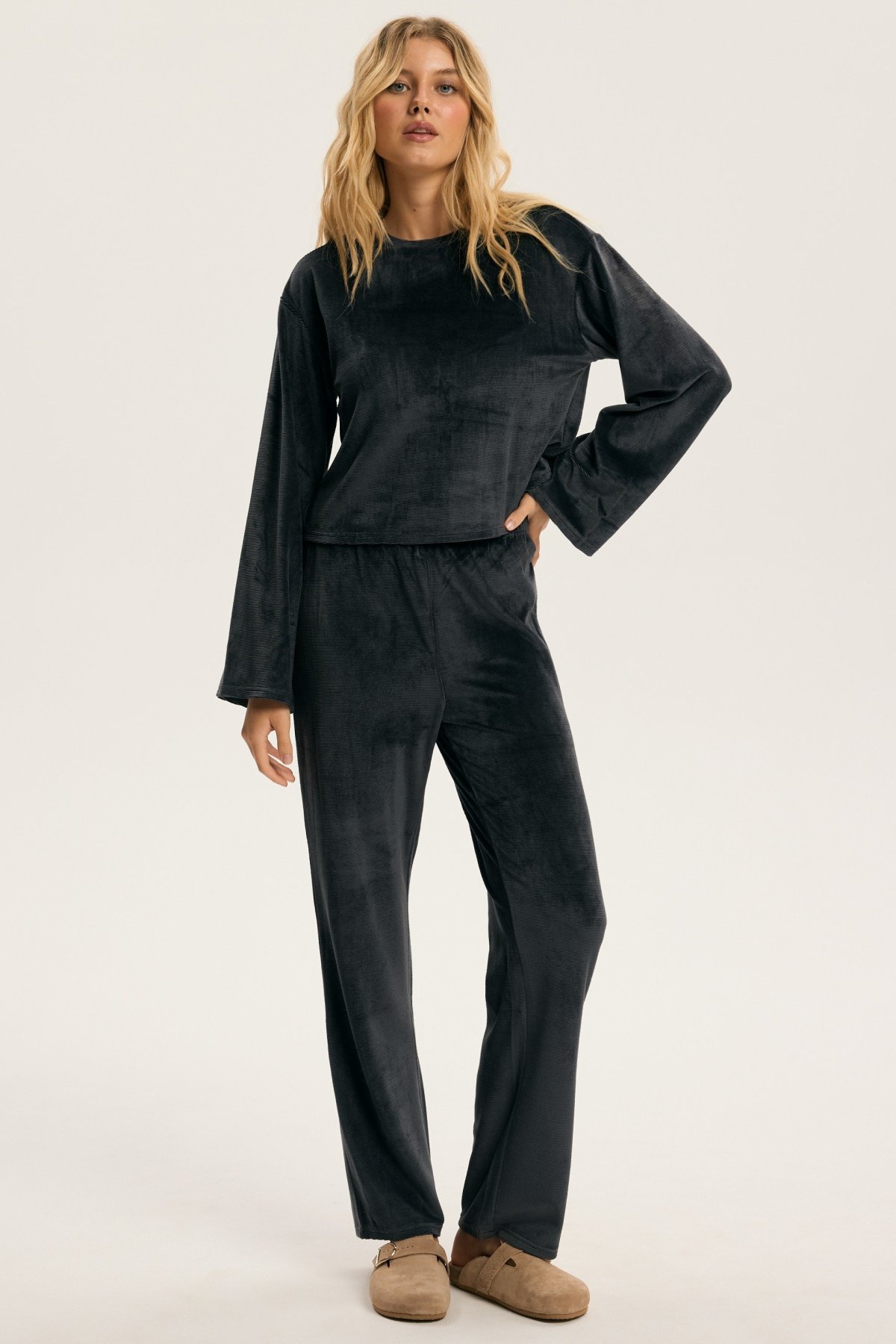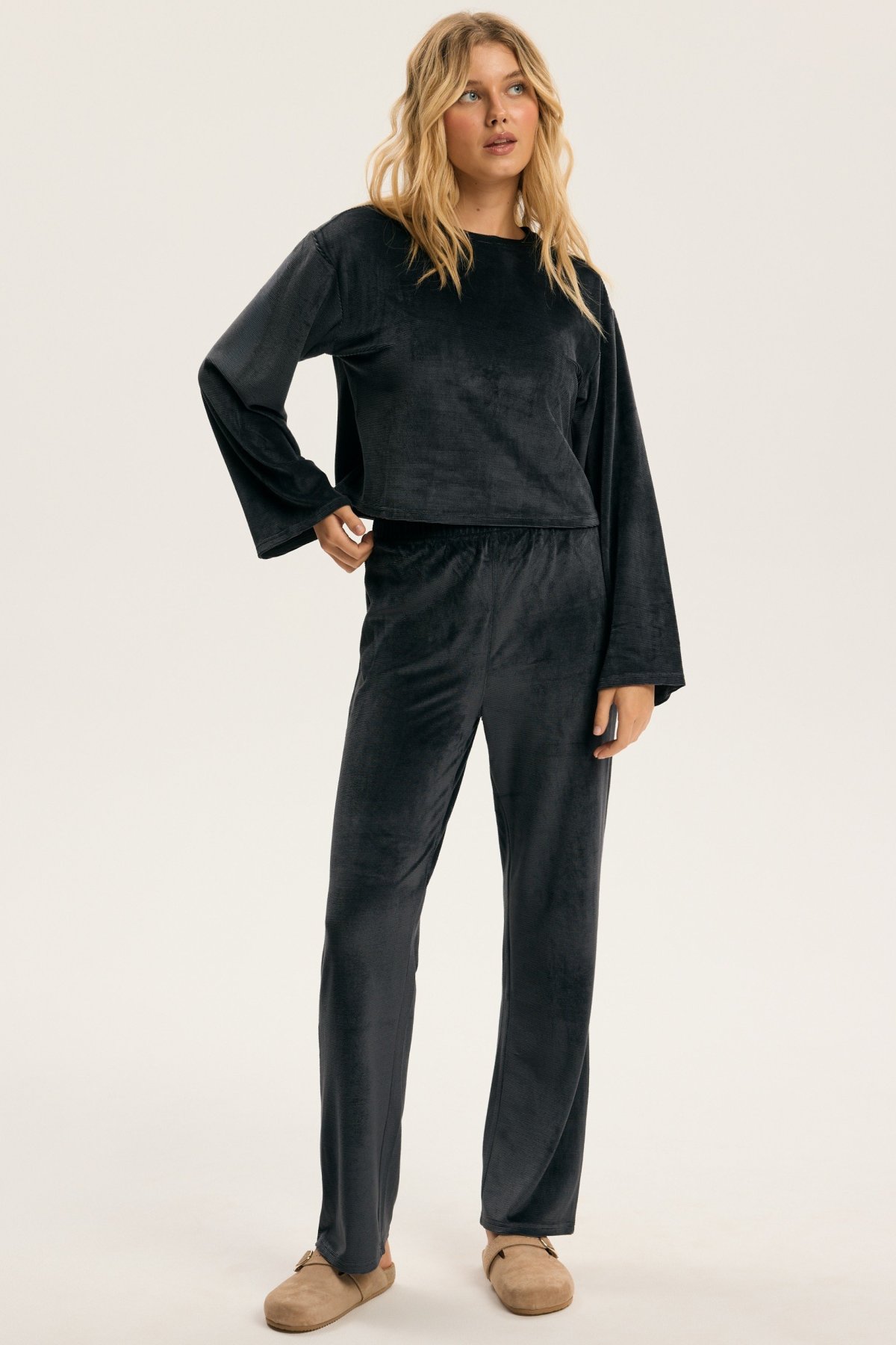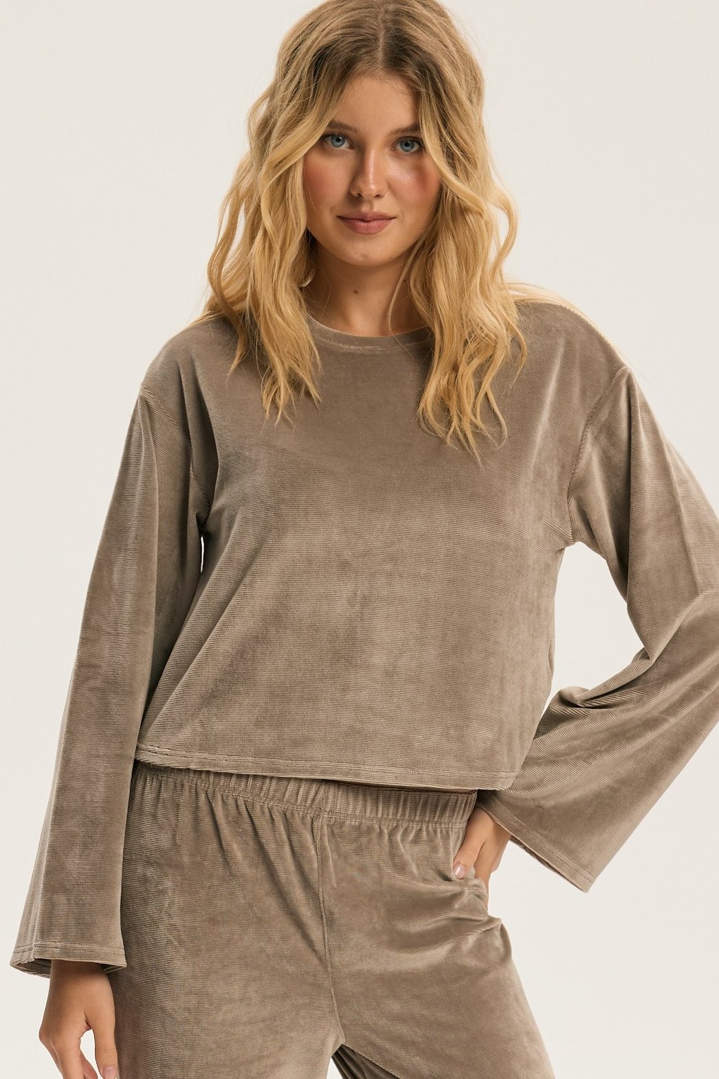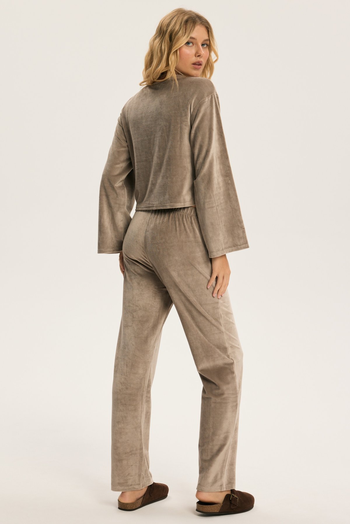 Dámské pyžamo Dreamy je ztělesněním elegance a pohody v jednom. Hebký velurový materiál jemně přiléhá k pokožce a vytváří příjemný pocit tepla a měkkosti. Volný horní díl s širokými rukávy působí uvolněně a sofistikovaně zároveň. Kalhoty s pružným pasem se přizpůsobí postavě a zaručí maximální komfort při spánku i lenošení. Decentní odstíny pyžama dodávají klidnou, harmonickou energii, která navozuje pocit relaxace už při oblékání. Dreamy je perfektní volbou pro ženy, které si chtějí dopřát luxusní pohodlí a styl i během klidných večerů doma.