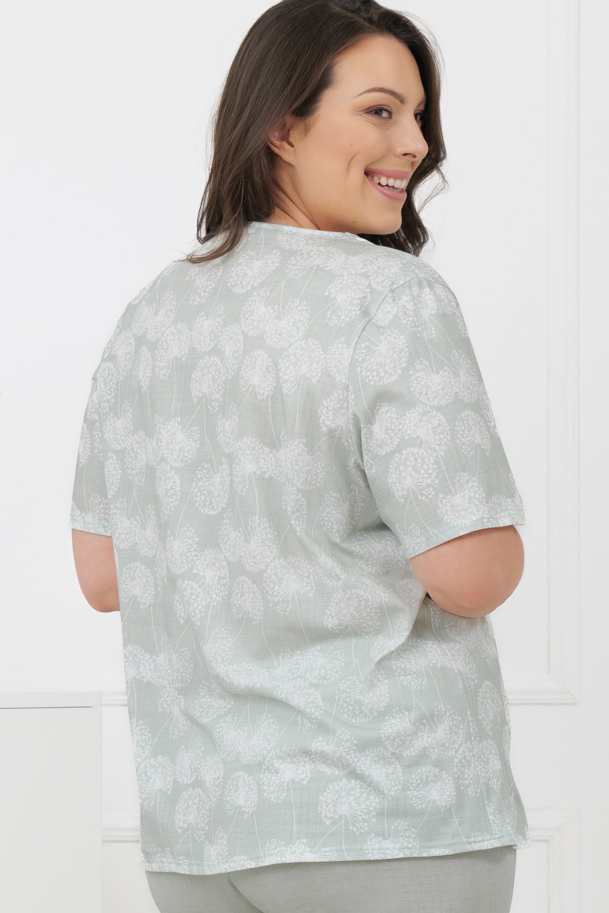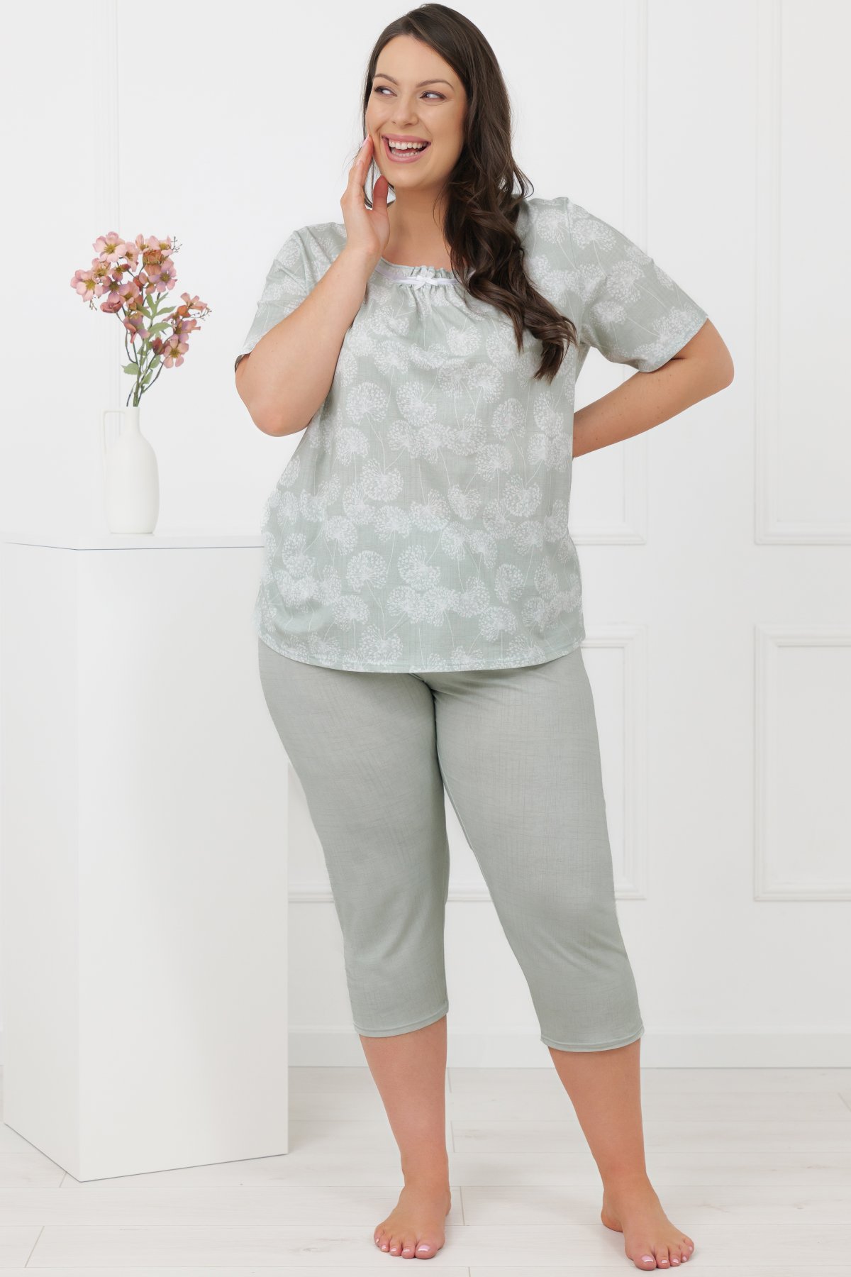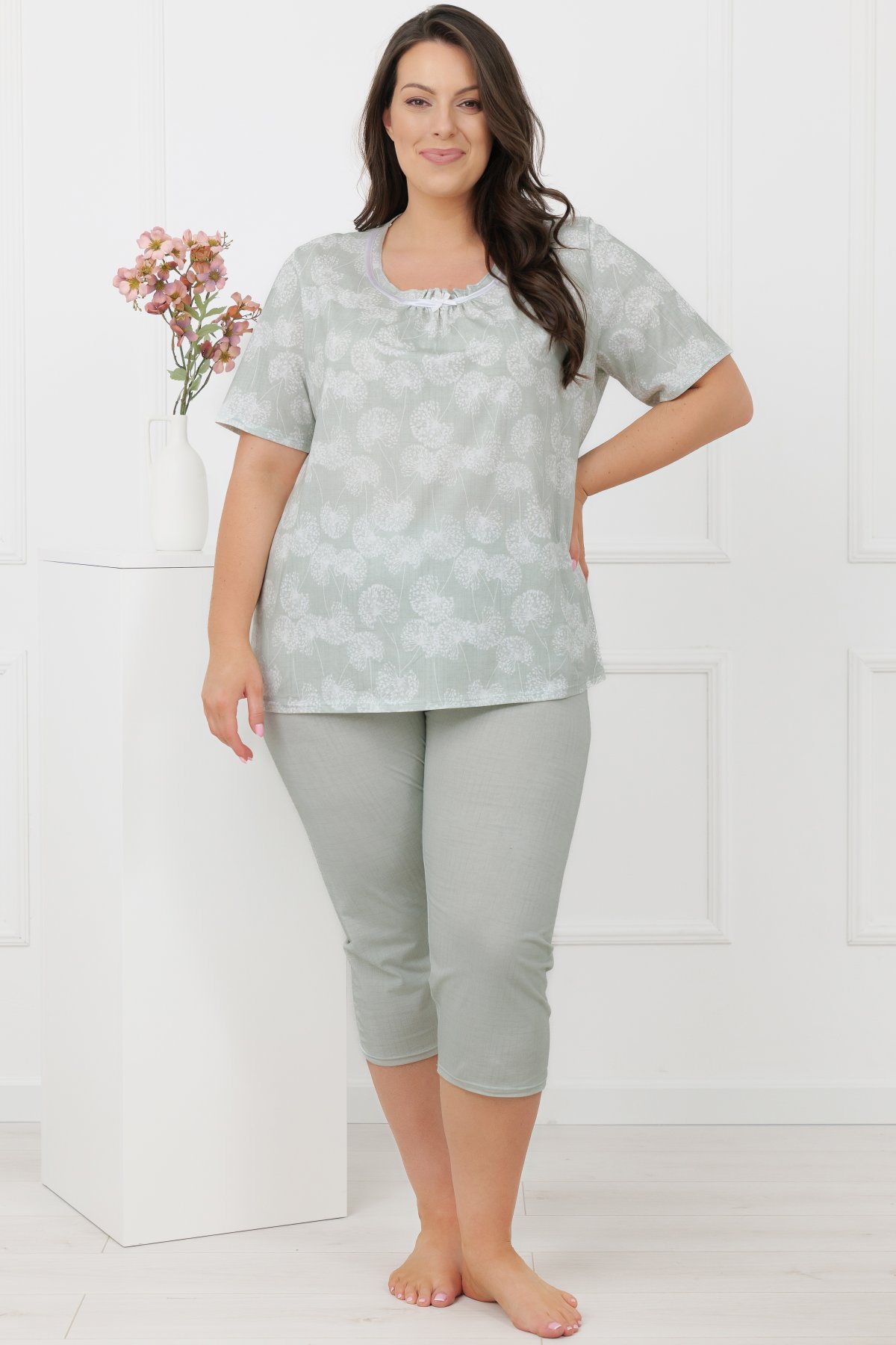 Horní díl zdobí decentní motiv pampelišek v jemných pastelových tónech, které působí klidně a harmonicky. Výstřih je doplněn lehkým řasením, saténovým lemováním a malou mašličkou. Kalhoty ve 3/4 délce jsou jednobarevné a mají pružný pas všitý v tunýlku, který netlačí a dobře drží.