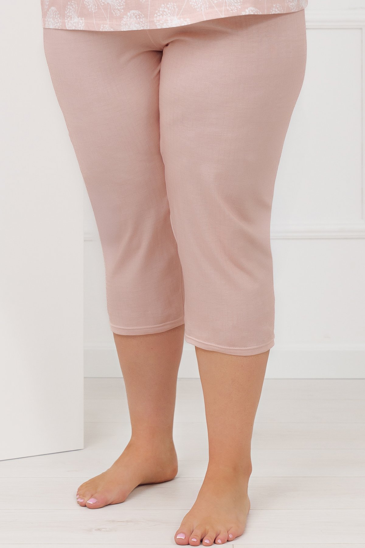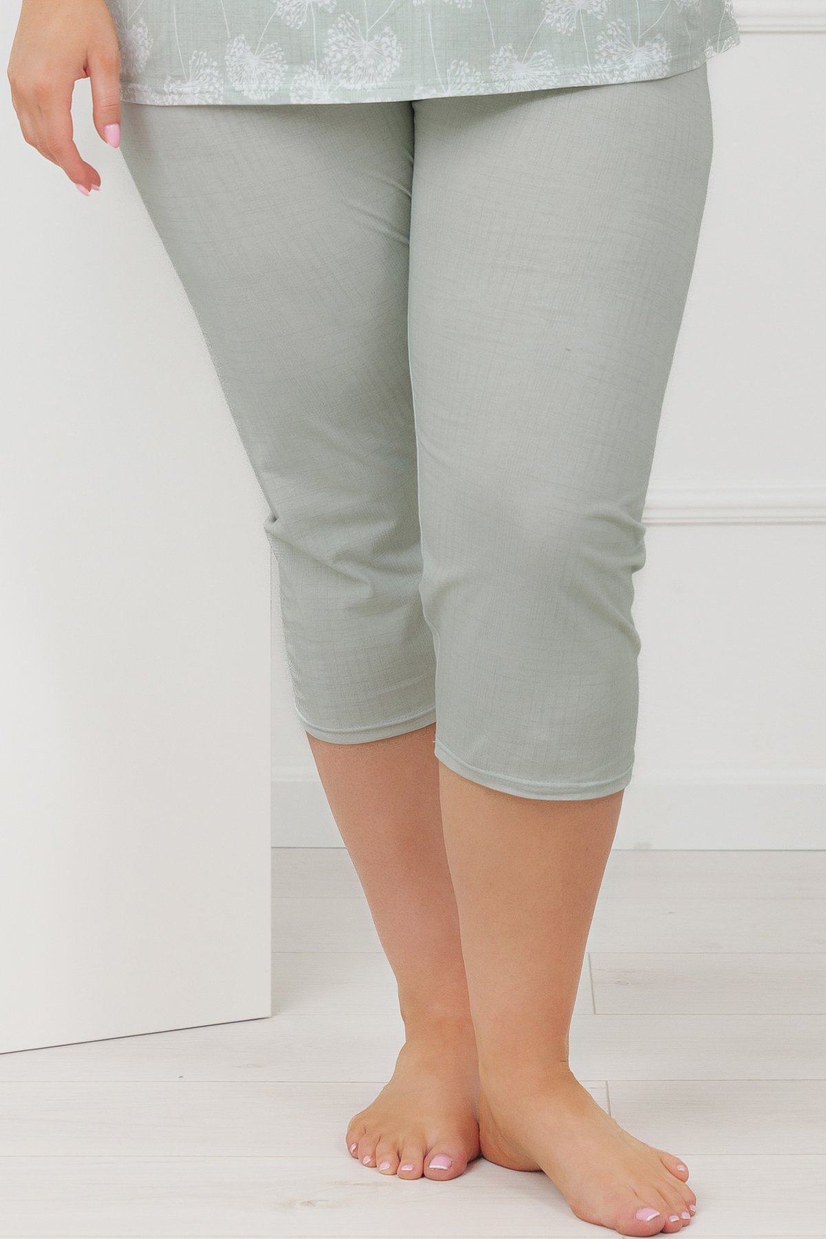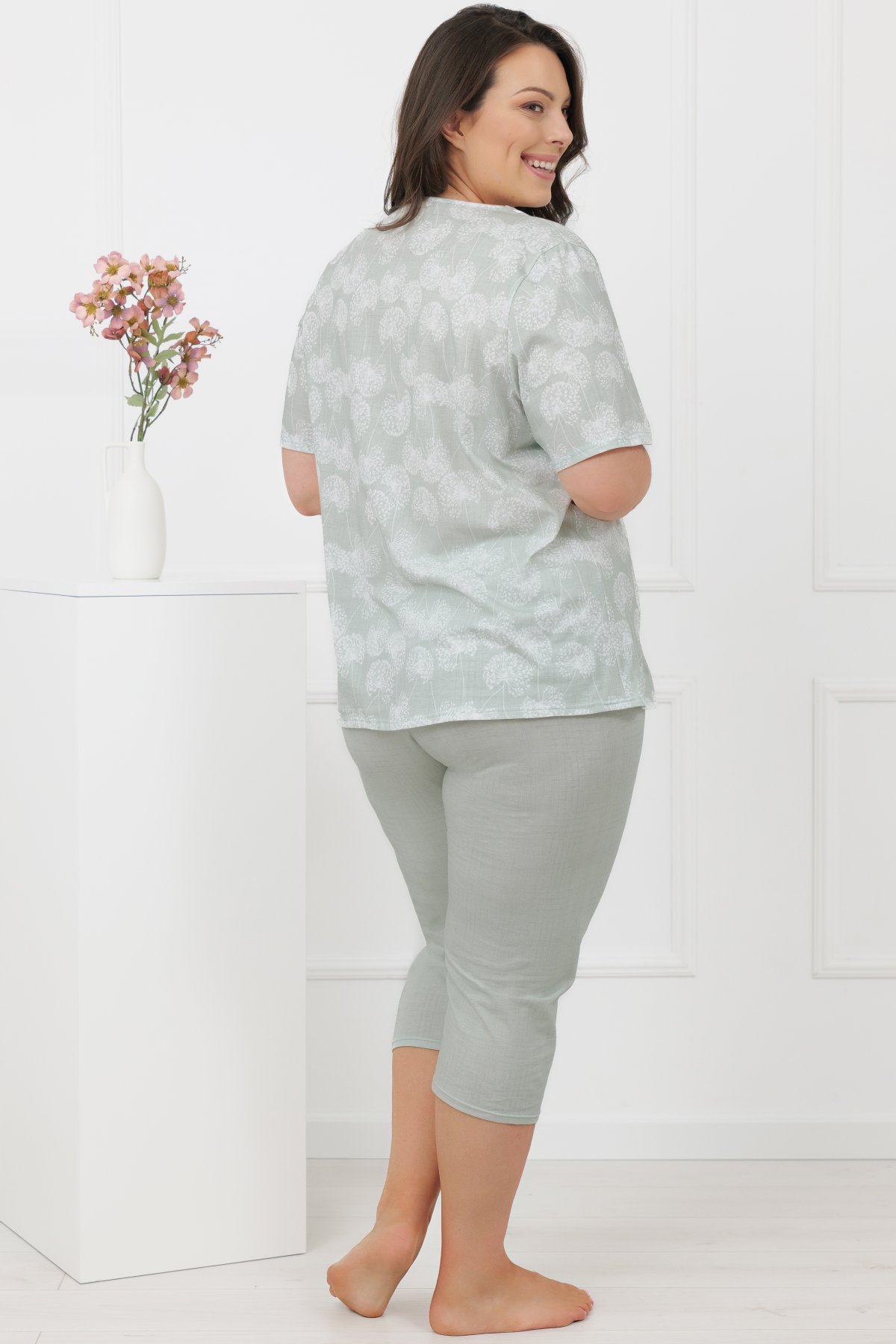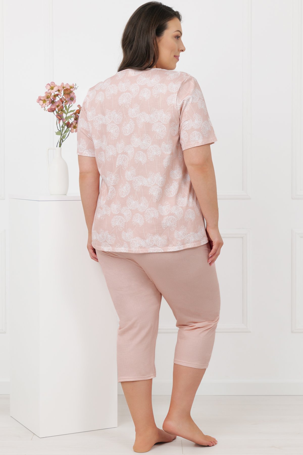 Horní díl zdobí decentní motiv pampelišek v jemných pastelových tónech, které působí klidně a harmonicky. Výstřih je doplněn lehkým řasením, saténovým lemováním a malou mašličkou. Kalhoty ve 3/4 délce jsou jednobarevné a mají pružný pas všitý v tunýlku, který netlačí a dobře drží.