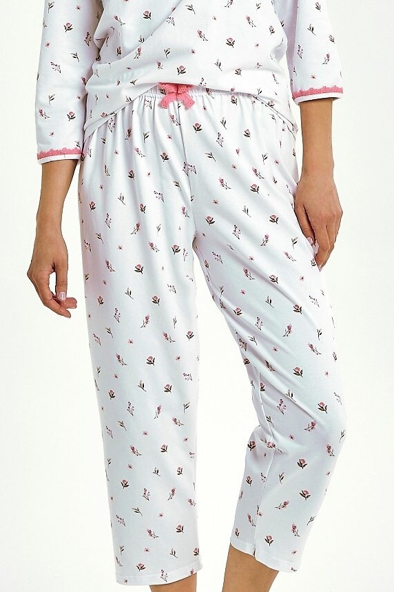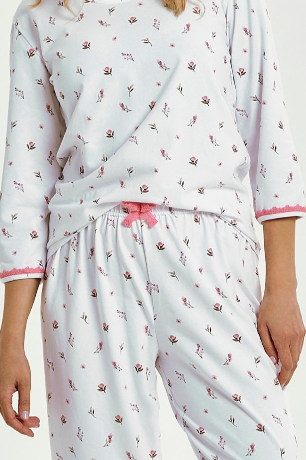 Horní díl s 3/4 rukávy zdobí něžný květinový vzor a decentní krajkové lemování na rukávech, které mu dodává romantický nádech. Spodní díl tvoří pohodlné 3/4 kalhoty s elastickým pasem a ozdobnou mašličkou, která dotváří celý ženský look.
