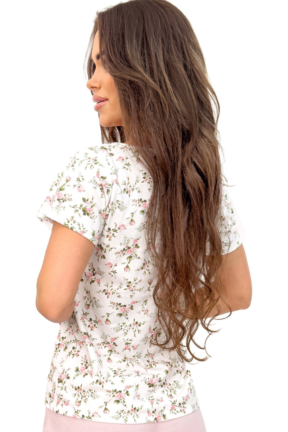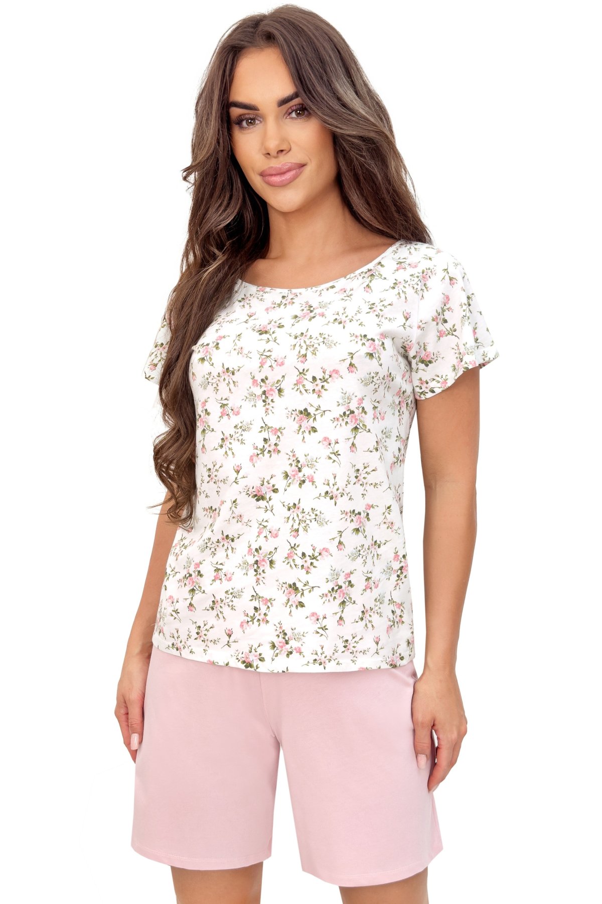 Květovaná blůzka s krátkým rukávem působí jemně a romanticky, růžové kalhoty s delší nohavicí zajišťují maximální komfort a volnost pohybu.