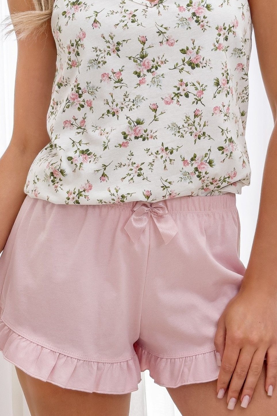 Lehký top na ramínka s jemným květinovým vzorem dodává celku romantický charakter. Růžové šortky s volánkovým lemem a mašličkou v pase působí hravě a elegantně.