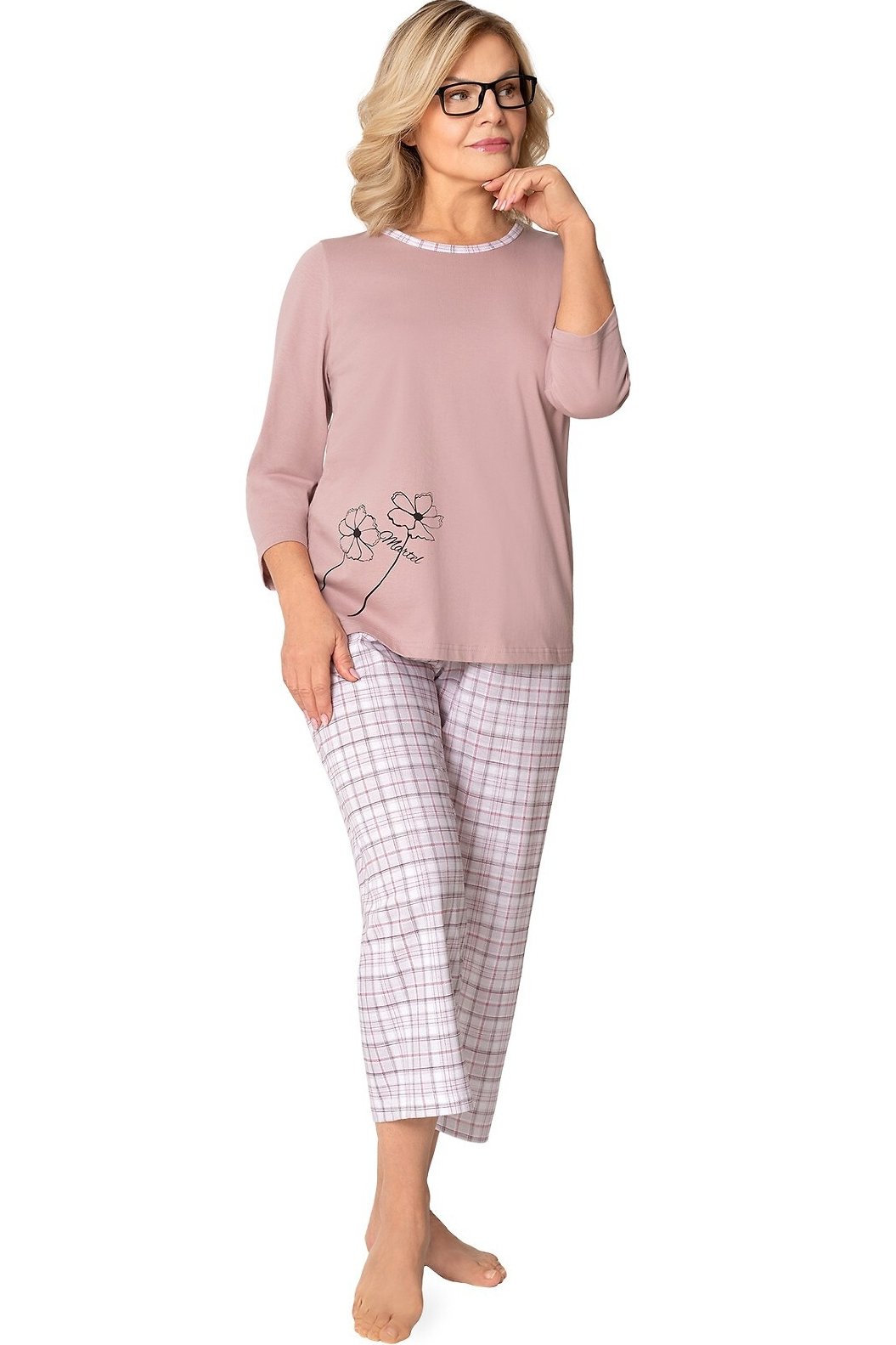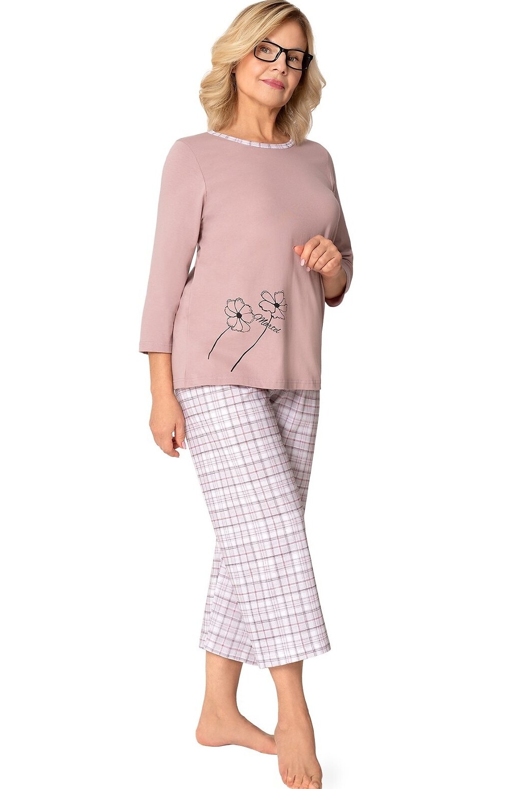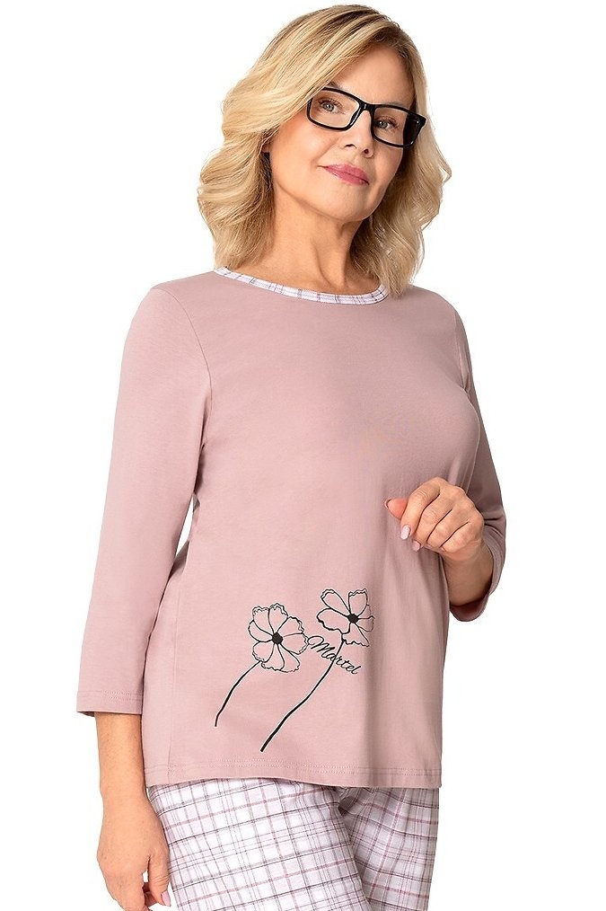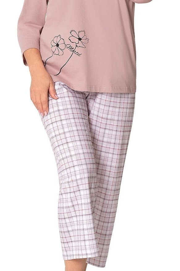 Horní díl v jemně růžovém odstínu zdobí decentní květinový potisk, který dodává modelu romantický nádech. Tričko má kulatý výstřih a rukávy v 7/8 délce, ideální pro přechodné období. Doplňují ho pohodlné kalhoty s klasickým kostkovaným vzorem a délkou nad kotníky. Měkká bavlna příjemně dýchá a zajišťuje pohodlí po celou noc. Pyžamo Gabrysia II je ideální pro ženy, které mají rády jednoduchý, ale elegantní styl a pohodlí v každém detailu.