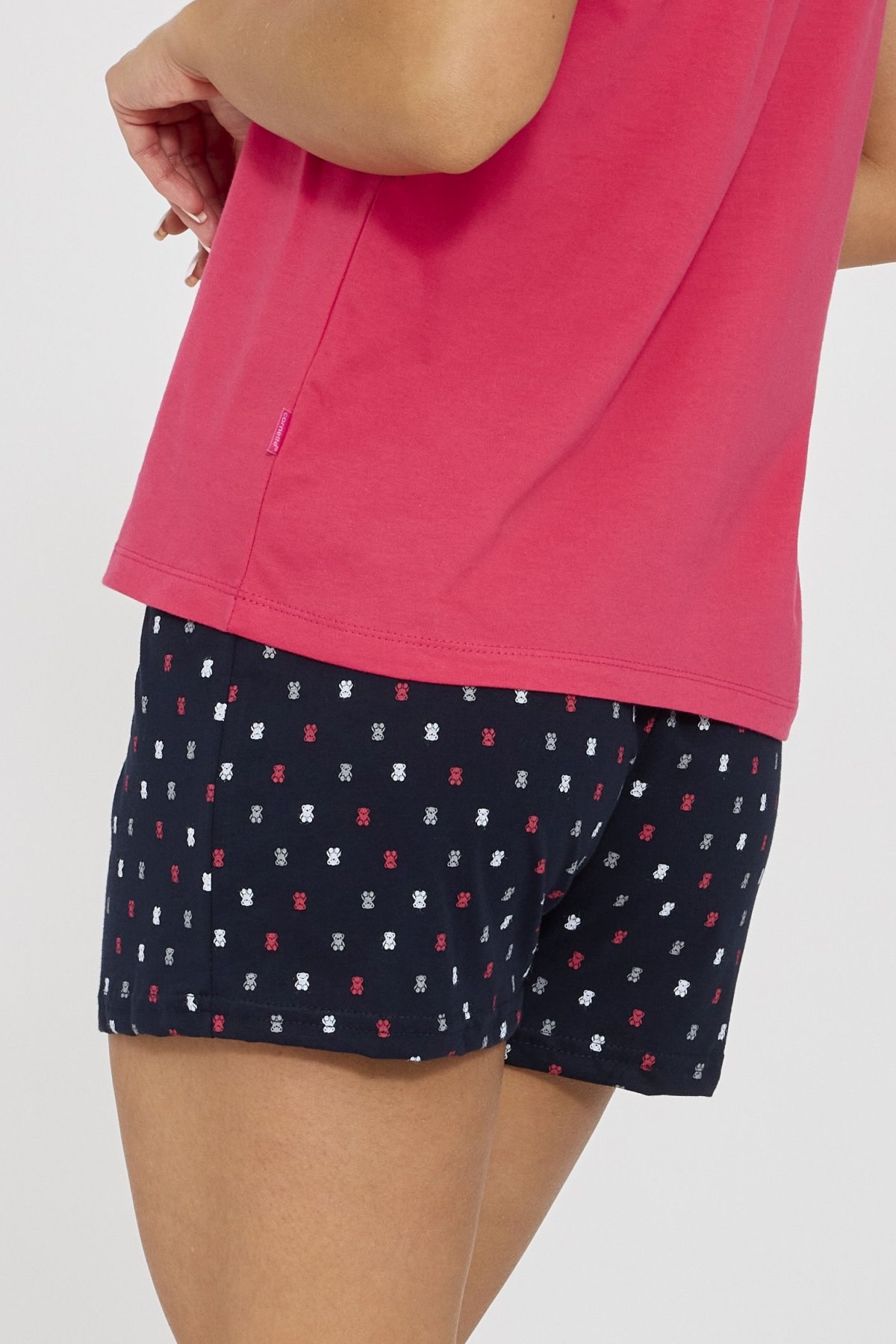 Rozkošné a pohodlné – takové je dámské pyžamo Gummy Queen, které rozzáří každý večer. Růžové tričko s veselým potiskem medvídka působí hravě a dodává outfitu nádech dívčí energie. K tomu ladí krátké šortky s originálním vzorem, které zaručují pohodlí při spánku i domácím odpočinku. Měkká bavlněná látka je příjemná na dotek a prodyšná, díky čemuž se budete cítit uvolněně po celou noc. Pyžamo je ideálním tipem na dárek pro ženy, které mají rády humor, barvy a styl.