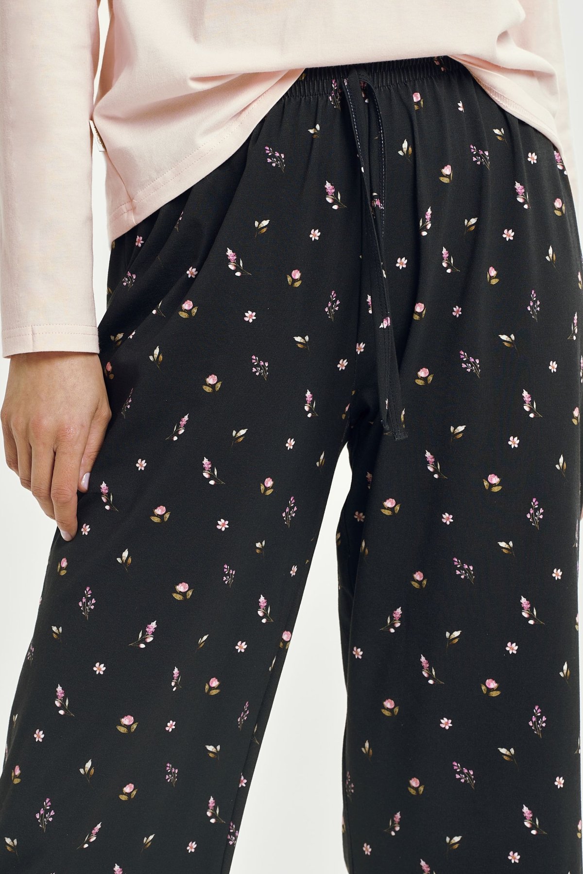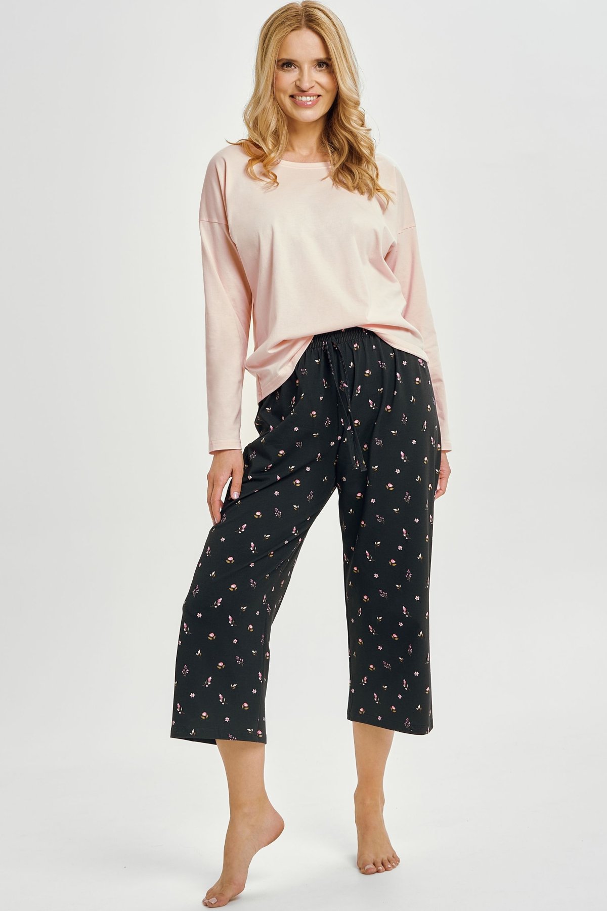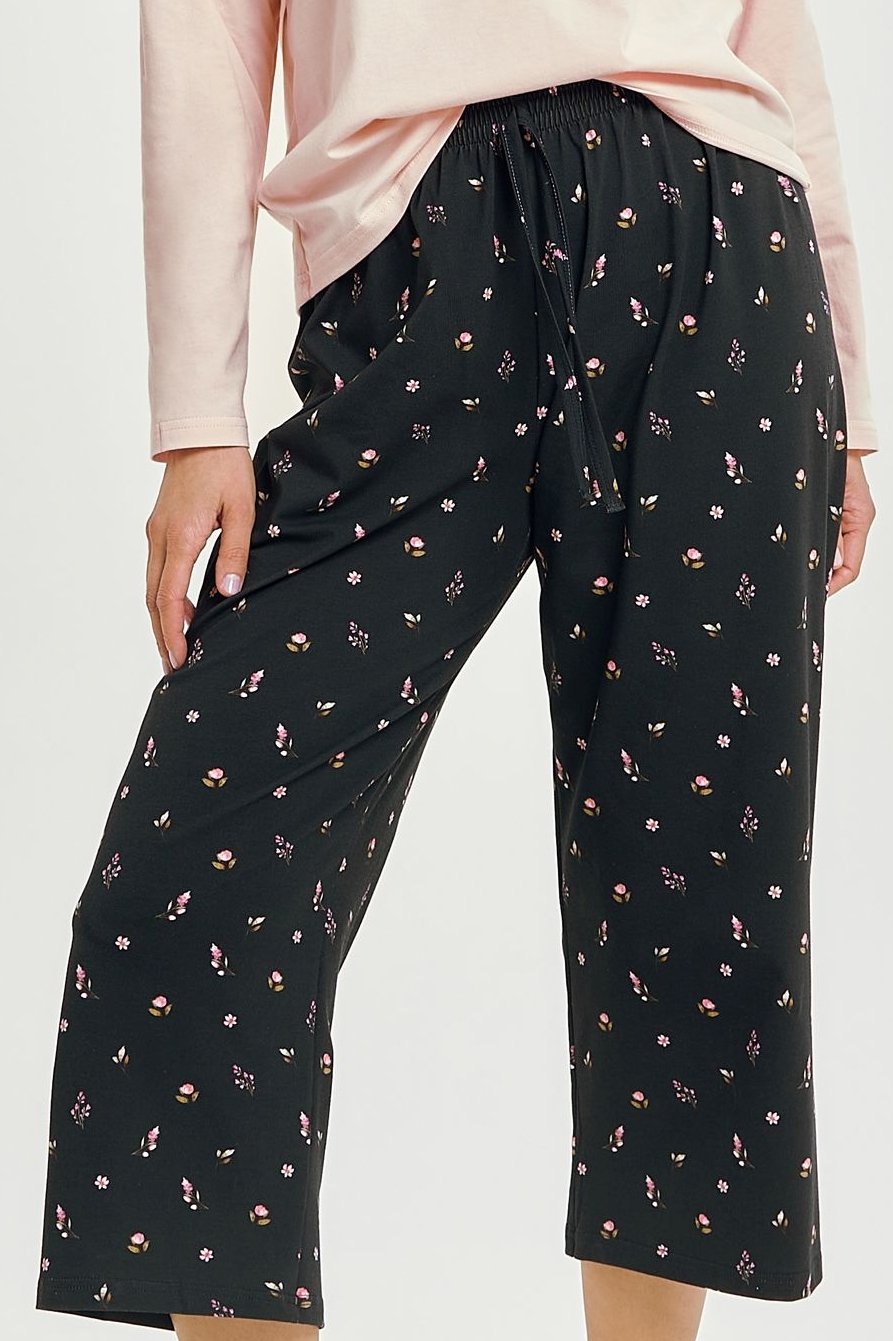 Dámské pyžamo Irene spojuje komfort, jemnost a ženský půvab. Horní díl s dlouhým rukávem a kulatým výstřihem má čistý, elegantní vzhled, zatímco vzorované kalhoty ve 3/4 délce dodávají celku hravý, moderní charakter.