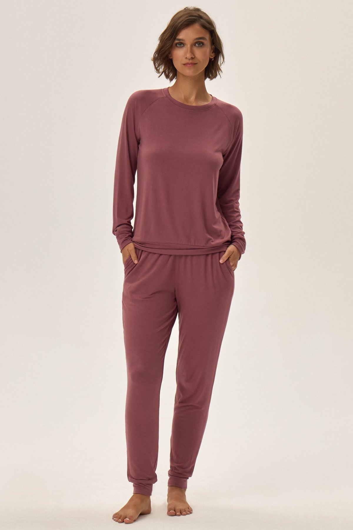 Dámské pyžamo Jill vyniká jemností, pohodlím a elegantní jednoduchostí. Vyrobené z měkké viskózy, která je prodyšná, pružná a příjemná na dotek, zaručuje maximální komfort po celou noc. Horní díl s dlouhým rukávem a dolní lem zakončený pružným žebrováním perfektně drží tvar, stejně jako kalhoty s manžetami na nohavicích, které se během spánku nevyhrnují. Stylový šedý nebo fialovo-růžový odstín působí žensky a moderně, takže se v něm budete cítit pohodlně i krásně zároveň. Pyžamo Jill je ideální pro klidné večery i pomalá rána plná pohody.